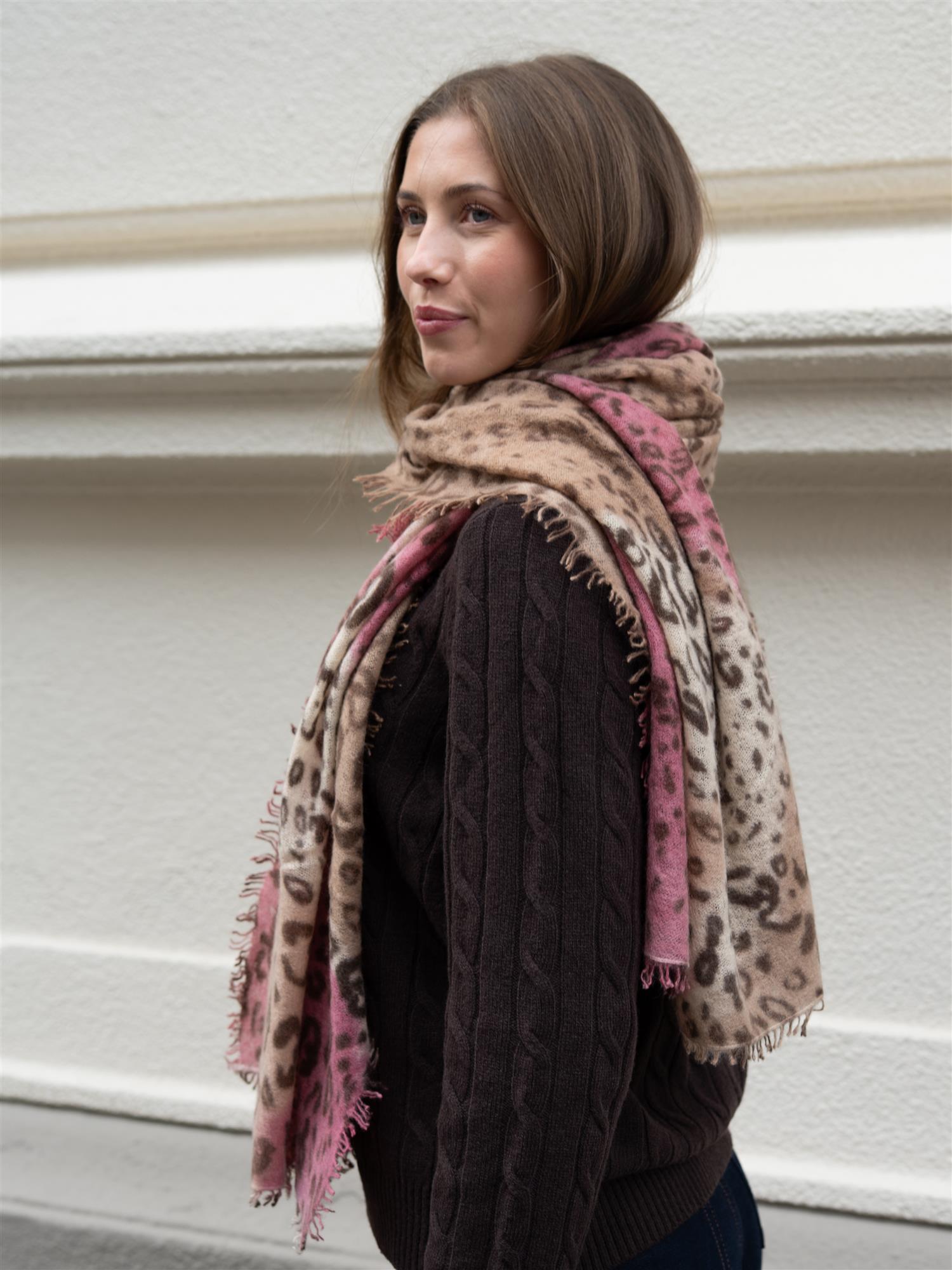 Tidløs vill eleganse fra Mala Alisha. Dyreprint redefinert i brune, beige og rosa toner. Lizard-kasjmirskjerfet gir en moderne vri til klassisk leopardprint.