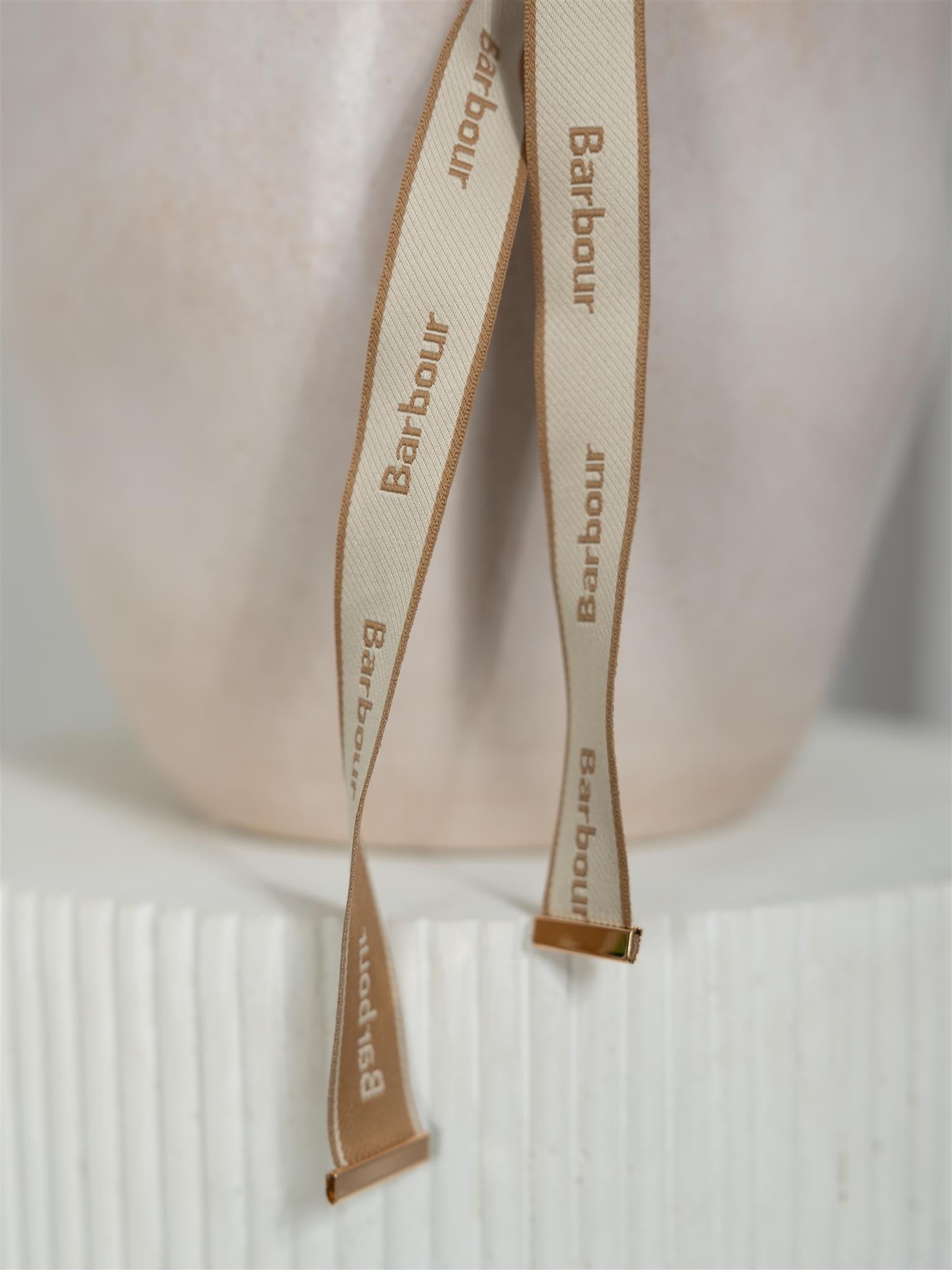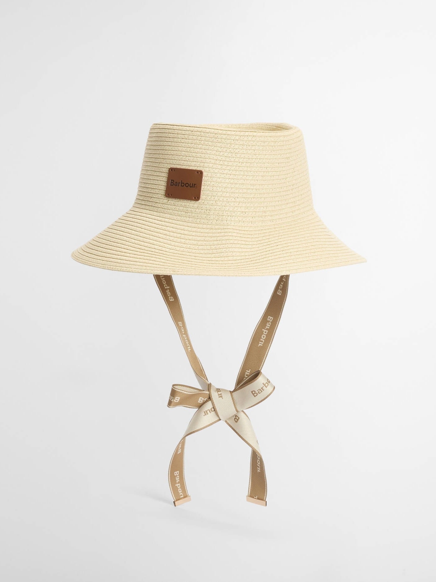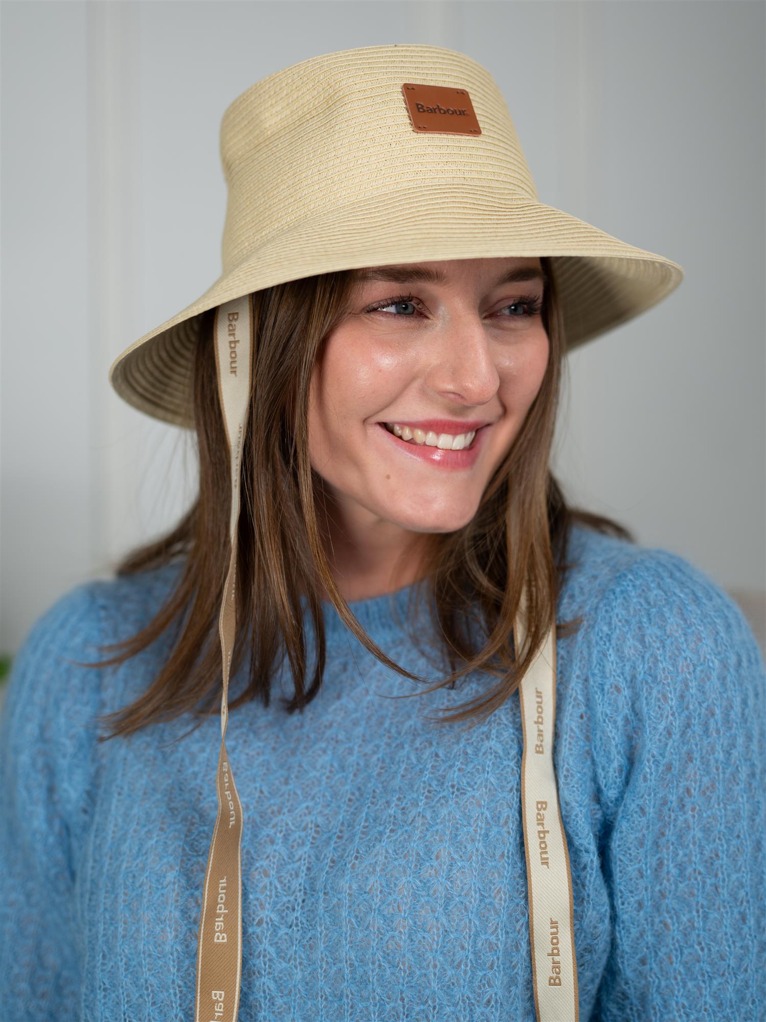 Polly er laget av flettet materiale og har Barbour-logo-jacquardstropper med metallklemmer for knyting. Den har en solbeskyttelsesgrad på +40 og er designet med innvendig Barbour-logo-tape for et karakteristisk, arvspreg.