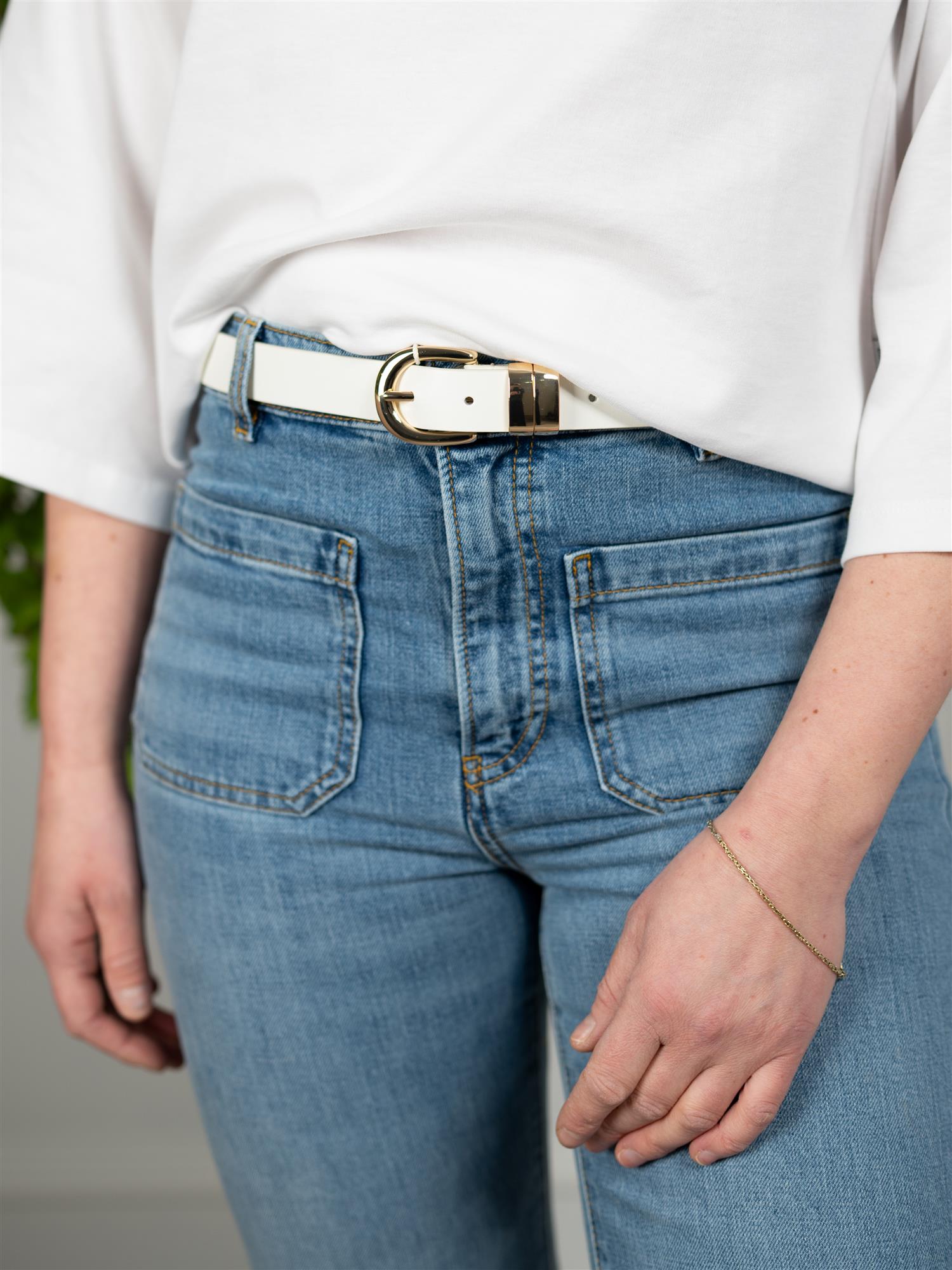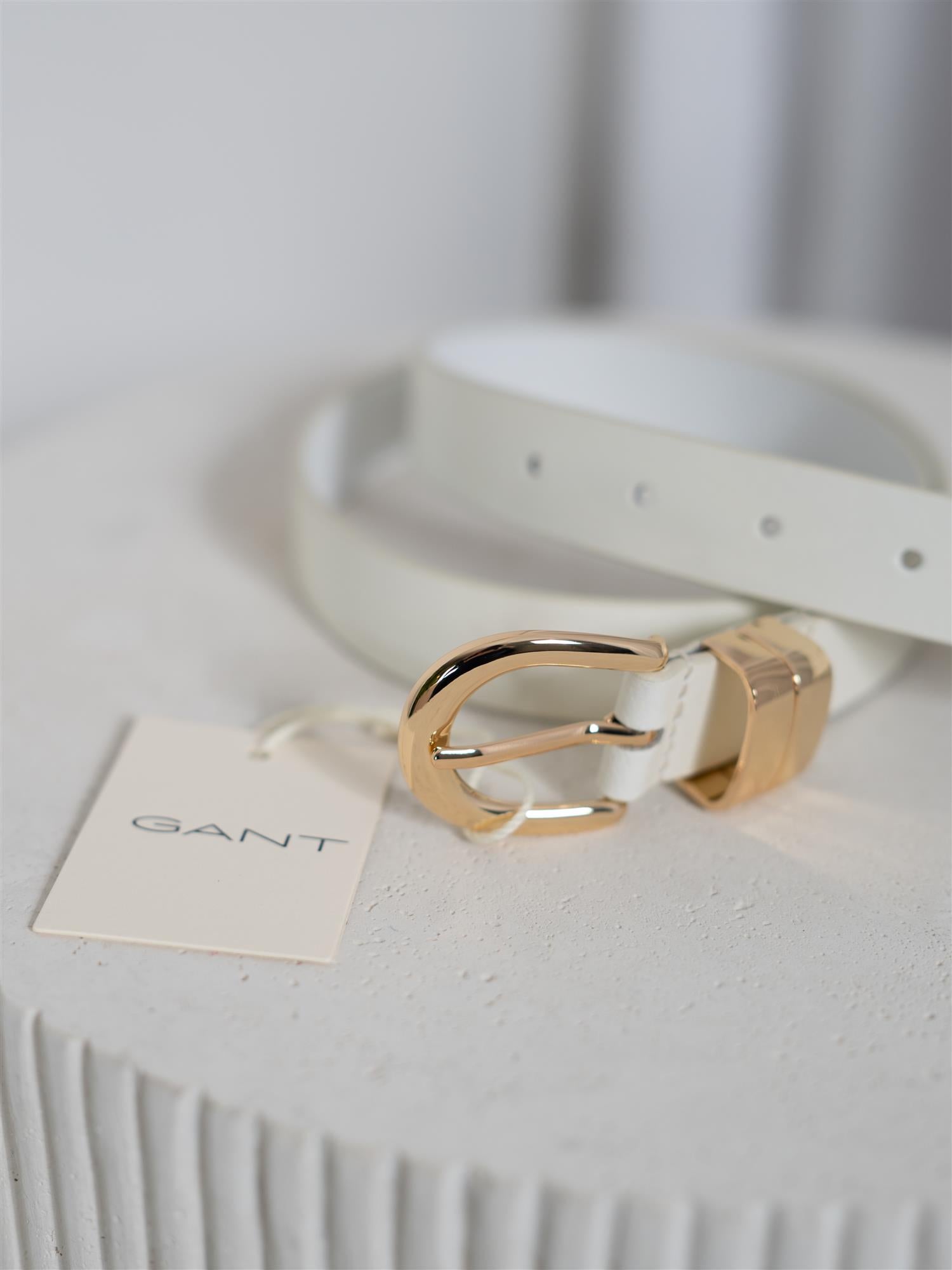 Dette skinnbeltet i kremfarget fra GANT er laget i ekte lær og designet for et markant og moderne uttrykk. Beltet har en kraftig spenne med to tykke beltehemper i gullfarget metall, som gir et dristig og stilfullt preg. Den pregede GANT-logoen på beltetuppen tilfører en eksklusiv finish og understreker merkets kvalitet og design.