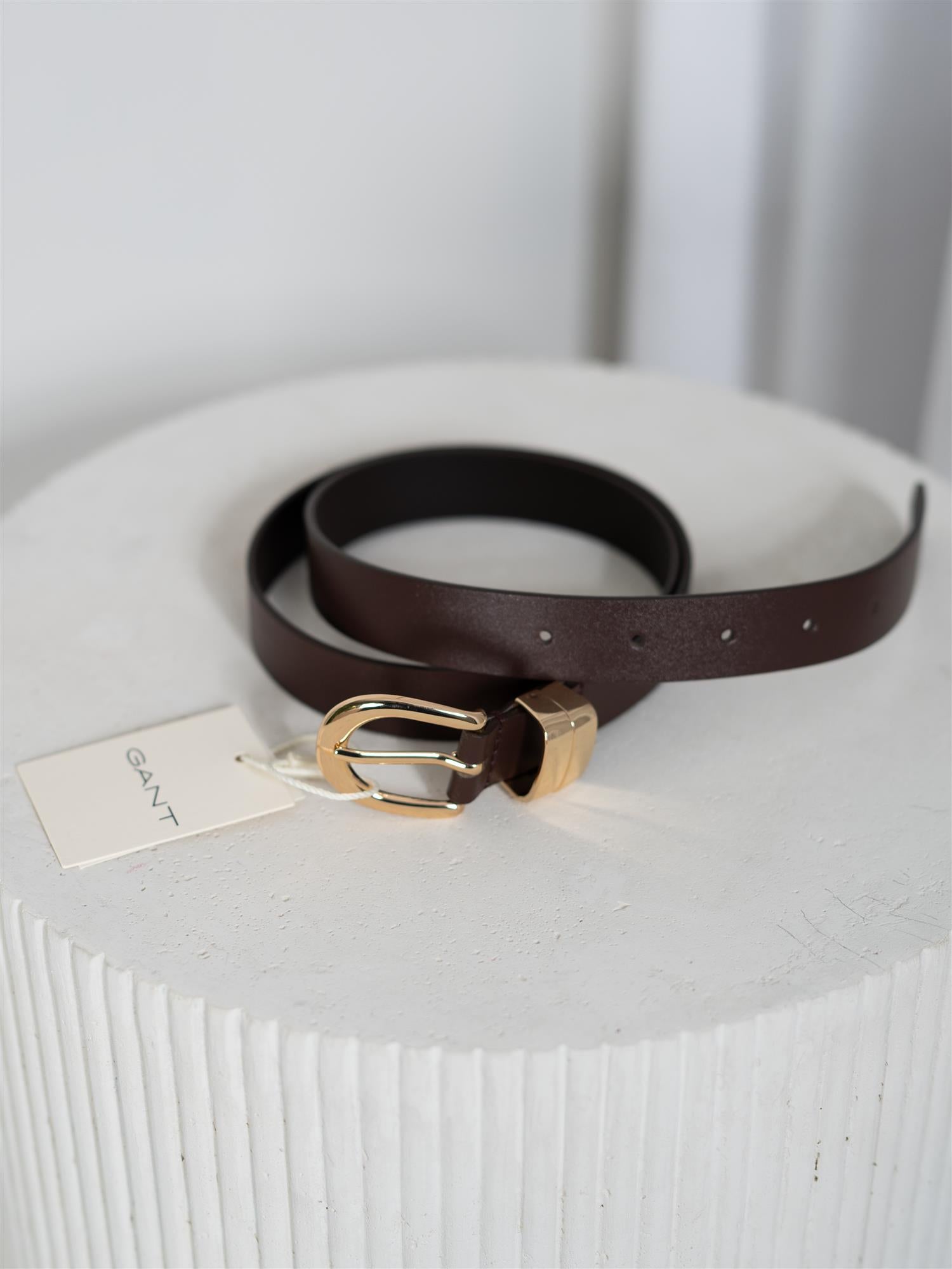 Dette brune skinnbeltet fra GANT er laget i ekte lær og designet for et markant og moderne uttrykk. Beltet har en kraftig spenne med to tykke beltehemper i gullfarget metall, som gir et dristig og stilfullt preg. Den pregede GANT-logoen på beltetuppen tilfører en eksklusiv finish og understreker merkets kvalitet og design.