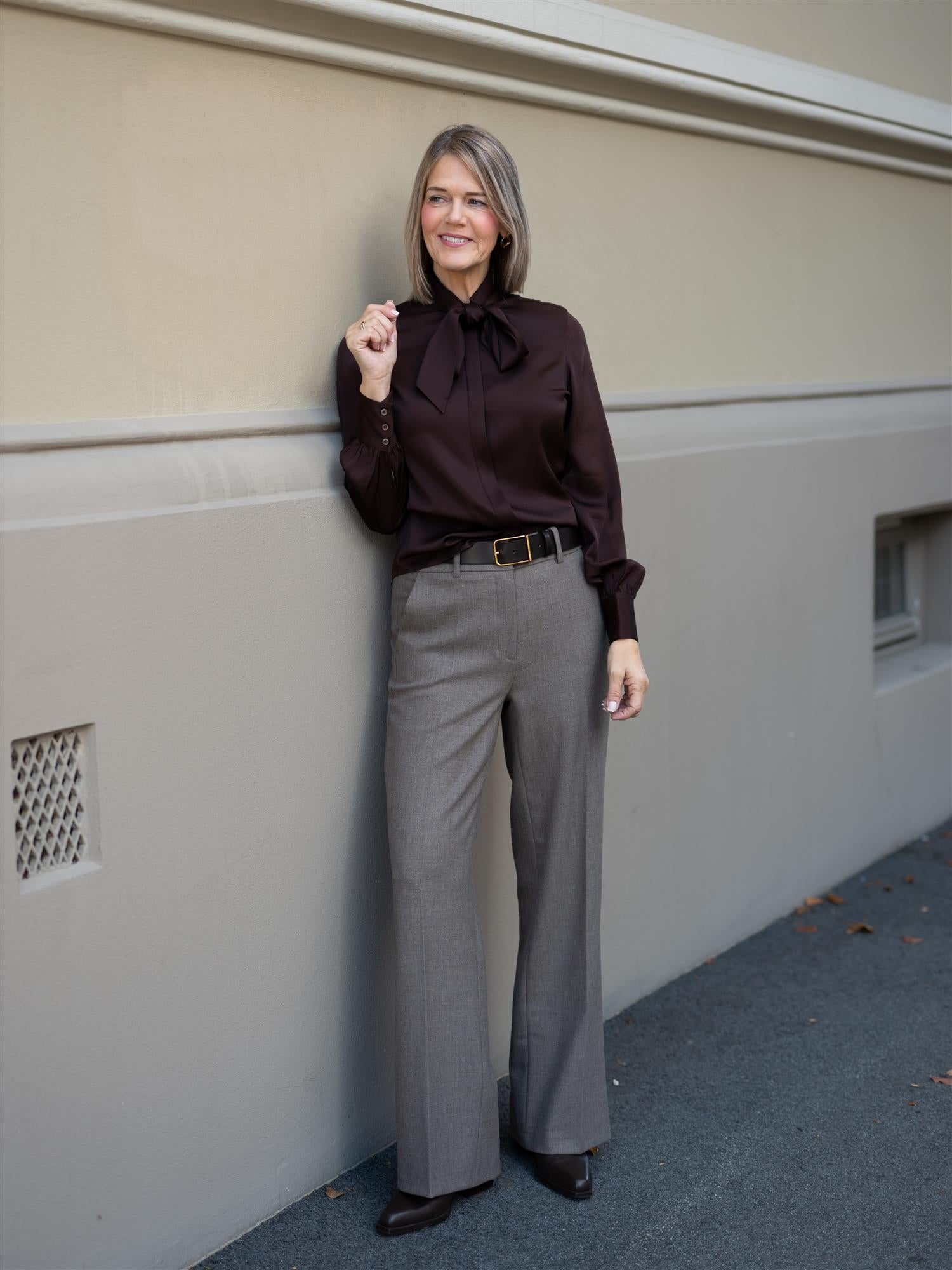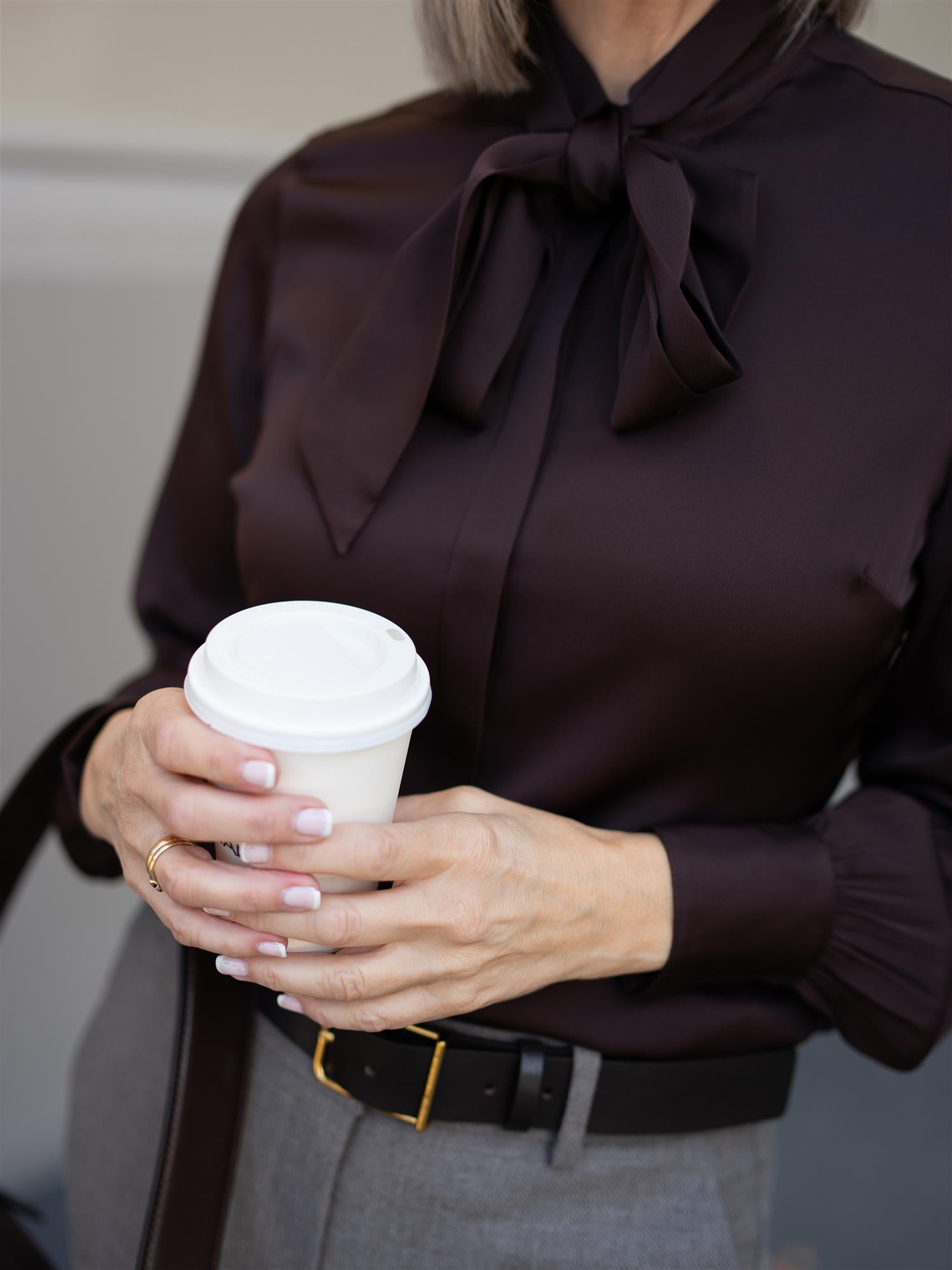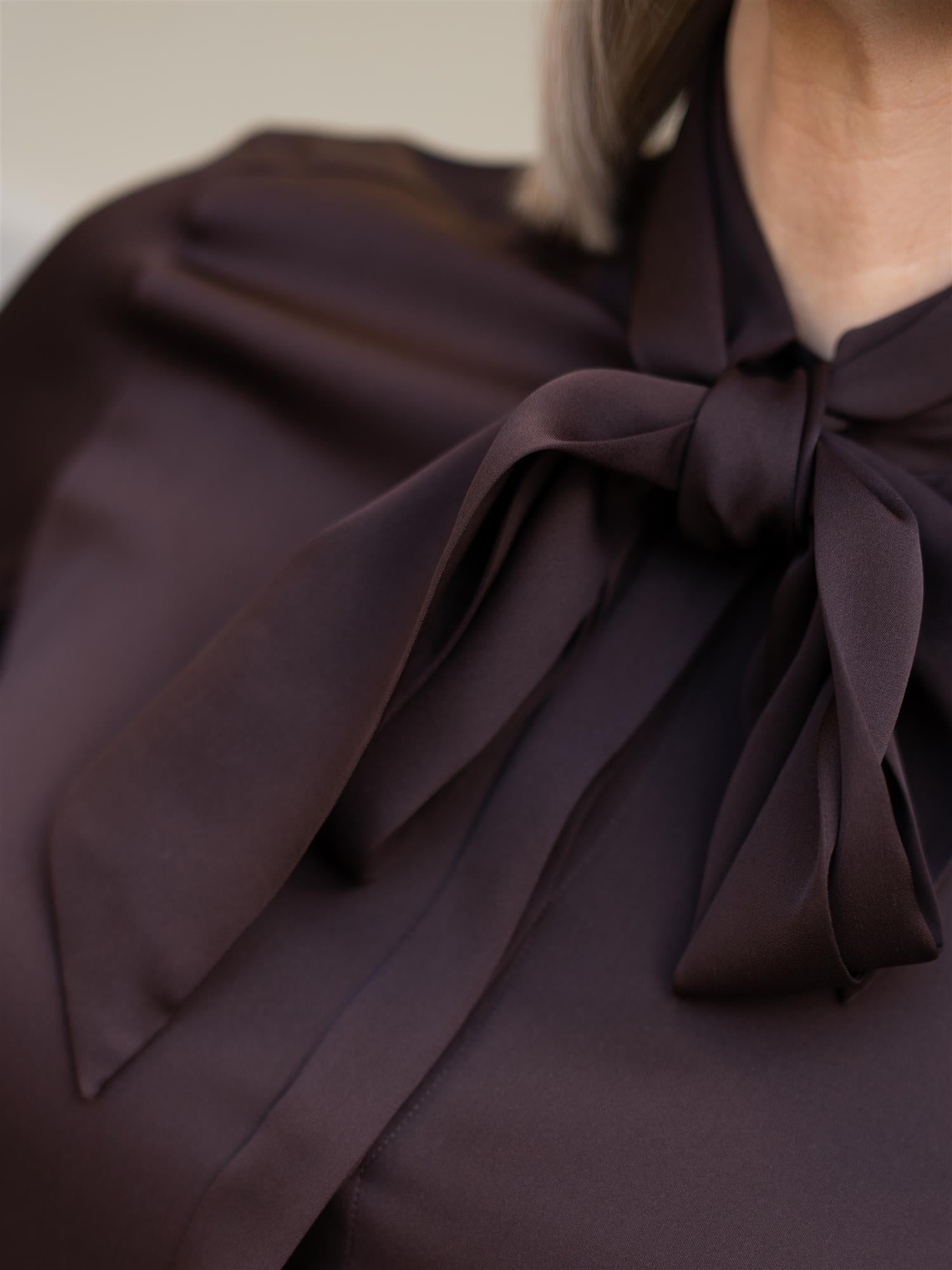 Fantastisk silkebluse i brun fra Stenströms. Blusen er elegant med delikat sløyfe i halsen og en feminin silhuett. Designet med en gylf foran som skjuler knappene og som gir en sømløs look. Selma har vide ermer som gir det lille ekstra. Noe stretch.