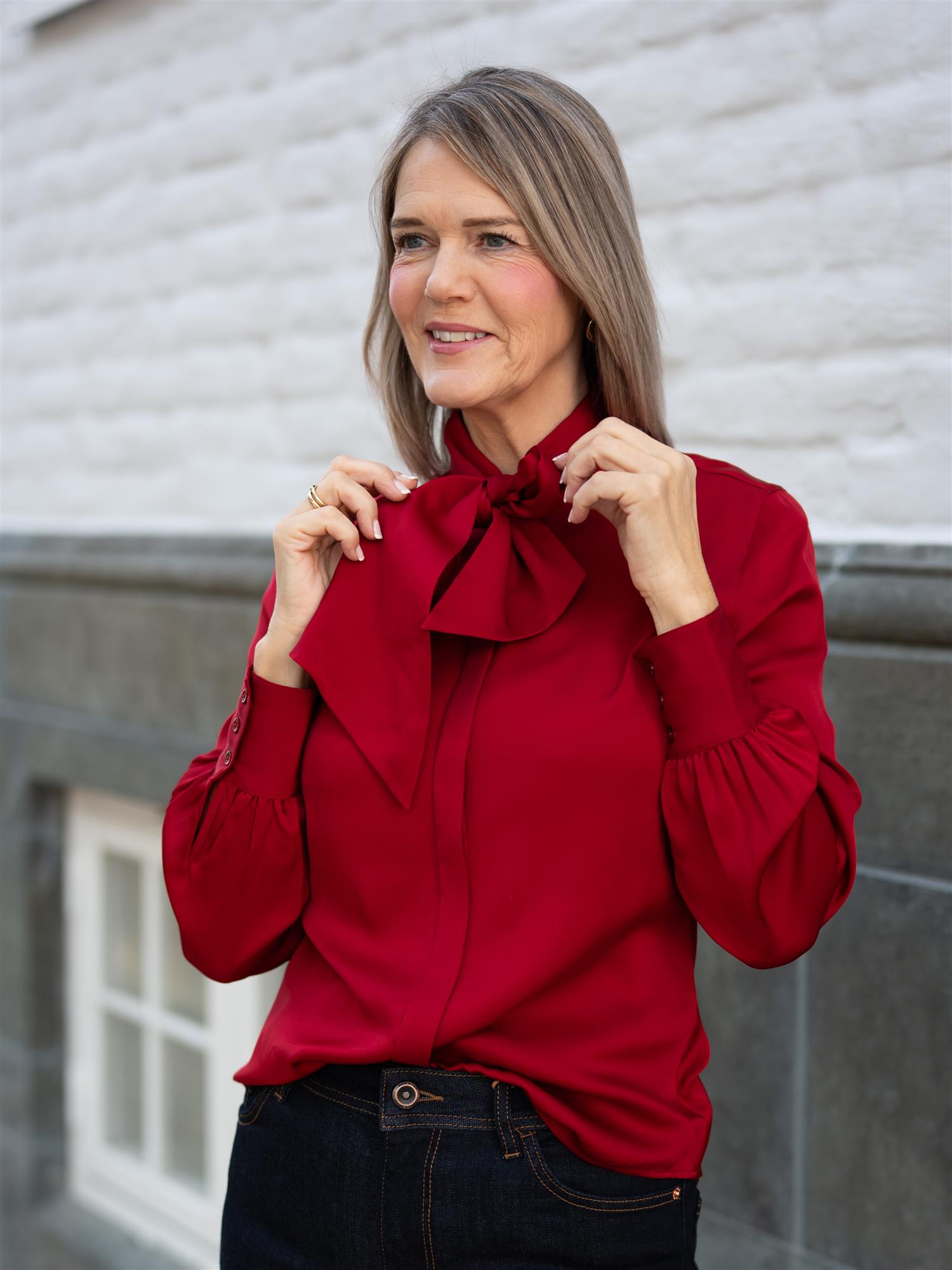 Fantastisk silkebluse i rød fra Stenströms. Blusen er elegant med delikat sløyfe i halsen og en feminin silhuett. Designet med en gylf foran som skjuler knappene og som gir en sømløs look. Selma har vide ermer som gir det lille ekstra. Noe stretch.