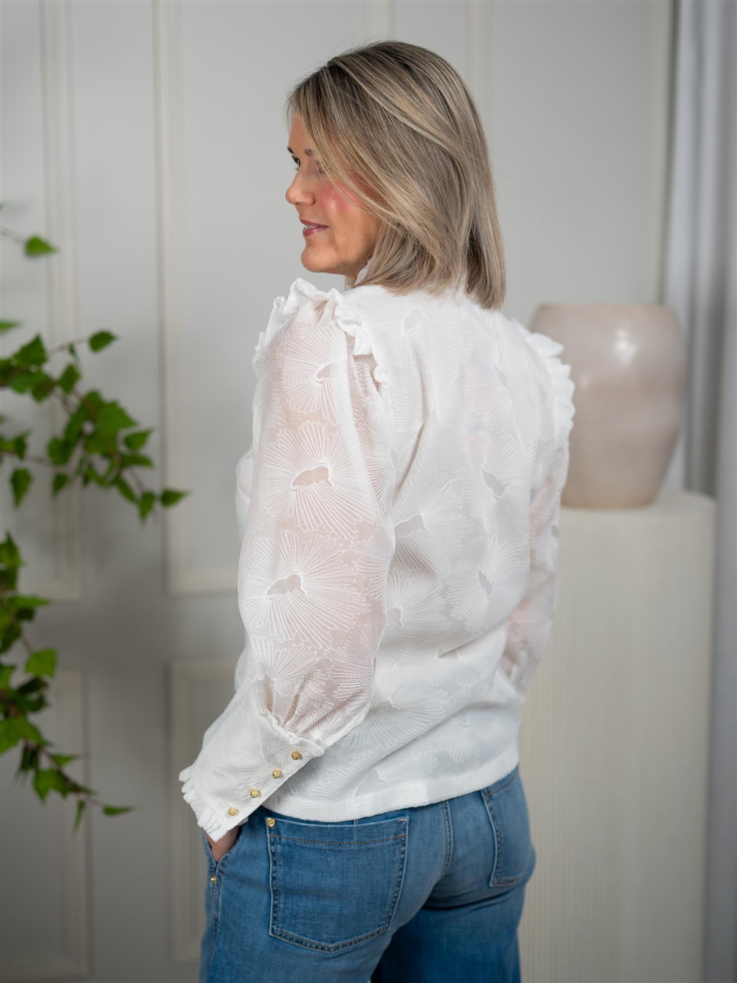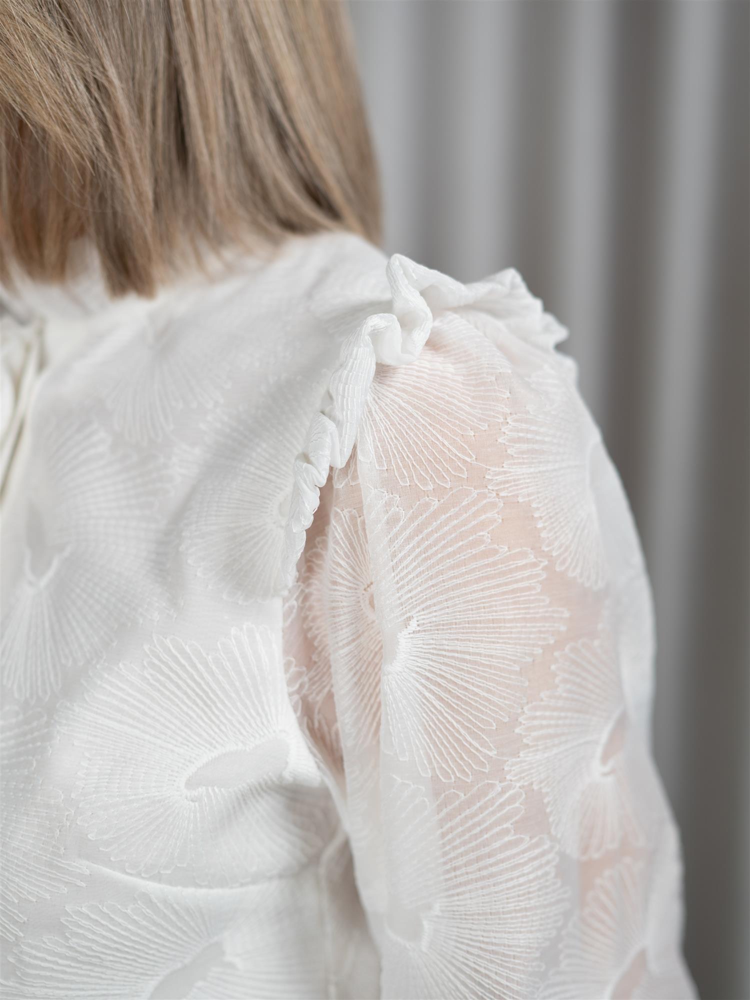 Flotte volanger i krage, skuldre, langs knapper og i håndledd. Ermene lukkes med fire gulkledde knapper. Den er rett i modellen og har normal lengde.