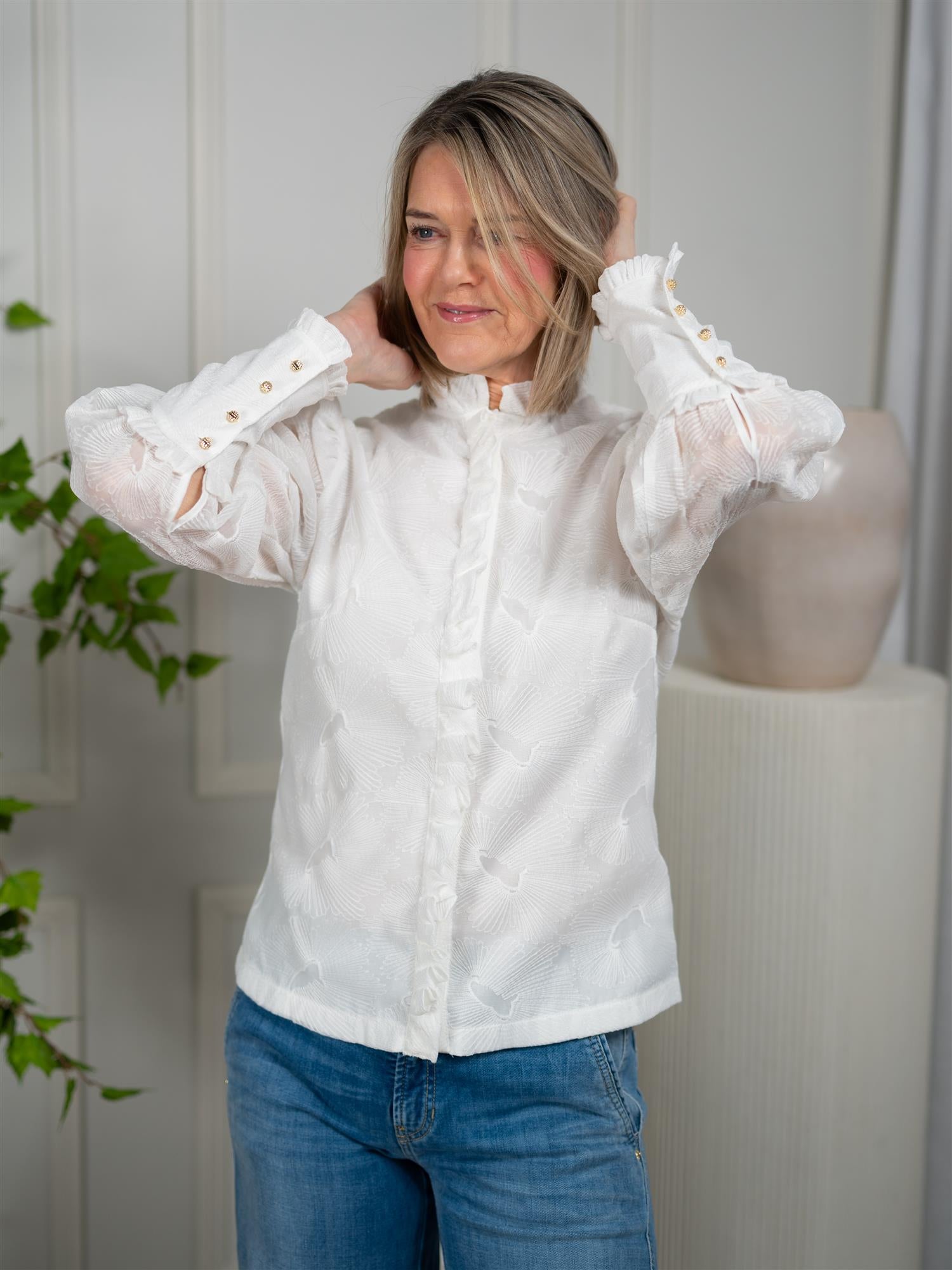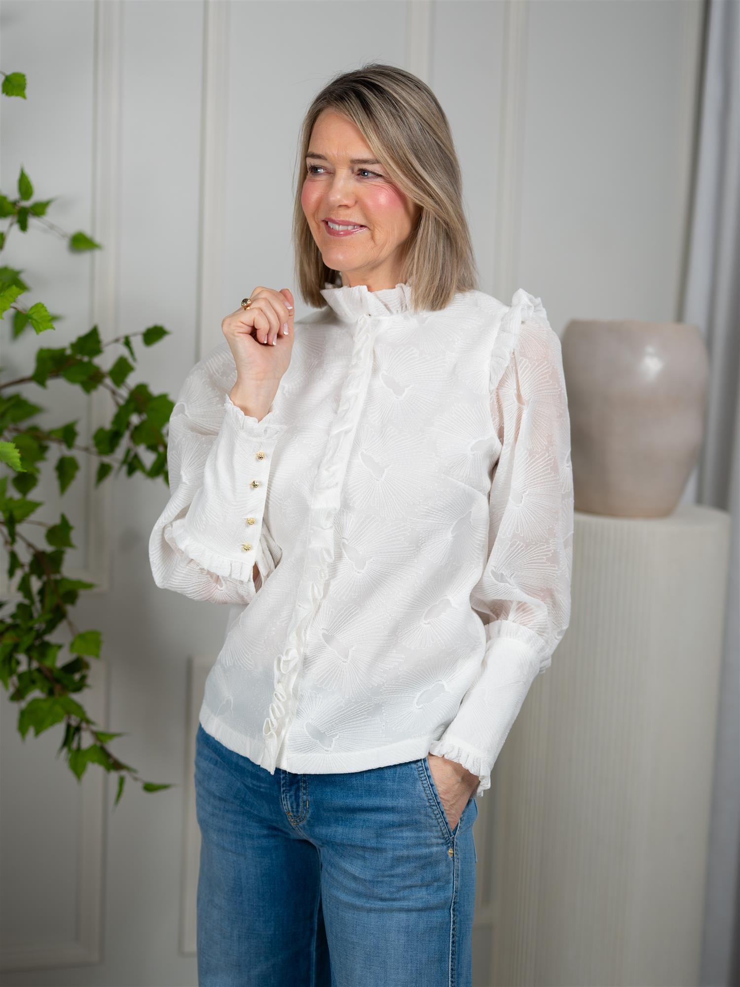 "Er ment for boblelunsj med venninner, når du vil kjenne en ekstra gnist og føle deg litt ekstra. Jeg sier meg enig i ordene til Wenche Foss: champagne er alltid en sikker vinner, og for de store øyeblikkene i livet. Med denne blusen håper jeg du opplever akkurat noen av livets fineste øyeblikk" - Janne Formoe