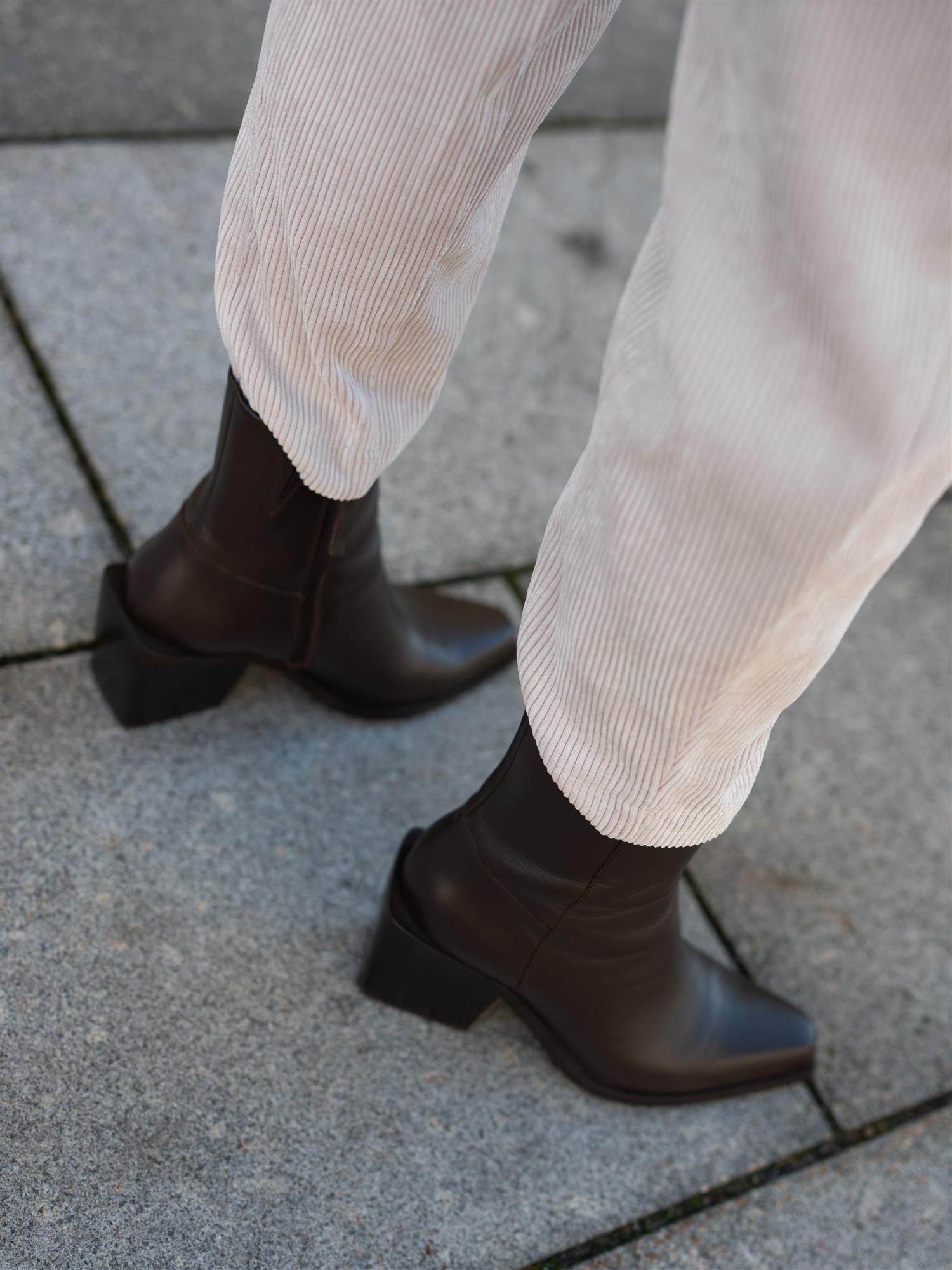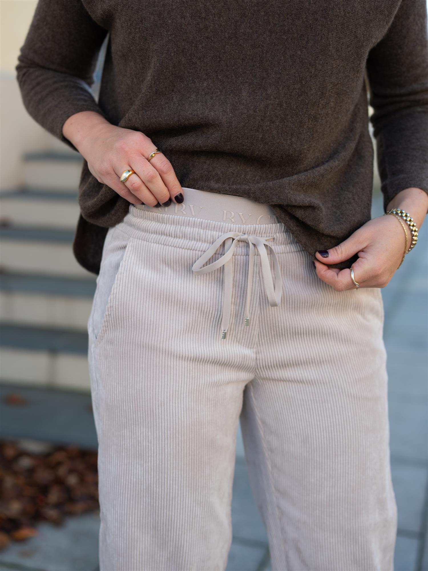 Tøff bukse i cordfløyel fra Cambio i beige. Buksen har ankel-lengde med en litt baggy passform. En lett ballongformet silhuett. Det er snøring i livet med elastisk kant i midjen som gir et røffere uttrykk. Stikklommer i sidene. Utrolig behagelig å ha på.