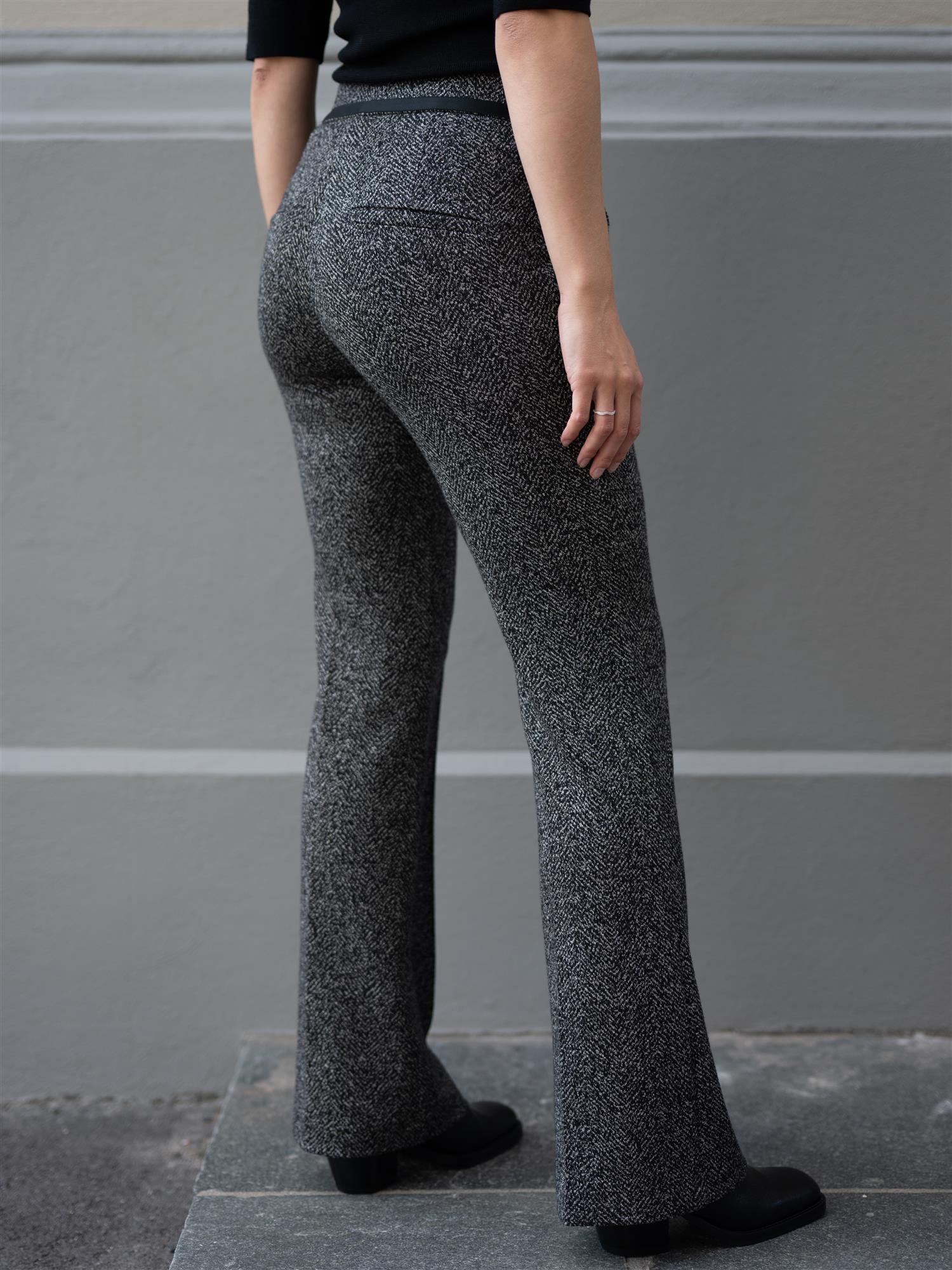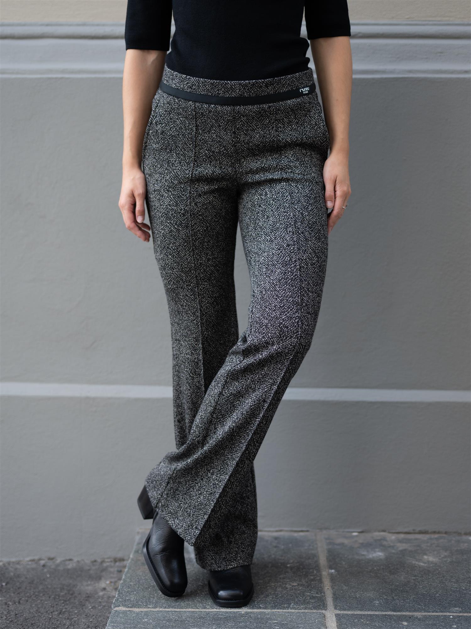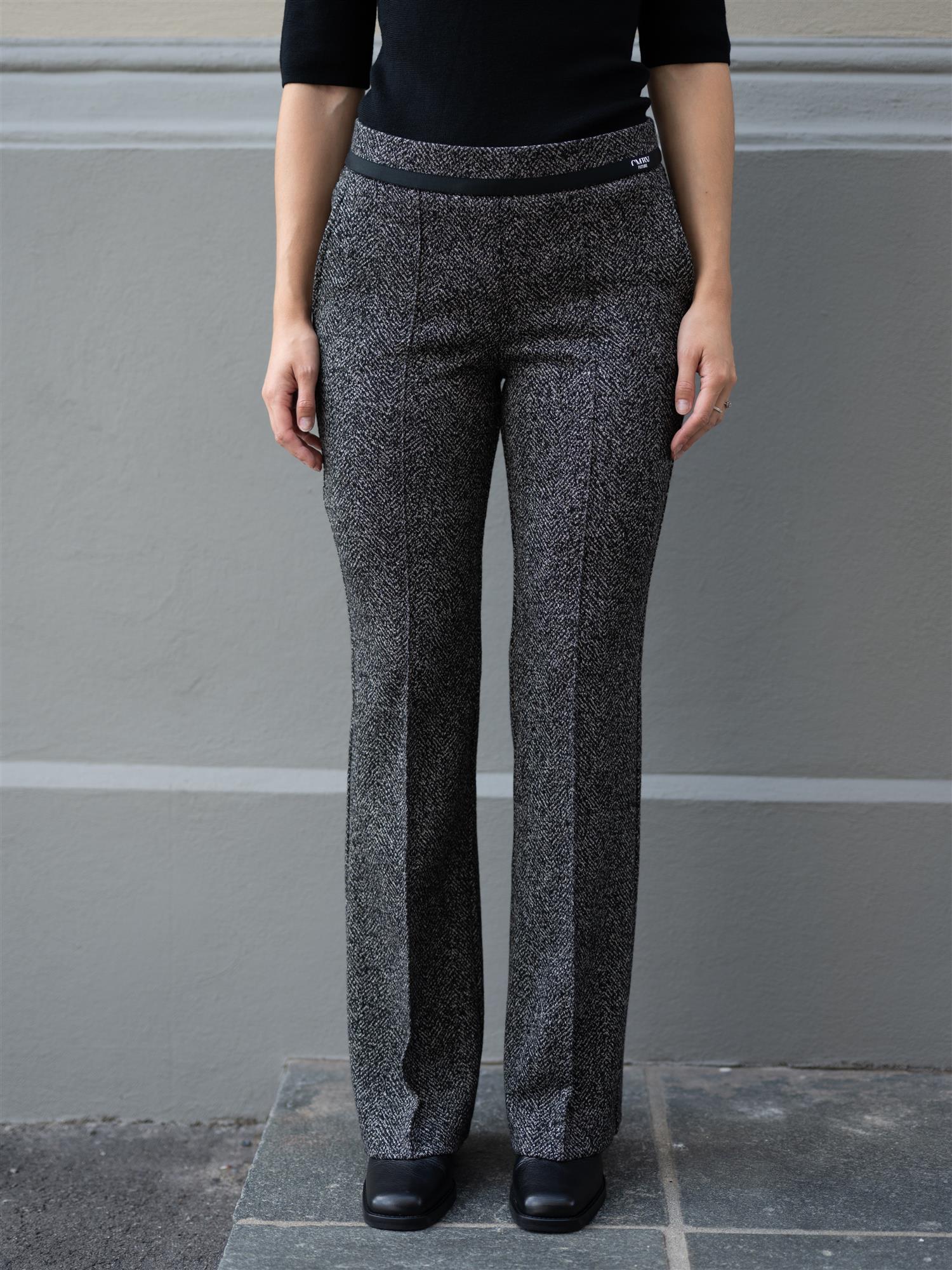 Stilige bukser fra Cambio i sort og hvit. Buksen har god stretch og strikk i livet. Imiterte lommer bak og stikklommer i sidene. Francoise er ettersittende rundt hofte og lår, og svinger ut fra kneet og ned. Buksen har en markert søm langs buksebeinet i front.
