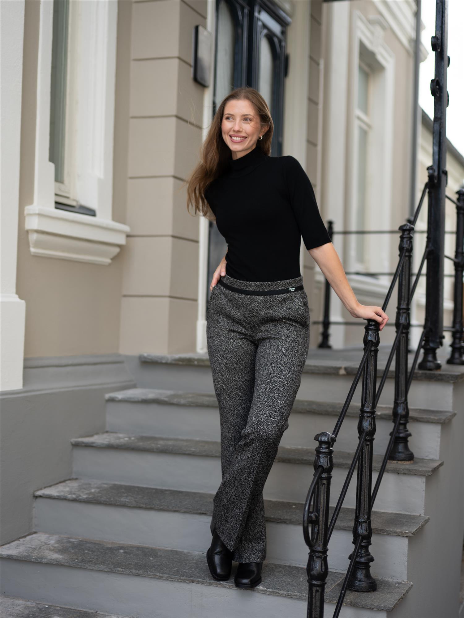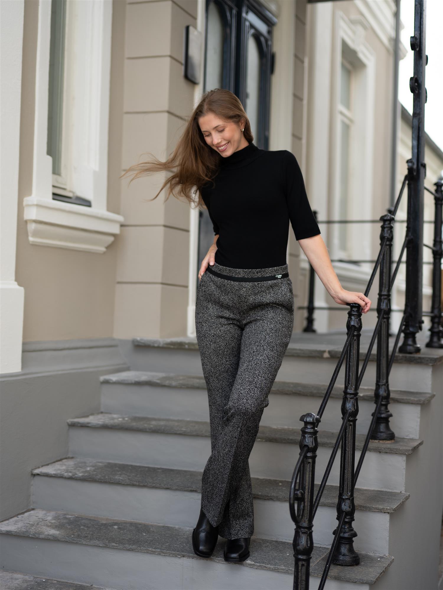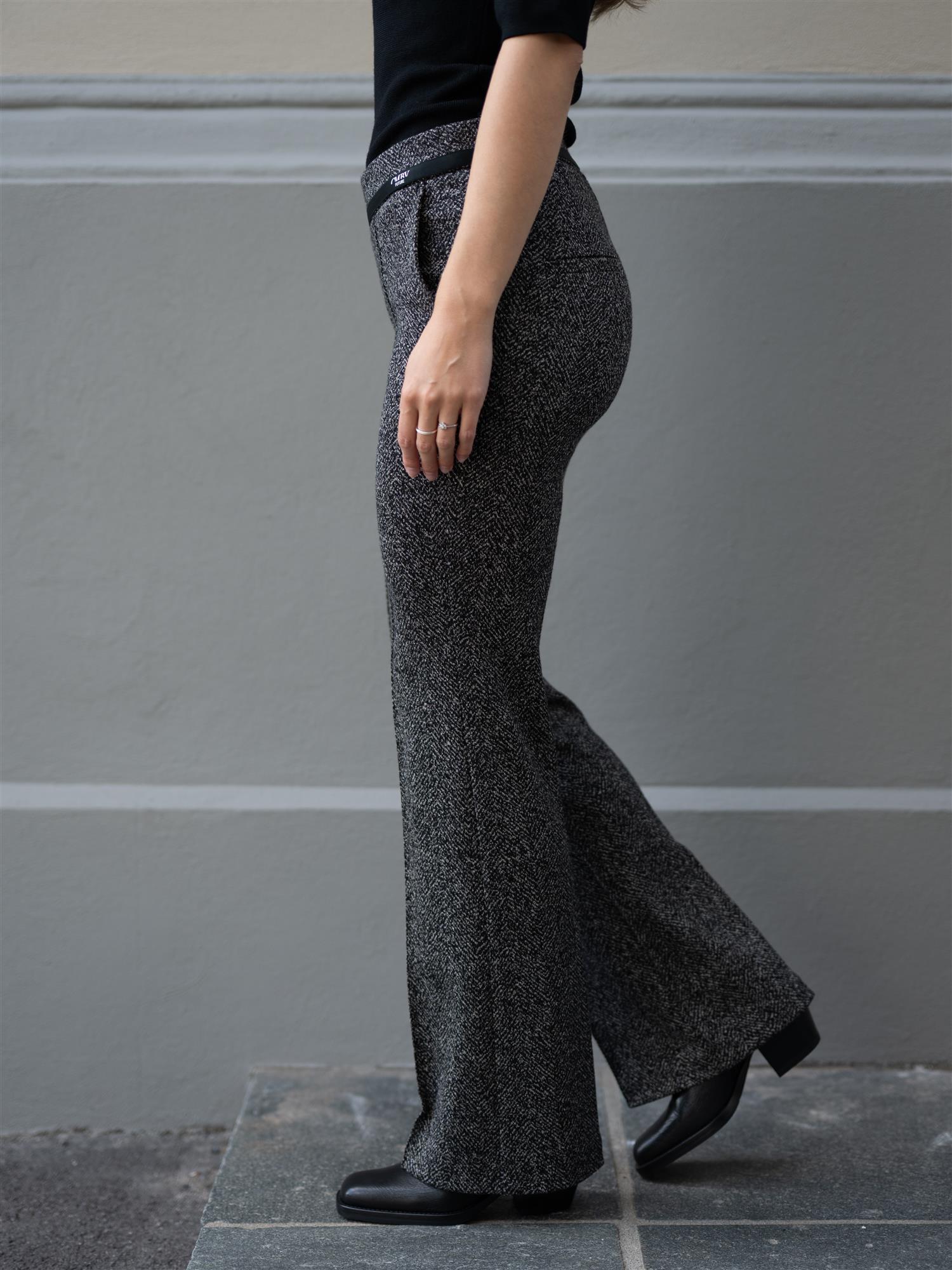 Stilige bukser fra Cambio i sort og hvit. Buksen har god stretch og strikk i livet. Imiterte lommer bak og stikklommer i sidene. Francoise er ettersittende rundt hofte og lår, og svinger ut fra kneet og ned. Buksen har en markert søm langs buksebeinet i front.