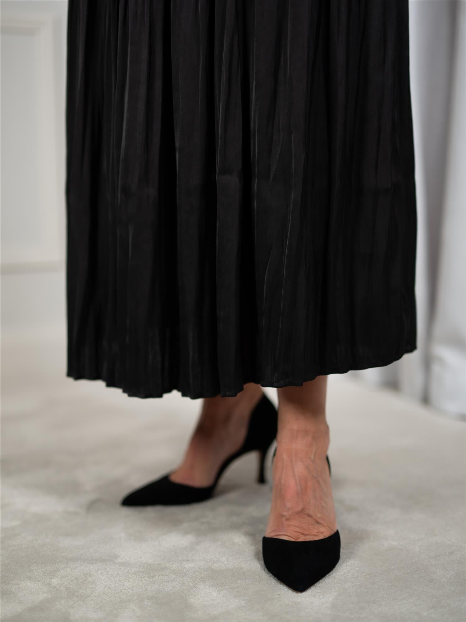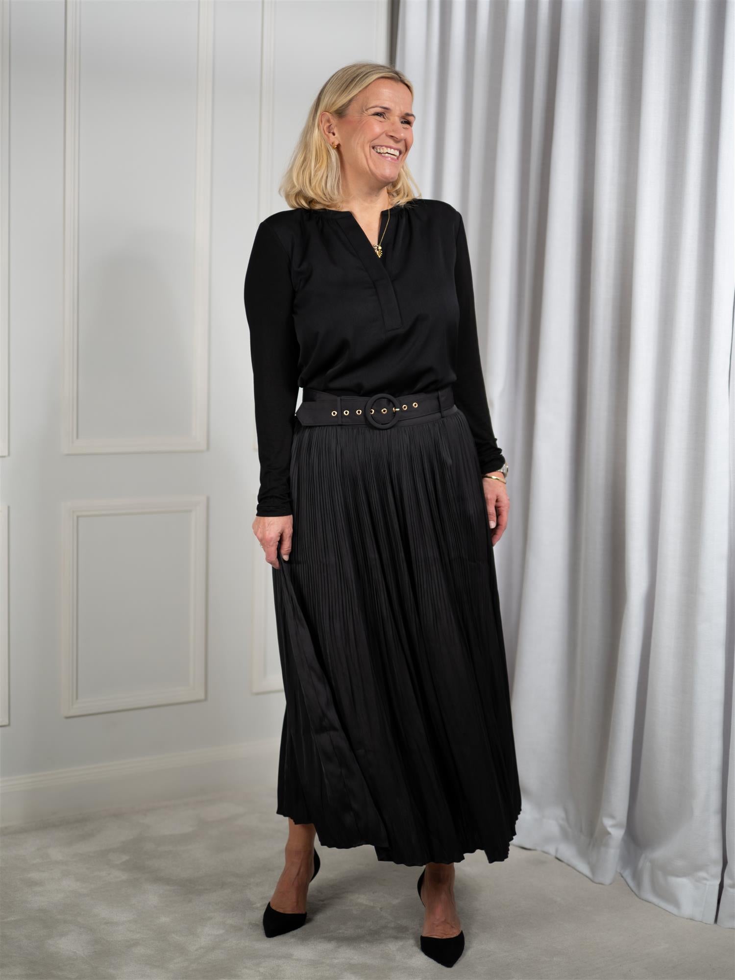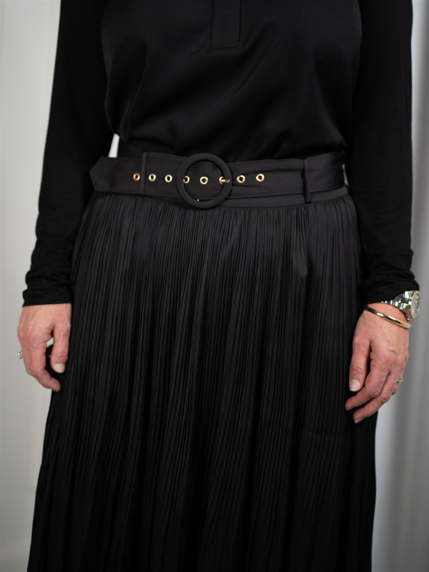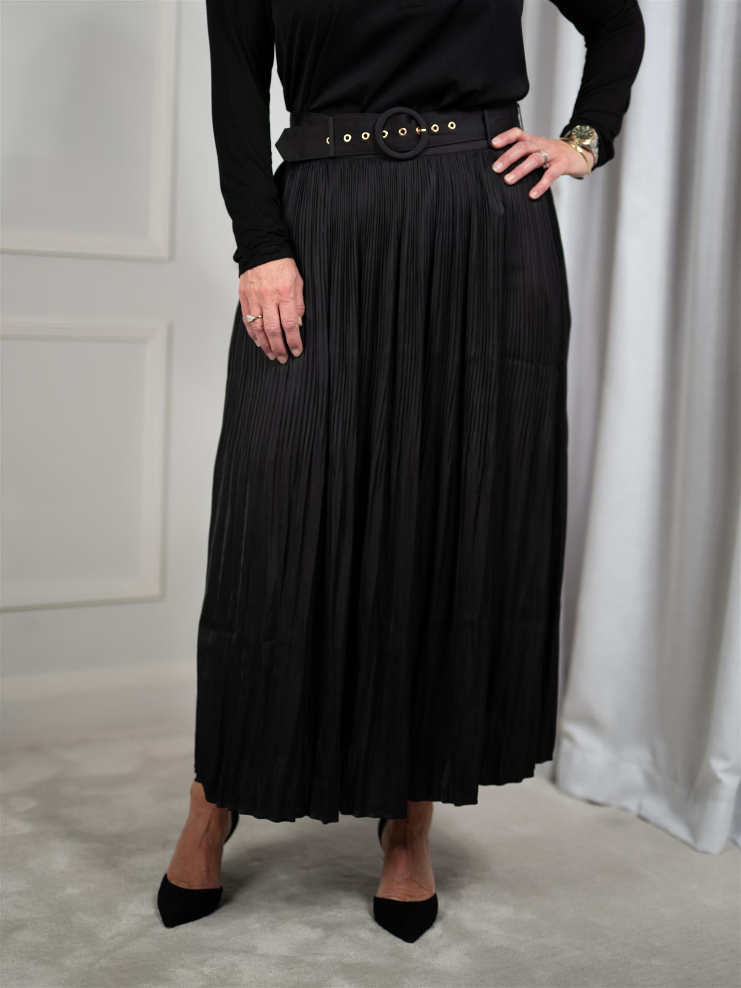 Rålekkert skjørt med god lengde fra Hale Bob i sort. Skjørtet har nydelig plissé, i tillegg til både strikk og belte i livet. Lukkes med usynlig glidelås bak.