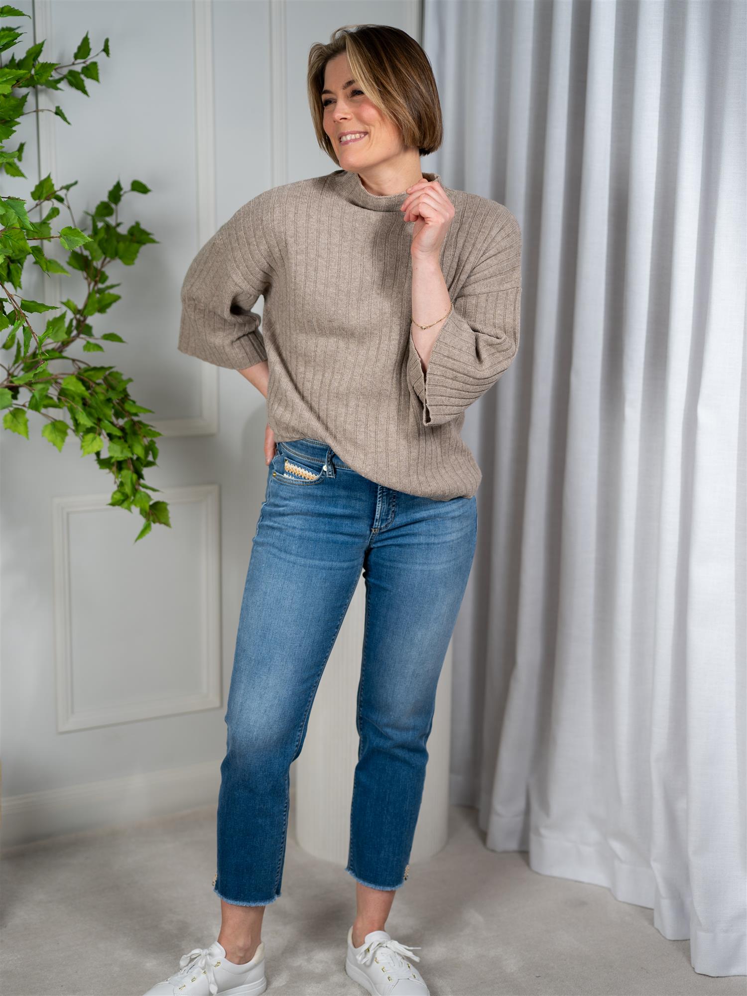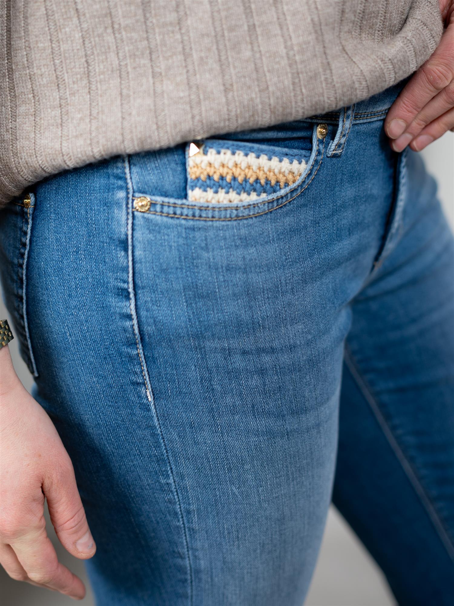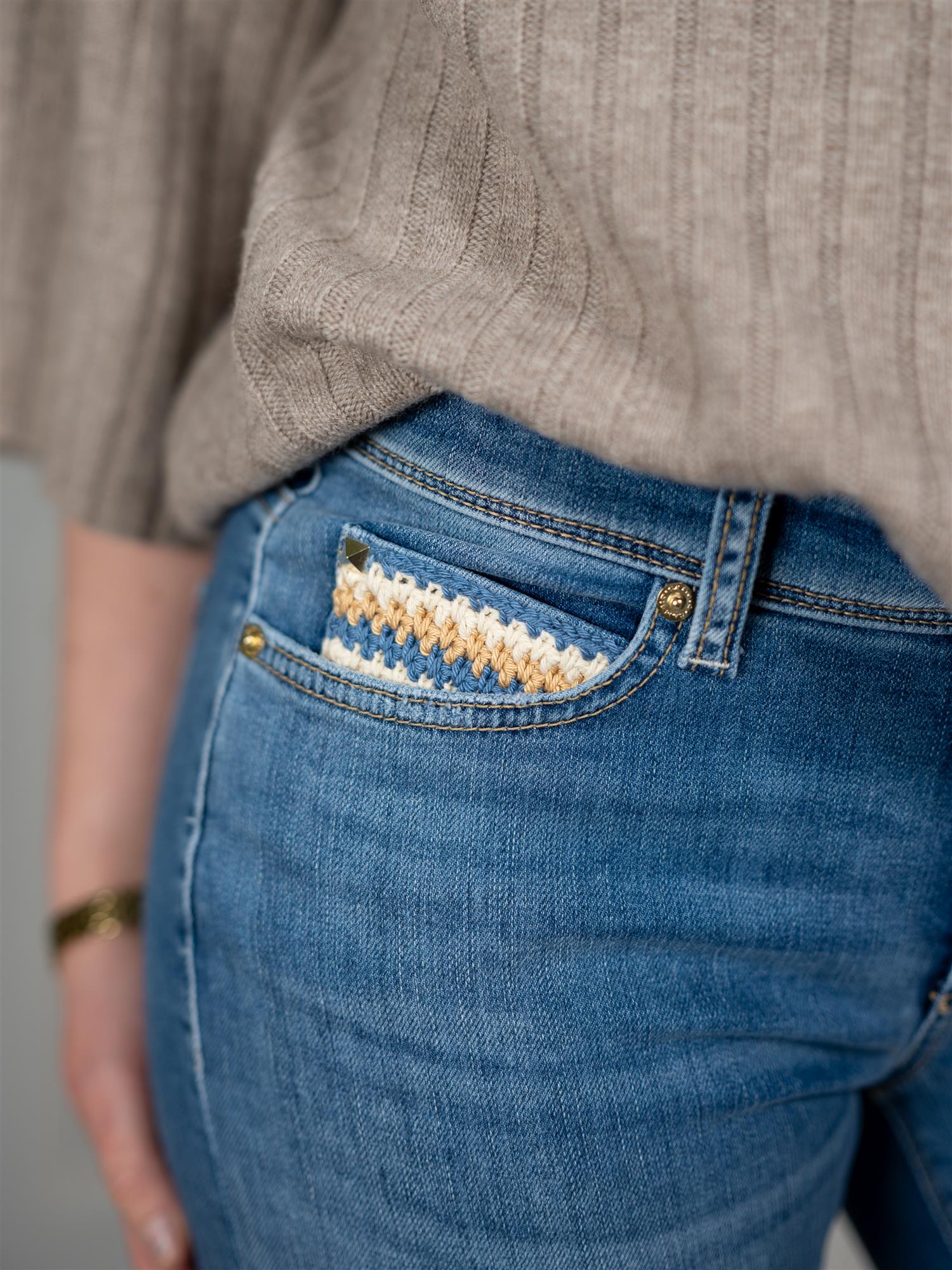 Piper short i en lys blå farge fra Cambio. Buksen er ankelkort, heklet detalj på lommen og har god stretch. Piper har en røff kant nederst med en liten splitt. Lommer både foran og bak. Buksen har normal høyde i livet.
