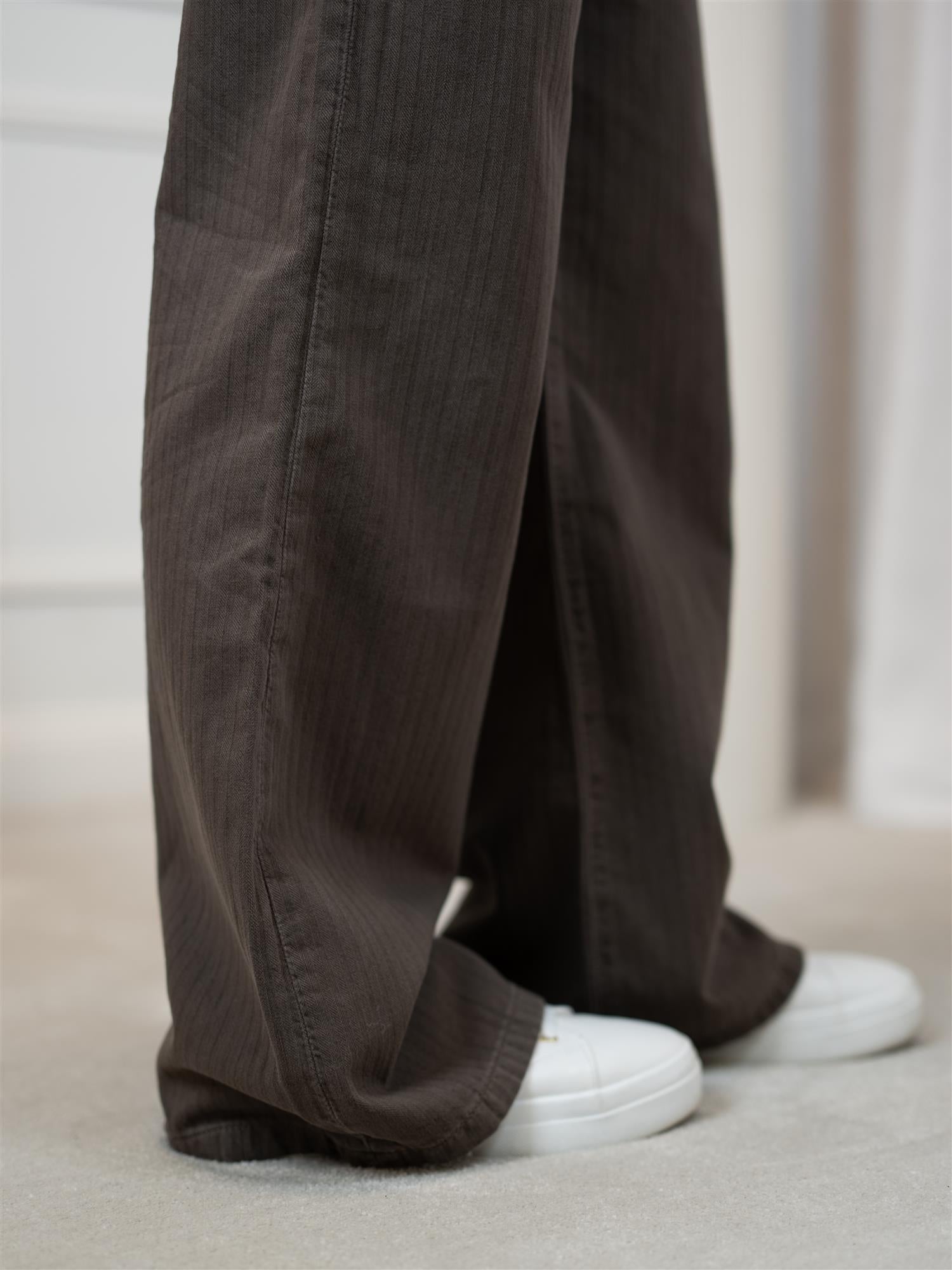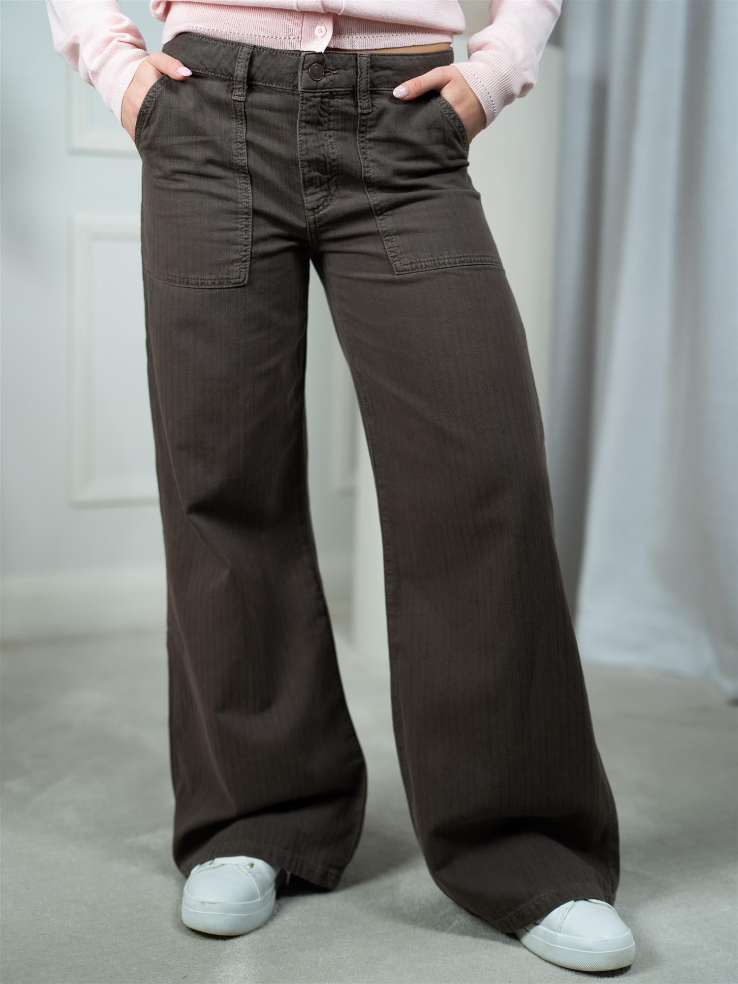 «Guell» er en snekkerinspirert, flare-passform med raffinerte arbeidsklærdetaljer. Den har lav midje, ekstra lange og løse ben, samt påsydde lommer foran og bak. Hemper for belte i midjen.