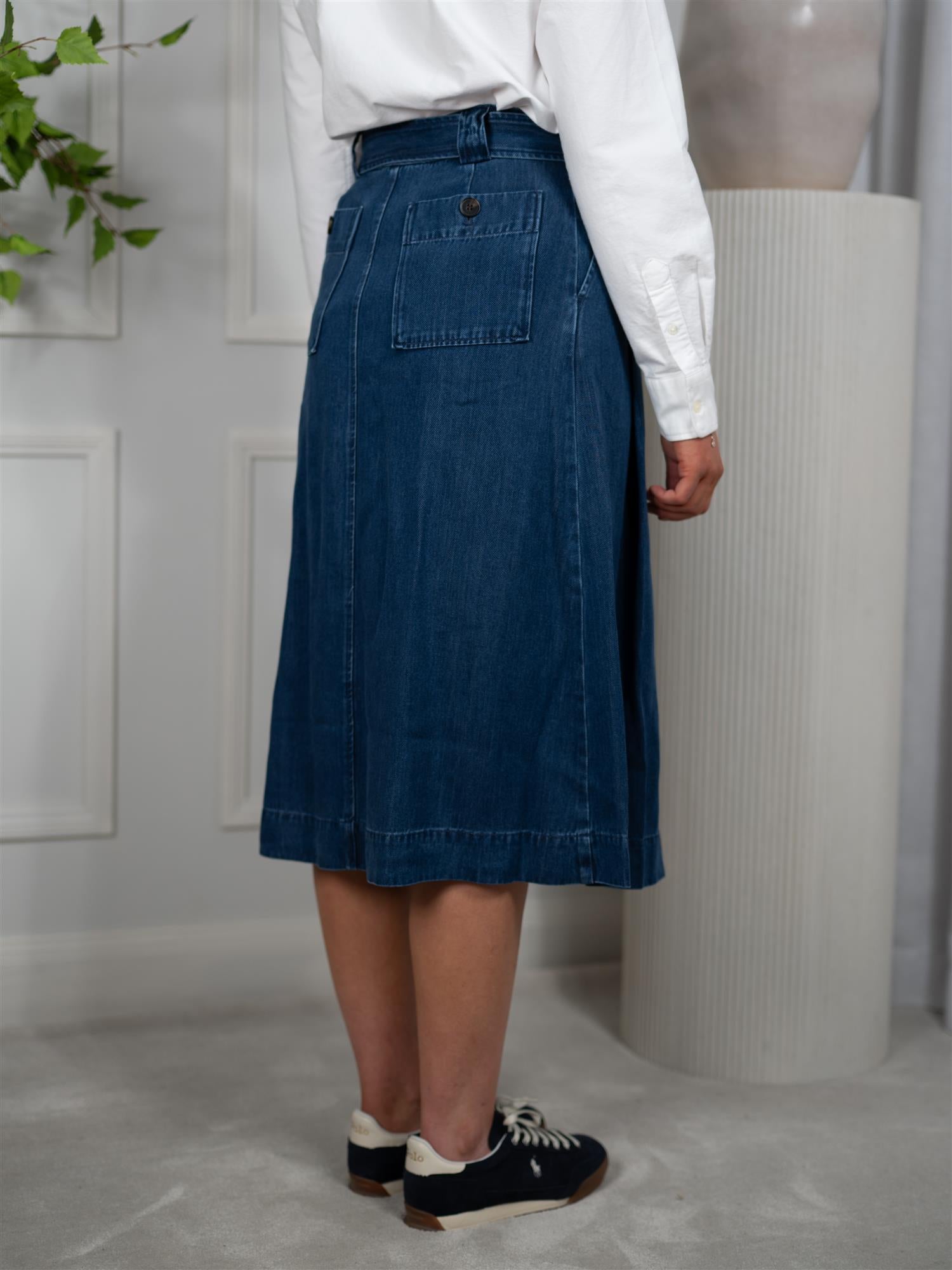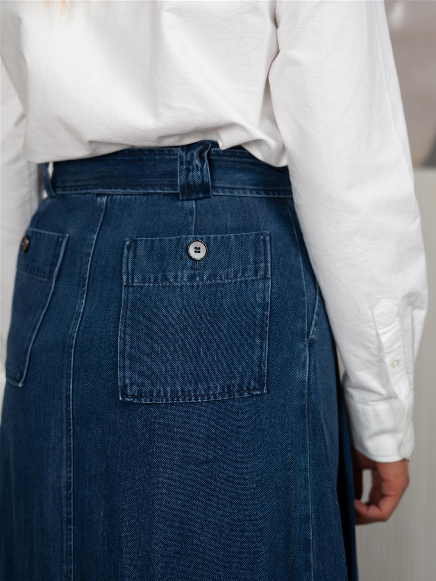 Et stilrent og moderne skjørt i en dyp blåfarge, perfekt for å tilføre et elegant preg til antrekket ditt. Laget av et lett og pustende materiale som gir både komfort og et sofistikert utseende. Skjørtet har god lengde, skrålomme i hver side og knytting i livet. Den har også en liten splitt fremme for det lille ekstra og to lommer bak. Fint til både hverdags og fest.