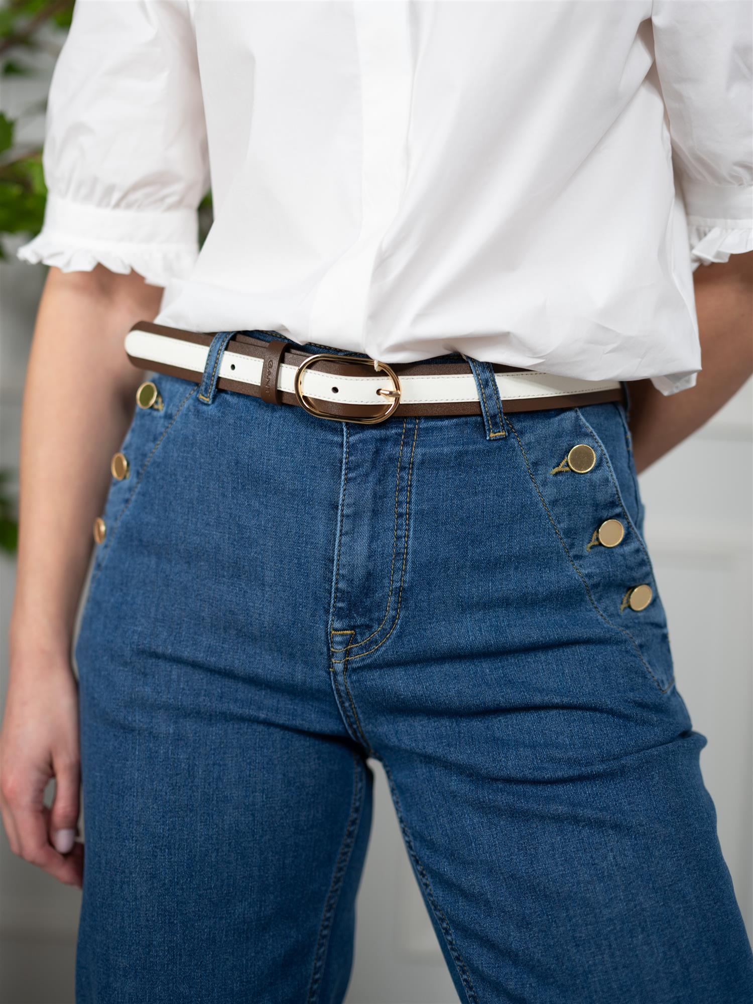 Flare Nautical Jeans fra Gant er laget av lett og elastisk bomull, og gir et maritimt preg til garderoben din. Med en høy midje og en flared silhuett, er disse jeansene både stilige og komfortable. Den mid-indigo vasken gir et tidløst utseende, mens de gullfargede knappene med tau-detaljer tilfører en unik touch. Fullført med en Gant lærmerke på baklommen, er disse jeansene et perfekt valg for en avslappet stil.