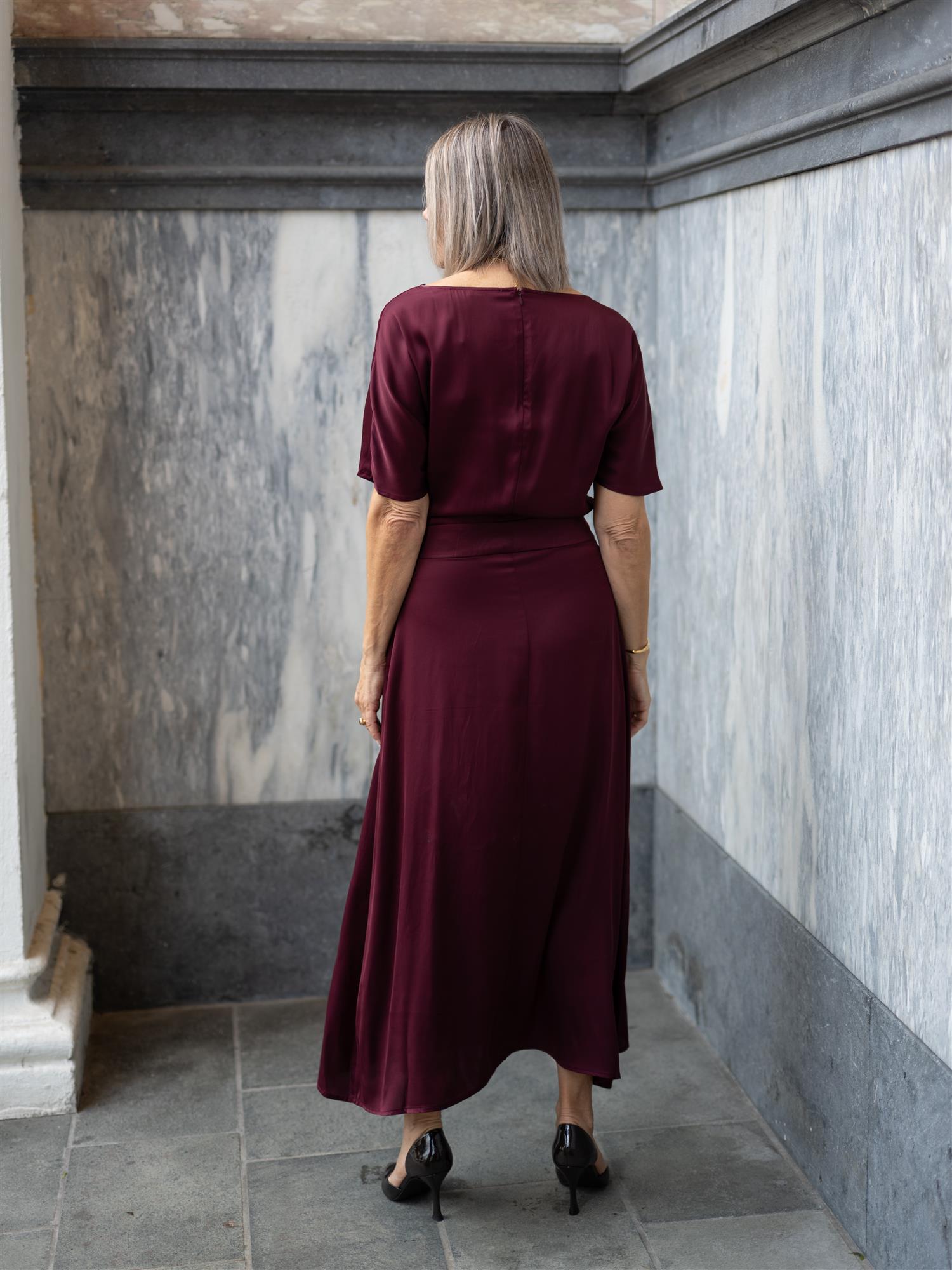 Elegant kjole fra Stenströms i en nydelig bordeaux farge. Kjolen har en smal, men flatterende silhuett som elegant fremhever figuren. Halsen på kjolen er drapert som gir det hele et luksuriøst uttrykk. Kjolen har ankellengde og korte ermer. Lukkes med glidelås bak og i siden.