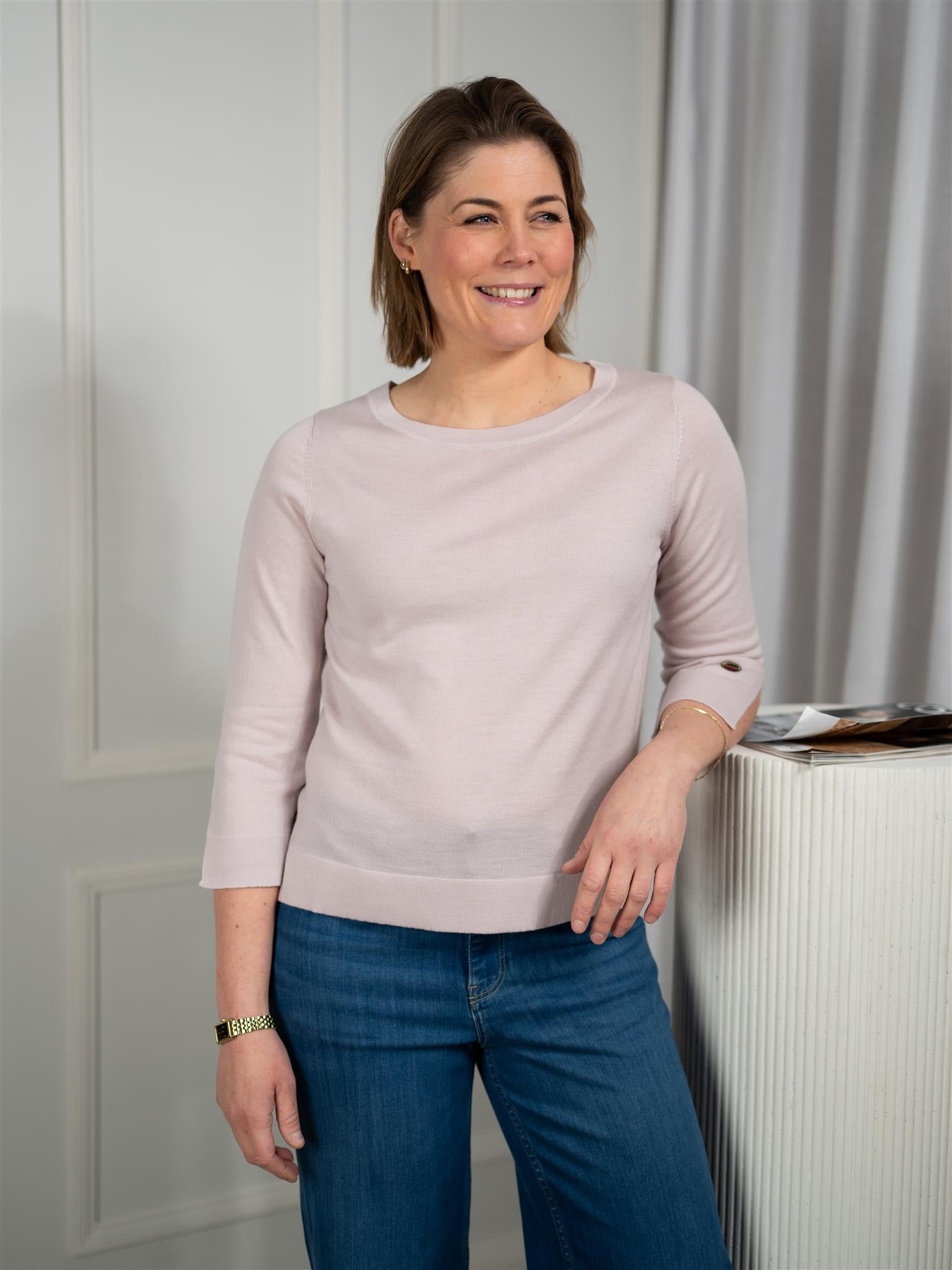 Dus rosa-lilla tynn topp fra Busnel. Detaljert med splitt ved ermåpningene og på sidene. Finstrikket med 3/4 ermer og normal passform. Rund hals.