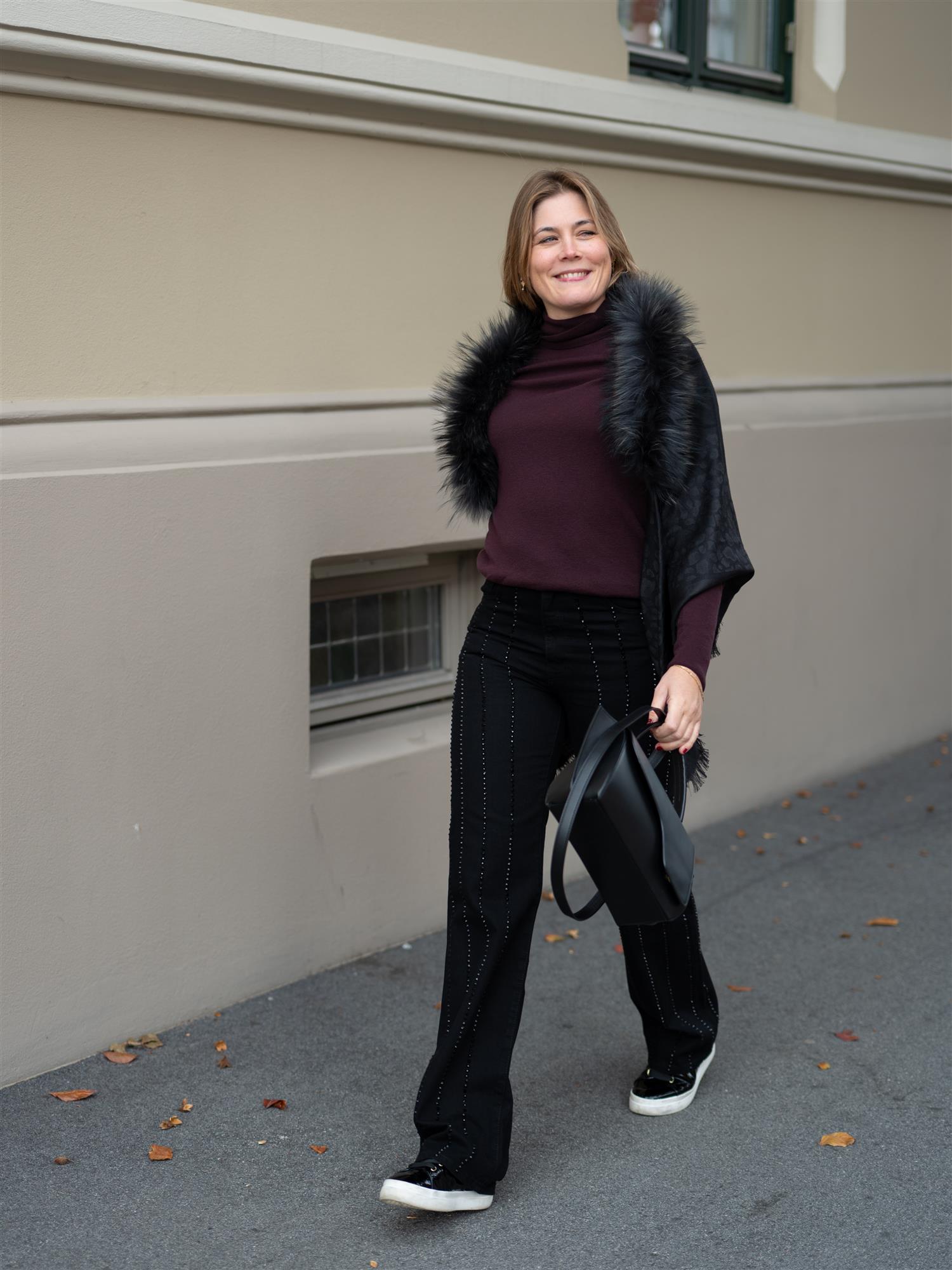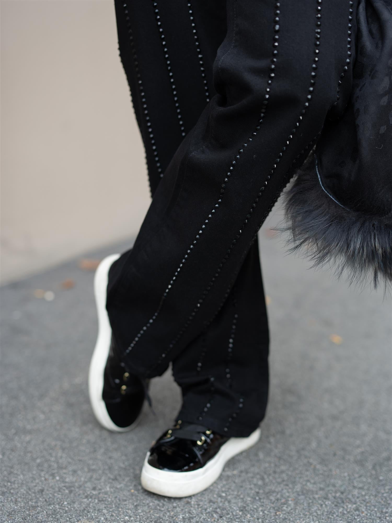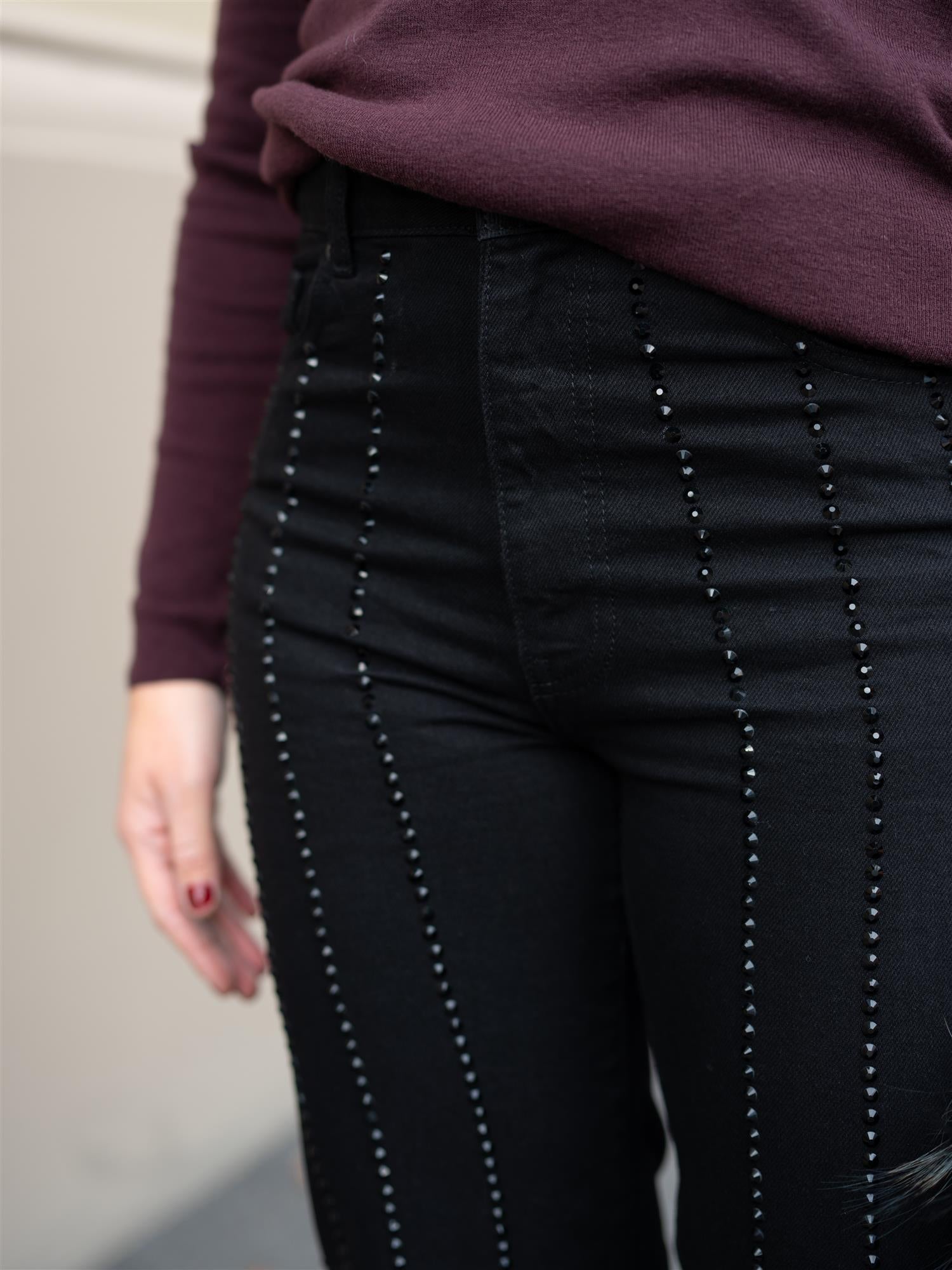 Få hvert steg til å glitre med Lucca Embellished-jeans fra Camilla Pihl. Sorte bukser med sorte skinnende studs. Jeansen er en rett modell med høyt liv, og lommer både foran og bak. Lite til ingen stretch.