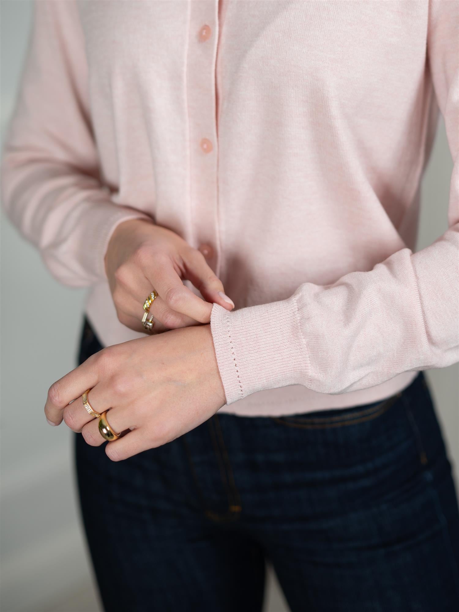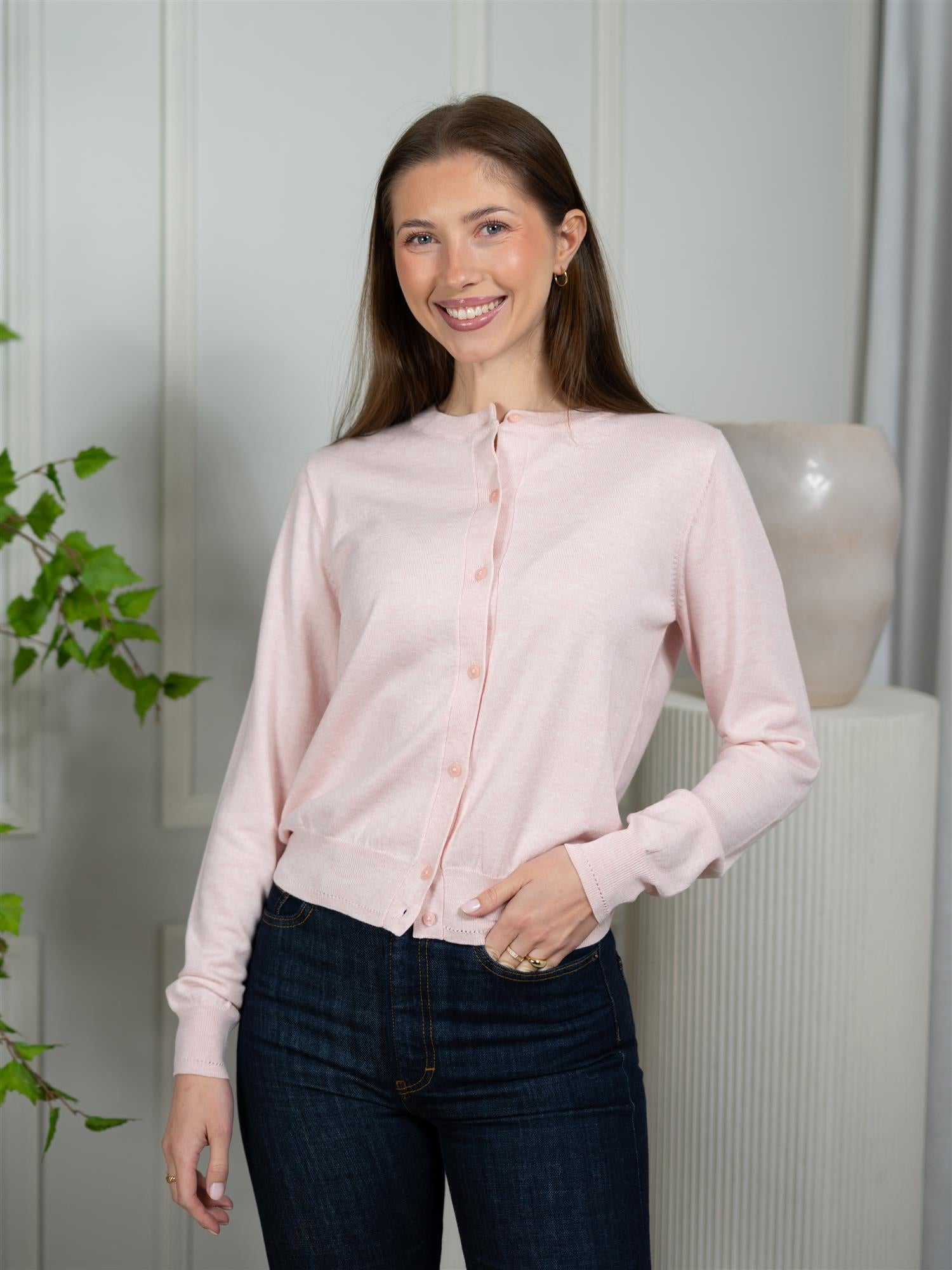 Cardigan fra Lexington med en klassisk og tidløs look. Den har en vårlig og delikat lys rosa farge som supplerer garderoben. Finstrikket med knapper i front og rund hals. Myk og god kvalitet. Kombiner til jeans for det perfekte hverdagsantrekket!