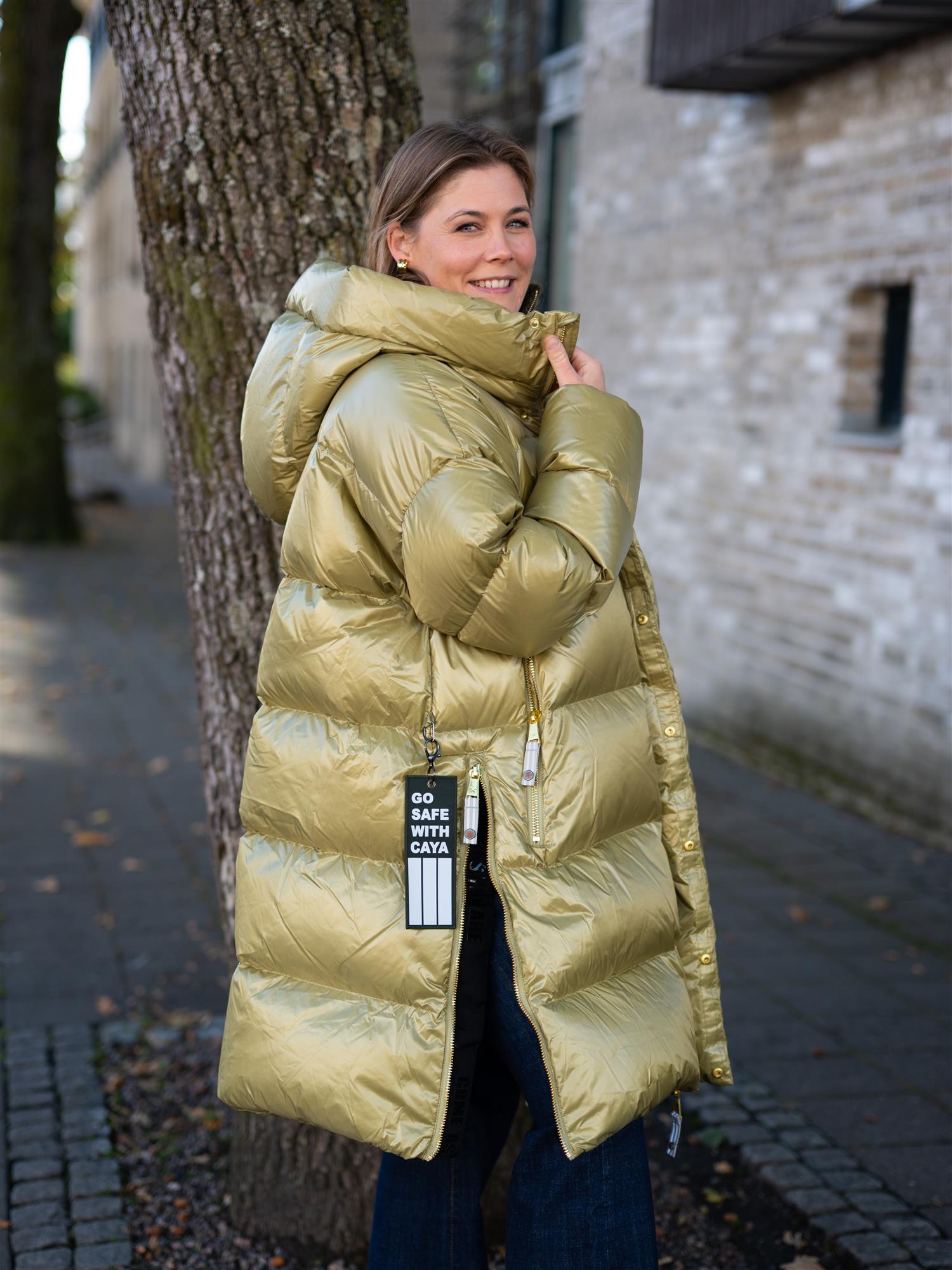 God og varm dunjakke fra CAYA i grønn med gull-aktig fargetone. Jakken er stilfull og har middels lengde. Det er lommer og splitt i sidene. På innsiden av jakken er det stropper, slik at du kan ha jakken hengende over deg på ryggen uten å ha den over ermene. Jakken har kule detaljer som både gir deg en røff og sporty look.