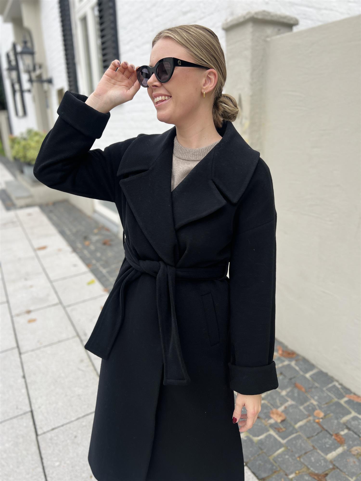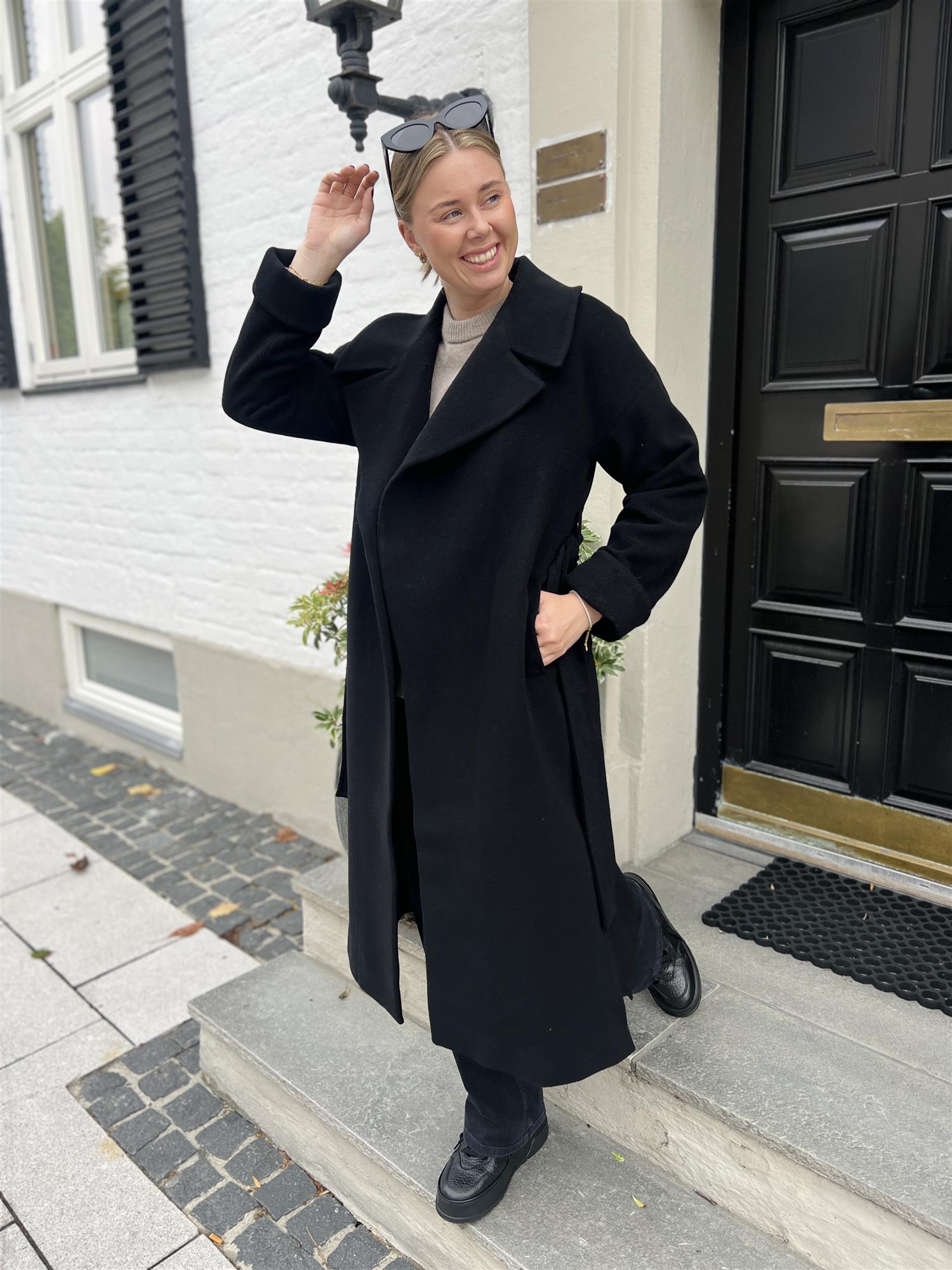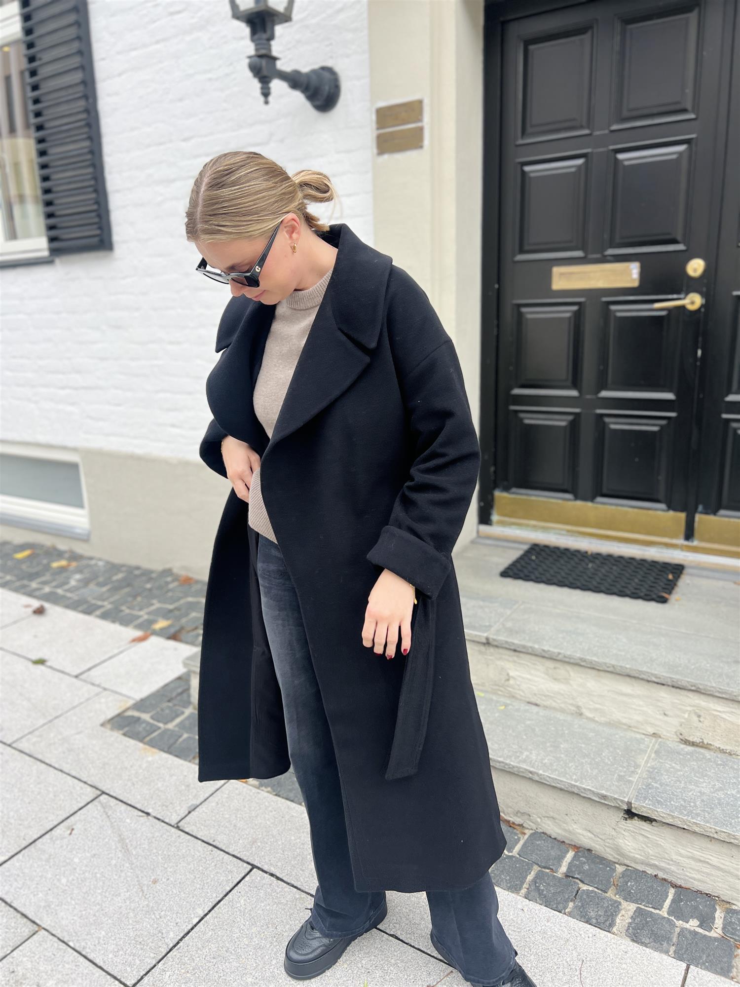 Klassisk og varm kåpe i sort fra Ella&il. Kåpen er lang i modellen med knytting i livet! Perfekt til alle hverdager, men også finere anledninger. Lomme og liten splitt i hver side.