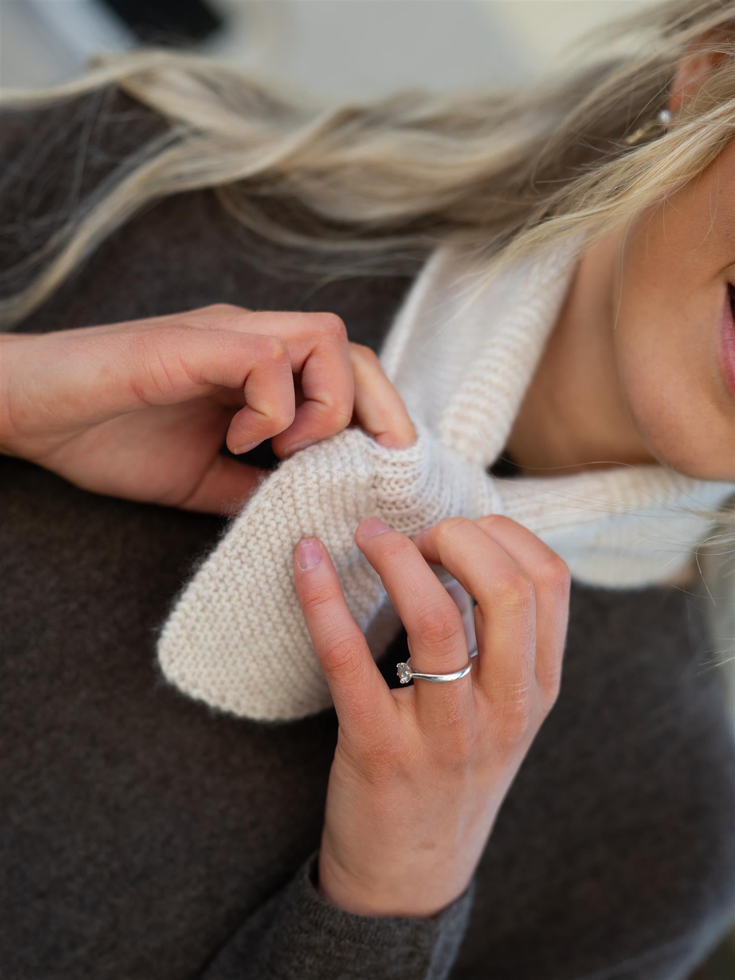 Lekkert lite skjerf fra Davida i beige. Genialt for å holde deg god og varm, men det er også med på å løfte antrekket som en lekker detalj!
