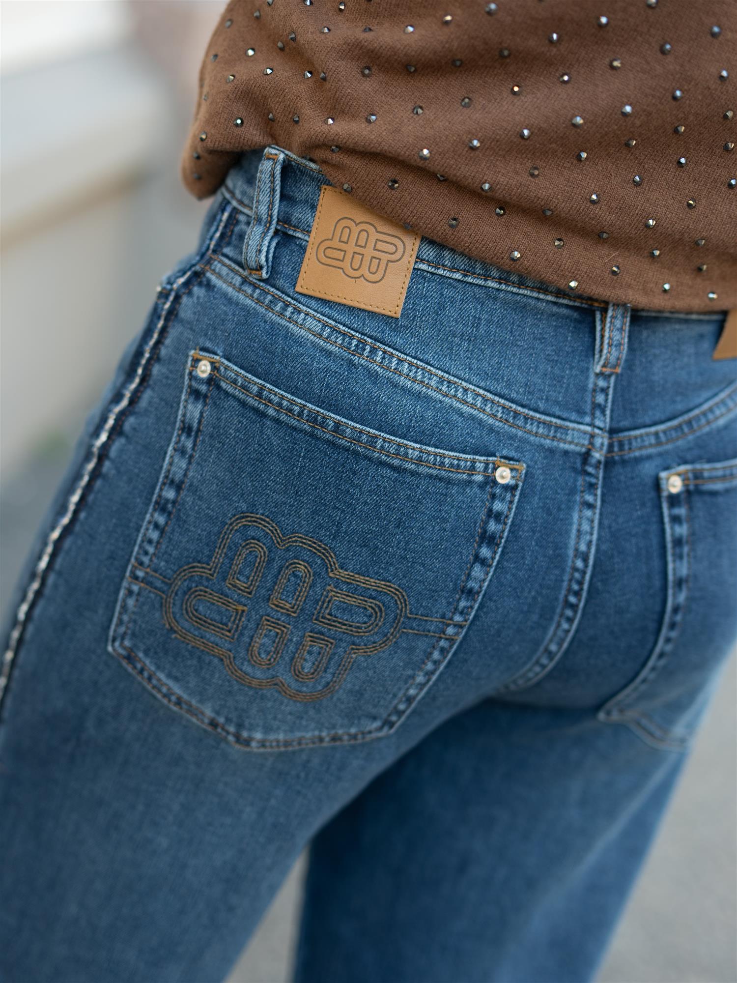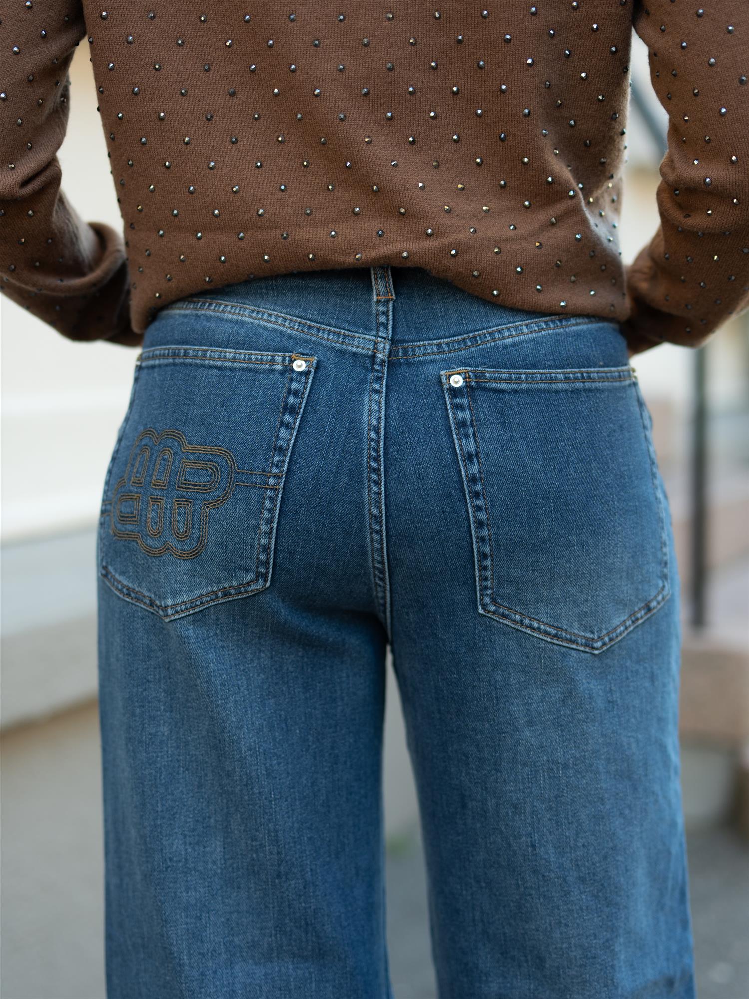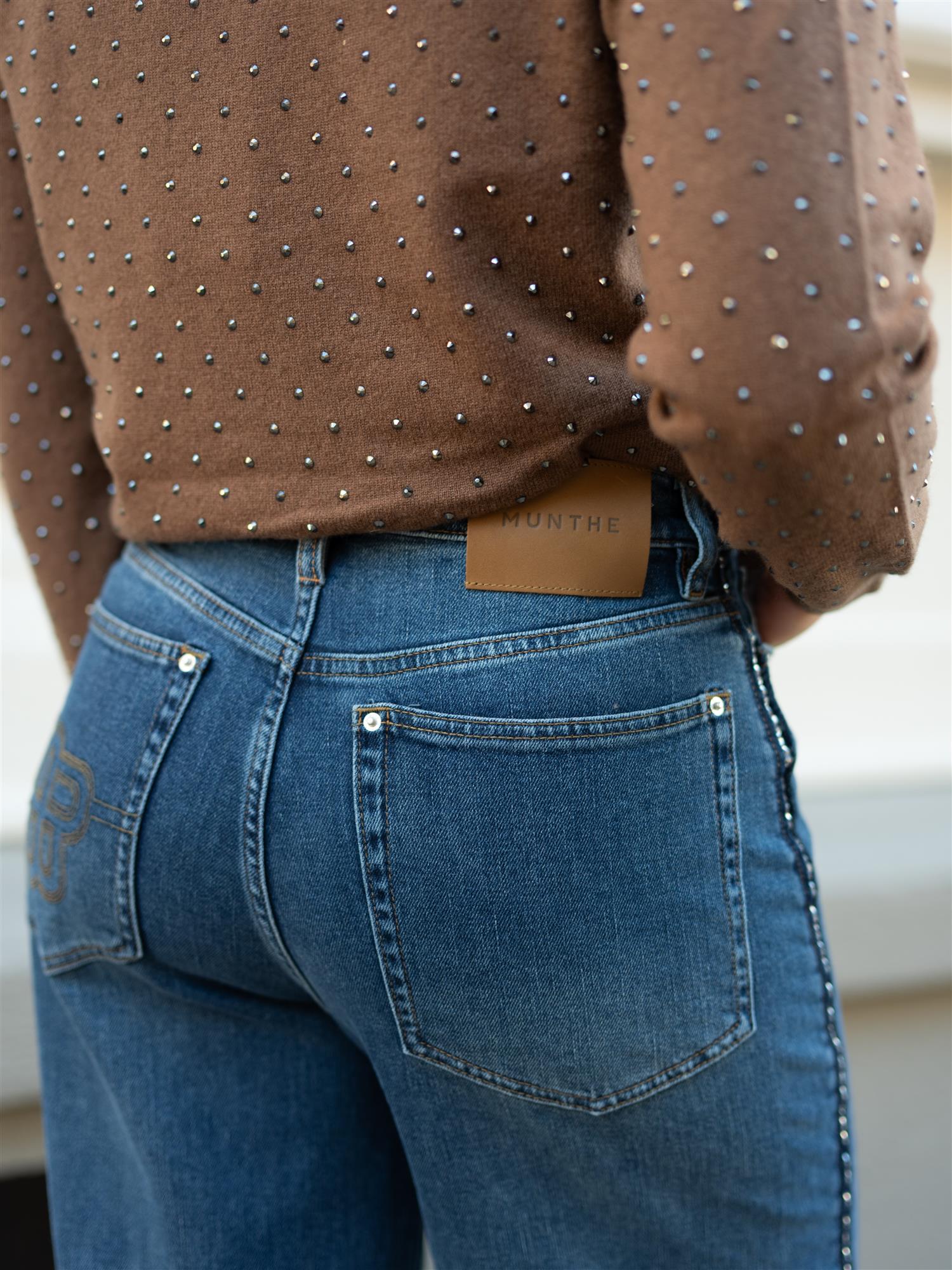 Rålekre jeans fra Munthe i blå. Buksen har vide ben med en vakker kontrast-søm med strass langs sidesømmene. På den ene baklommen er det brodert en Munthe-emblemdetalj som gir det lille ekstra. Buksen er høy på livet.
