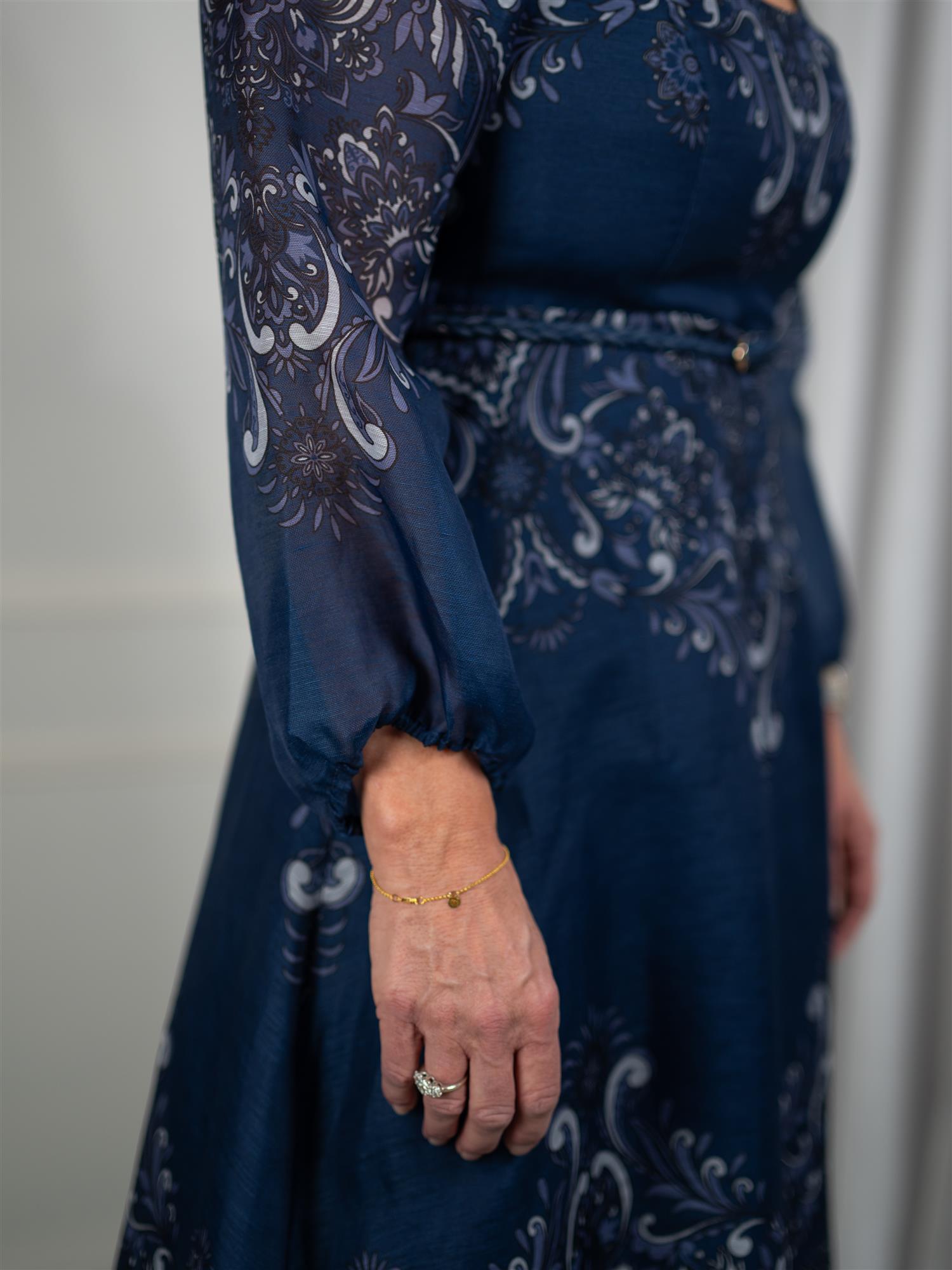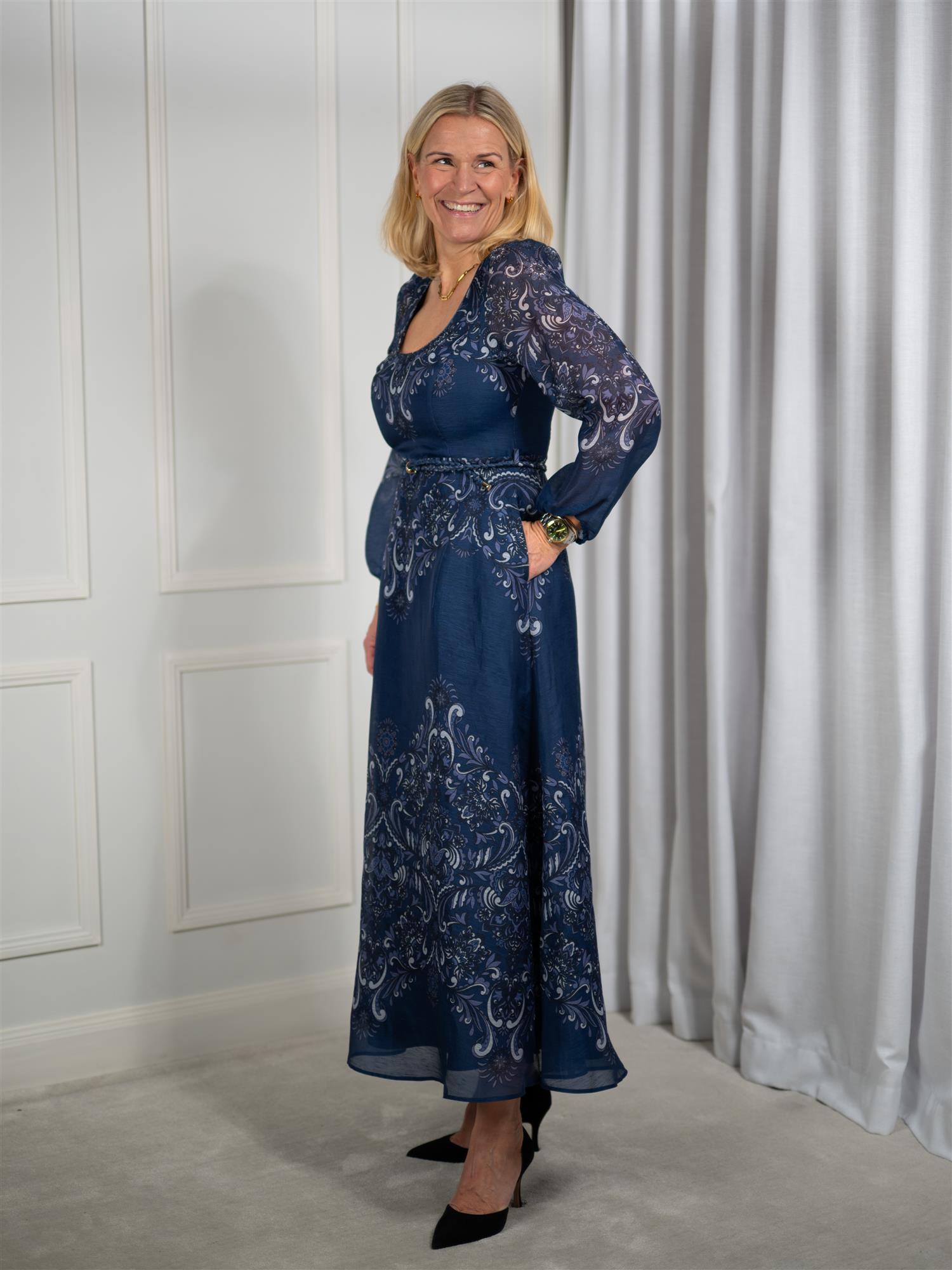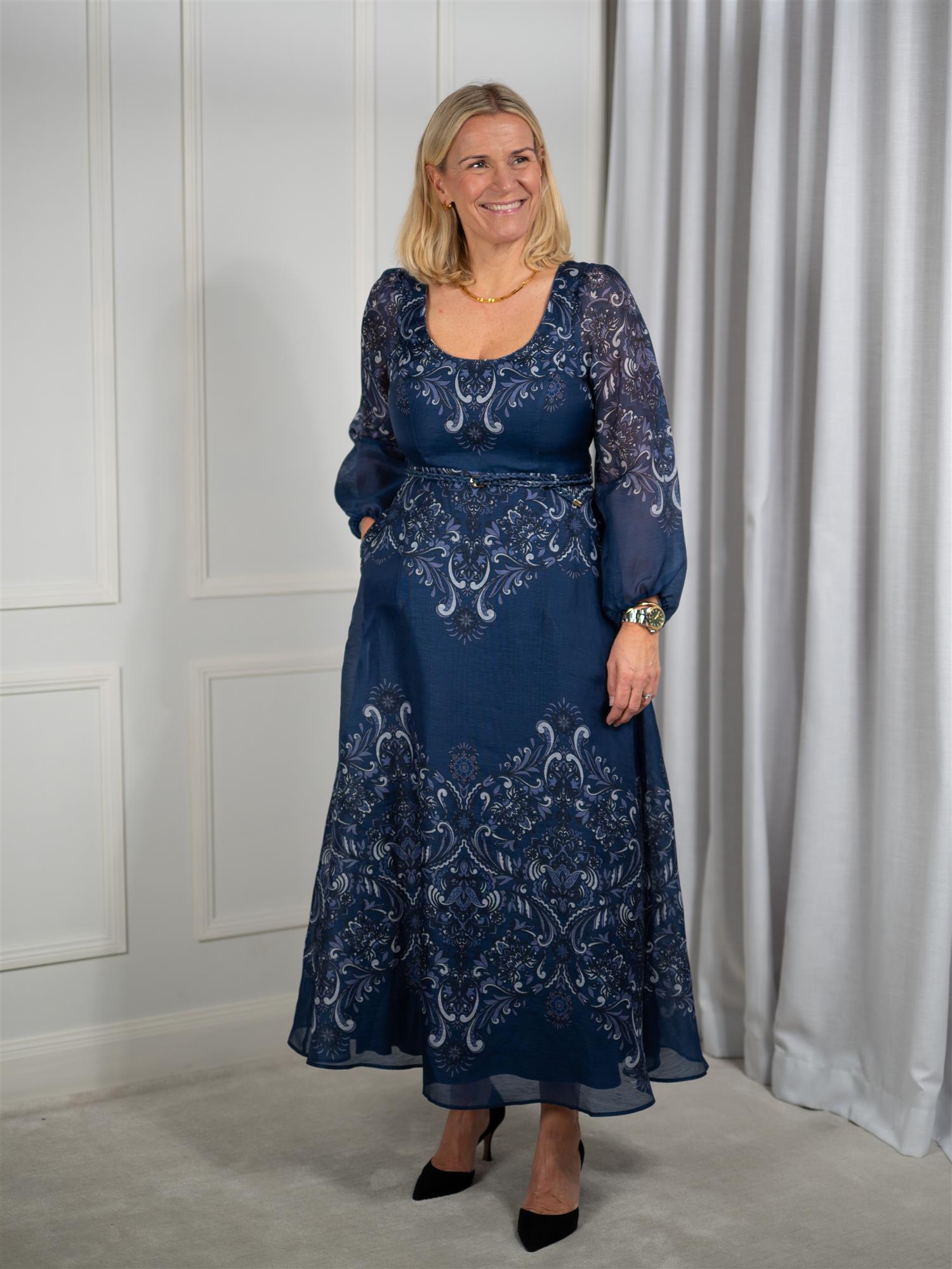 Lekker blå maxikjole fra Hale Bob med mønster på. Flatterende buet utringning, ballongermer med strikk i enden, belte i midjen og puffede skuldre. Lukkes med glidelås bak. Kjolen har lommer i sidene. Fantastisk kvalitet med underskjørt i blåfarget viskose.