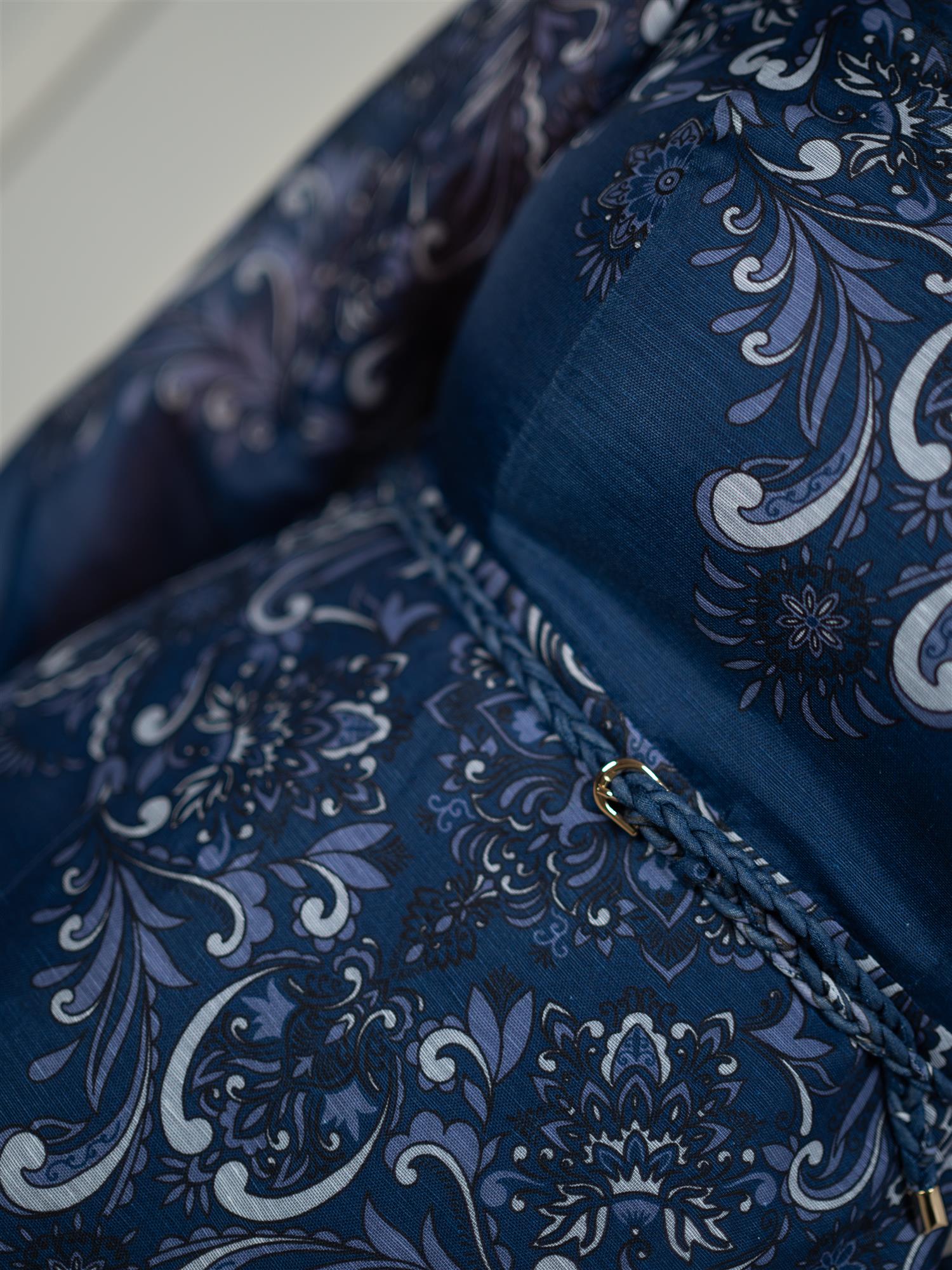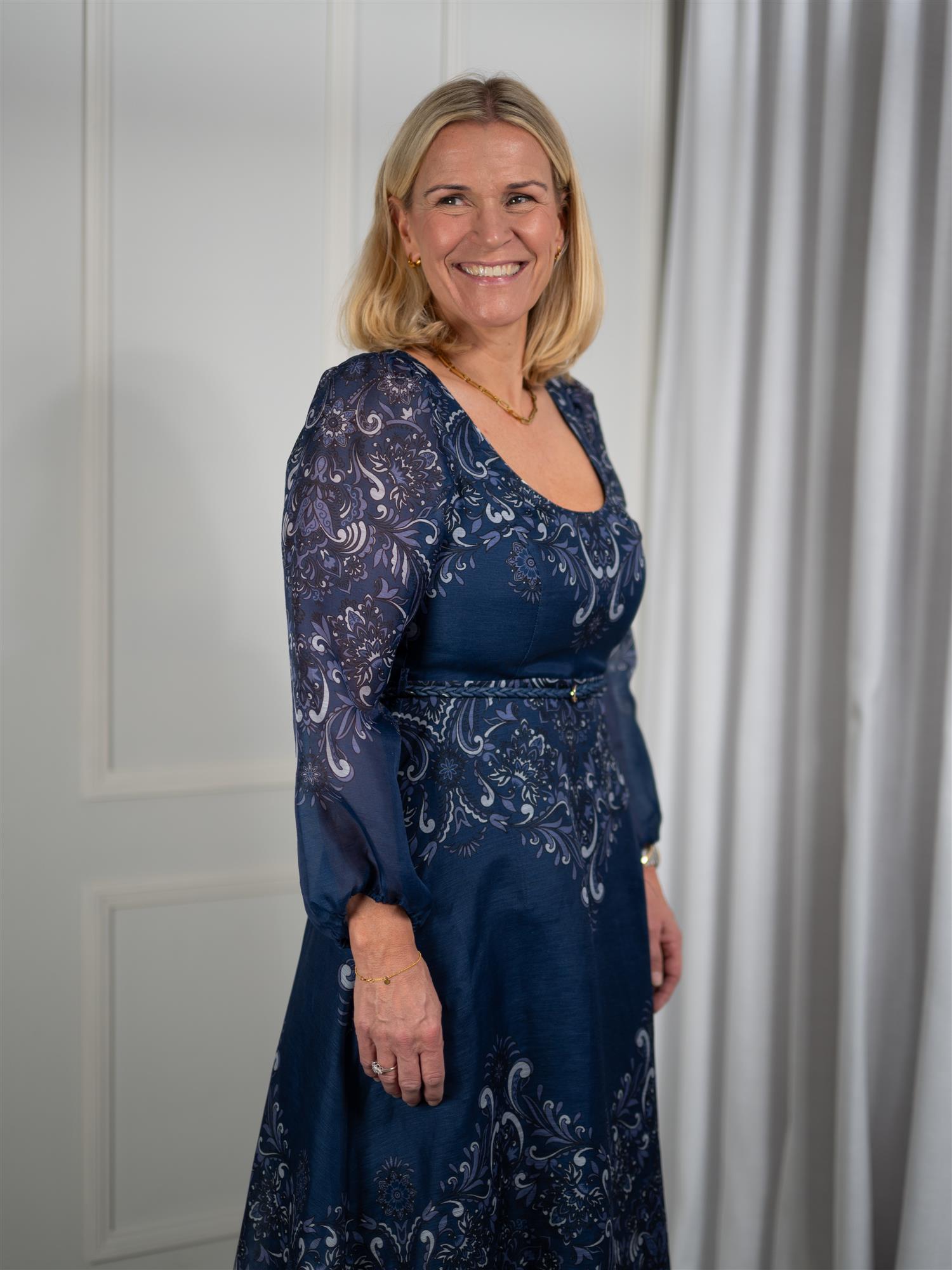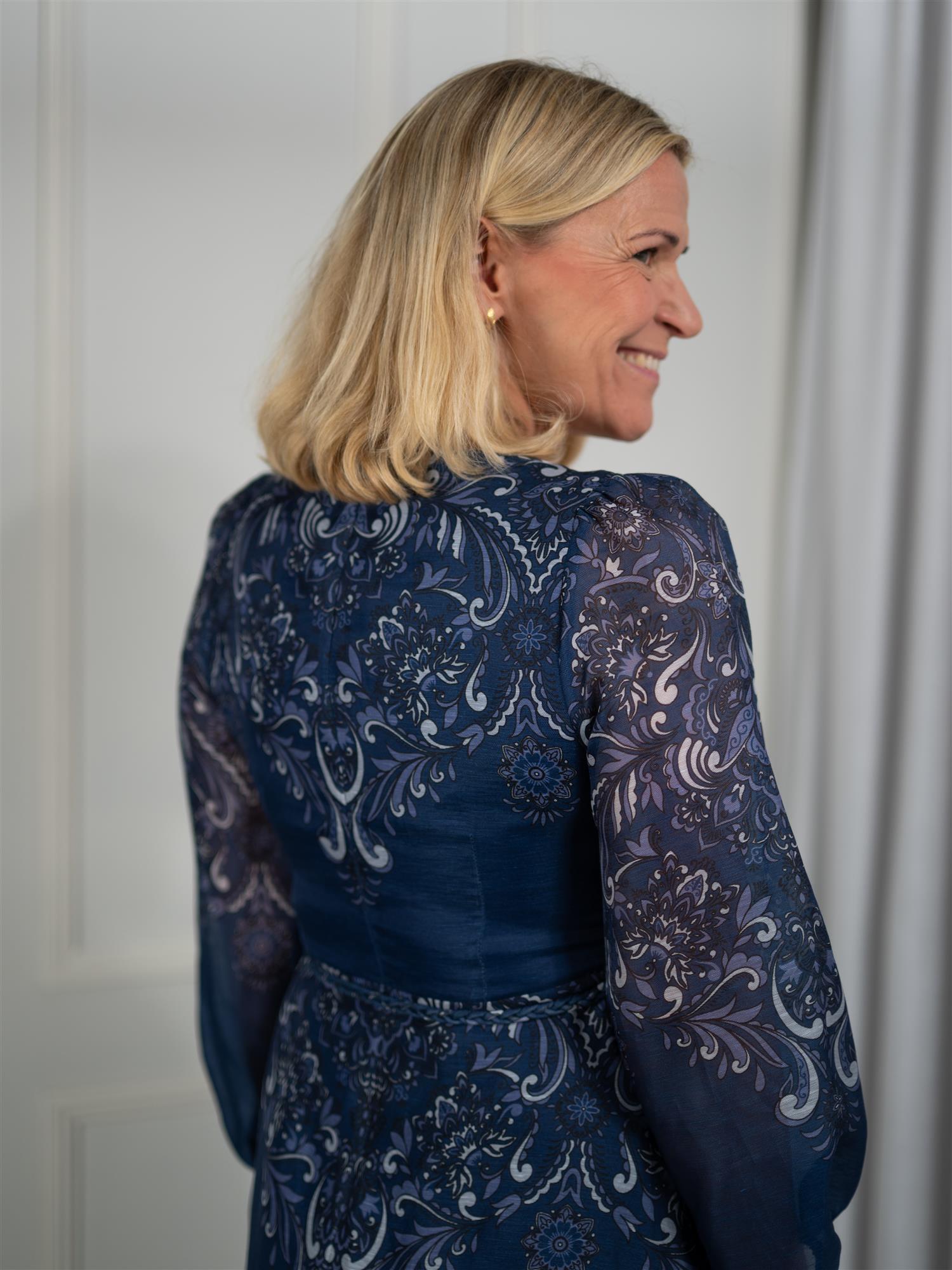 Lekker blå maxikjole fra Hale Bob med mønster på. Flatterende buet utringning, ballongermer med strikk i enden, belte i midjen og puffede skuldre. Lukkes med glidelås bak. Kjolen har lommer i sidene. Fantastisk kvalitet med underskjørt i blåfarget viskose.