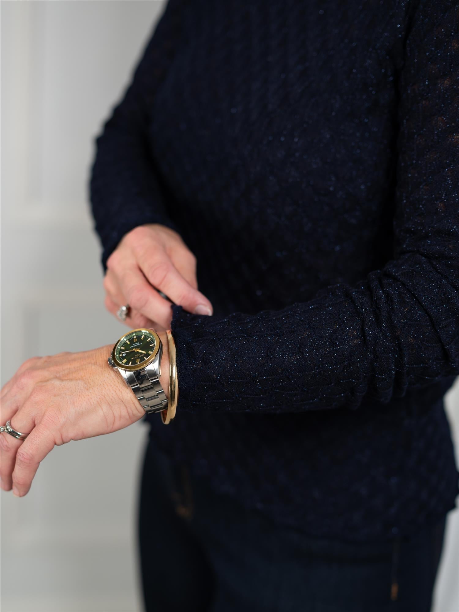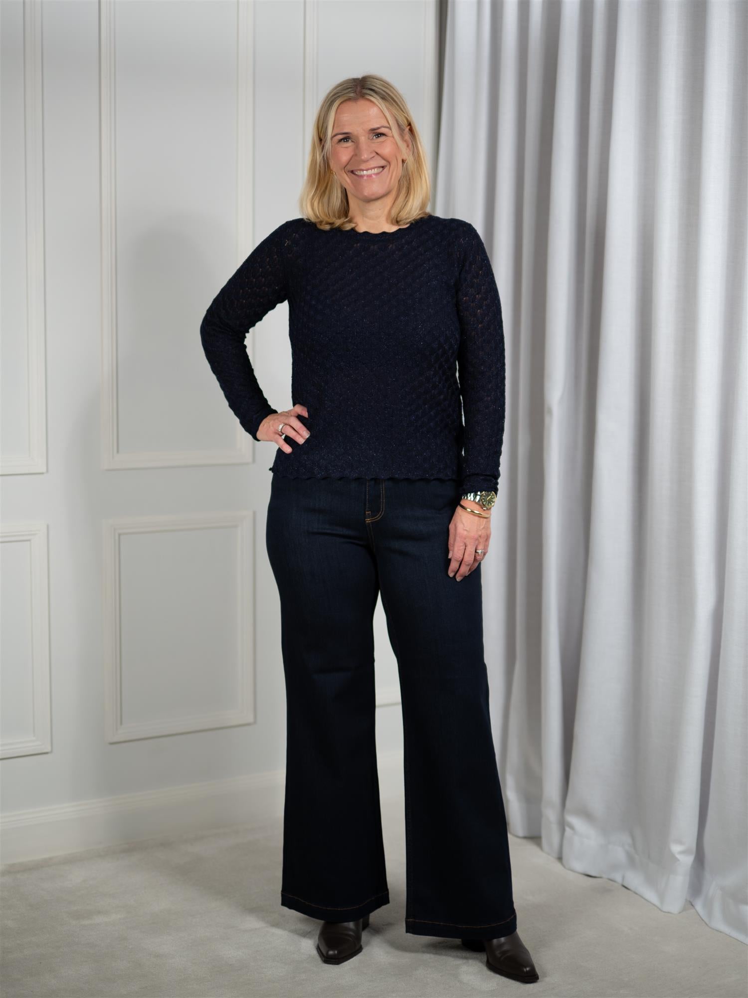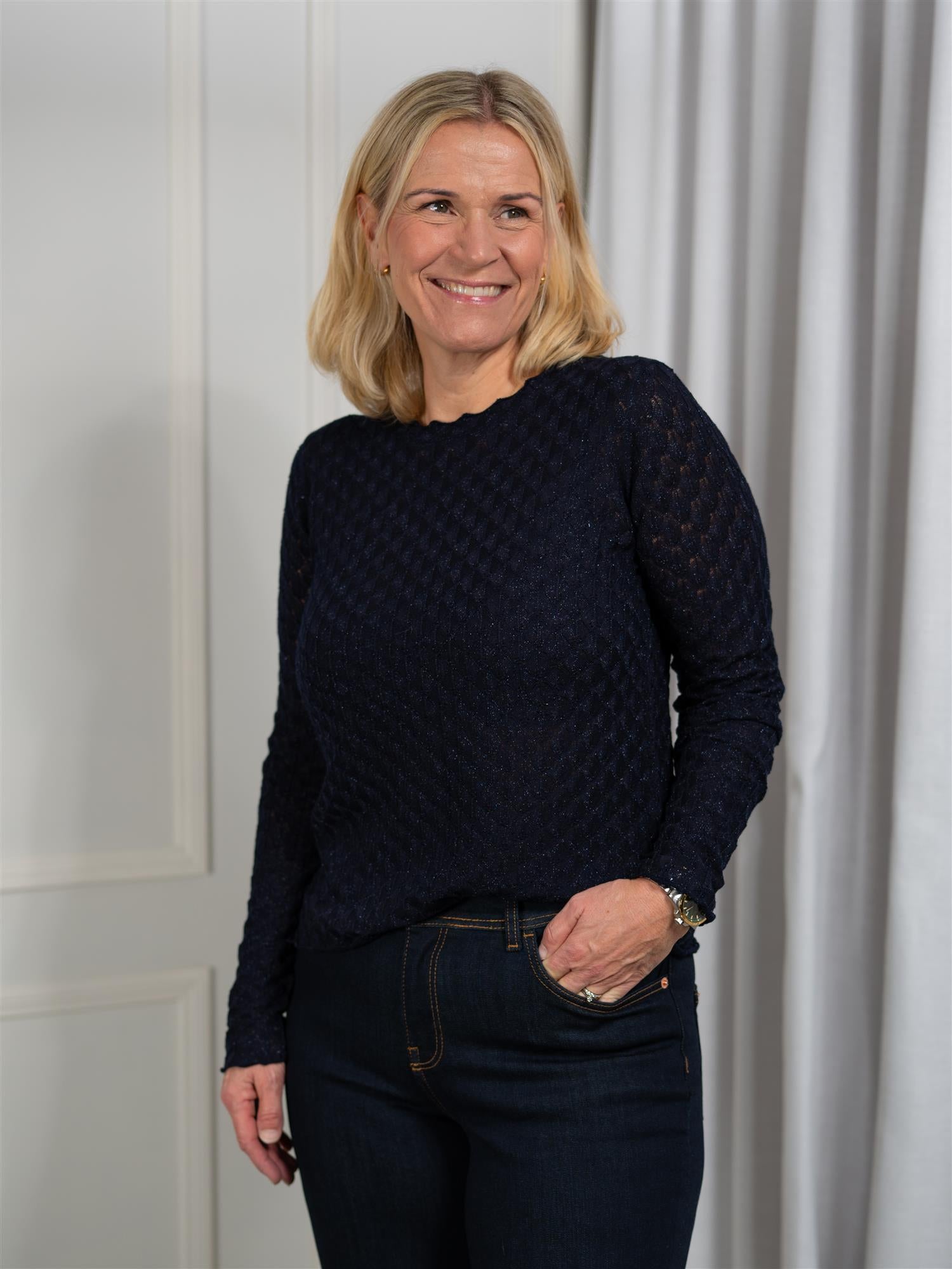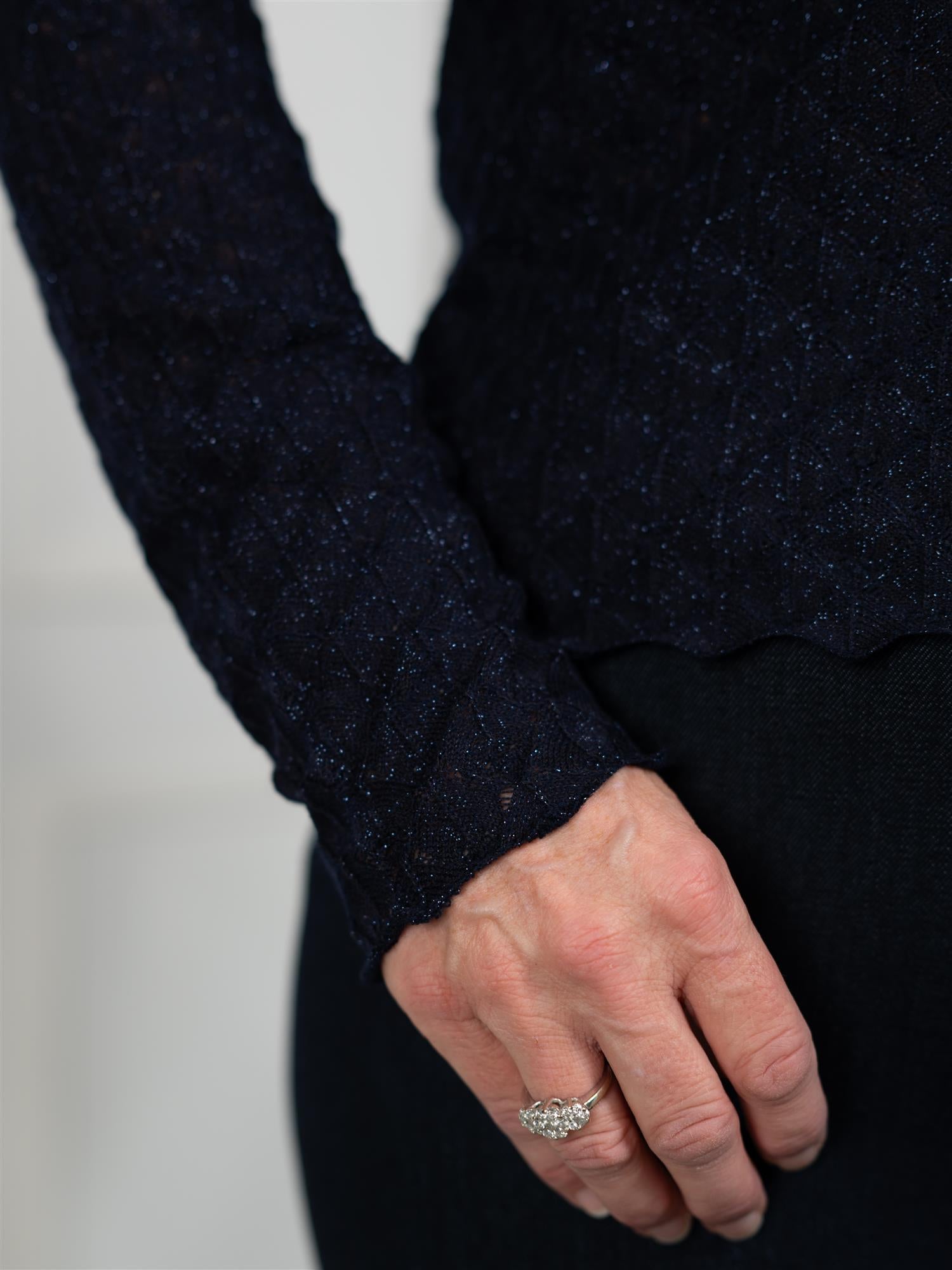 Pen langermet topp fra Mos Mosh i mørkeblå. Denne strikken gir både detaljer og dybde. Designet med en flatterende, smal silhuett og har et heldekkende, teksturert mønster med et diskret skimmer som gir et sofistikert, men lekent uttrykk. Det myke, lette stoffet faller pent, mens de bølgede kantene tilfører et raffinert og feminint preg.