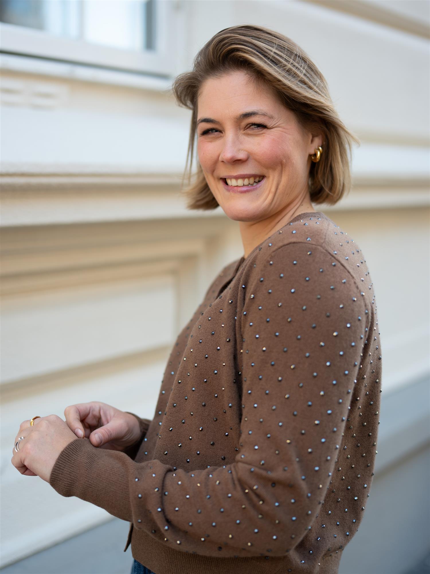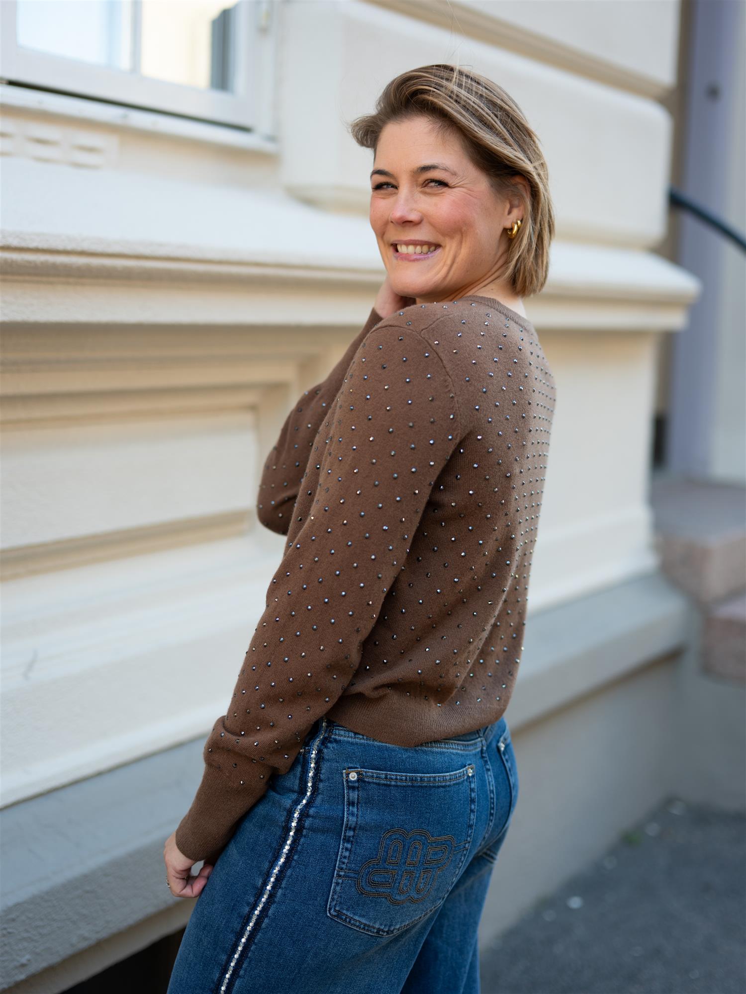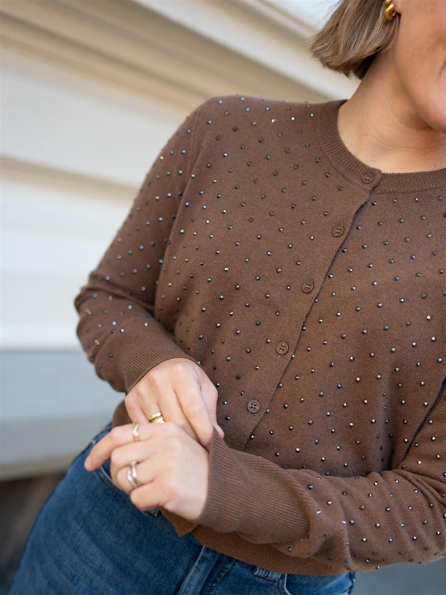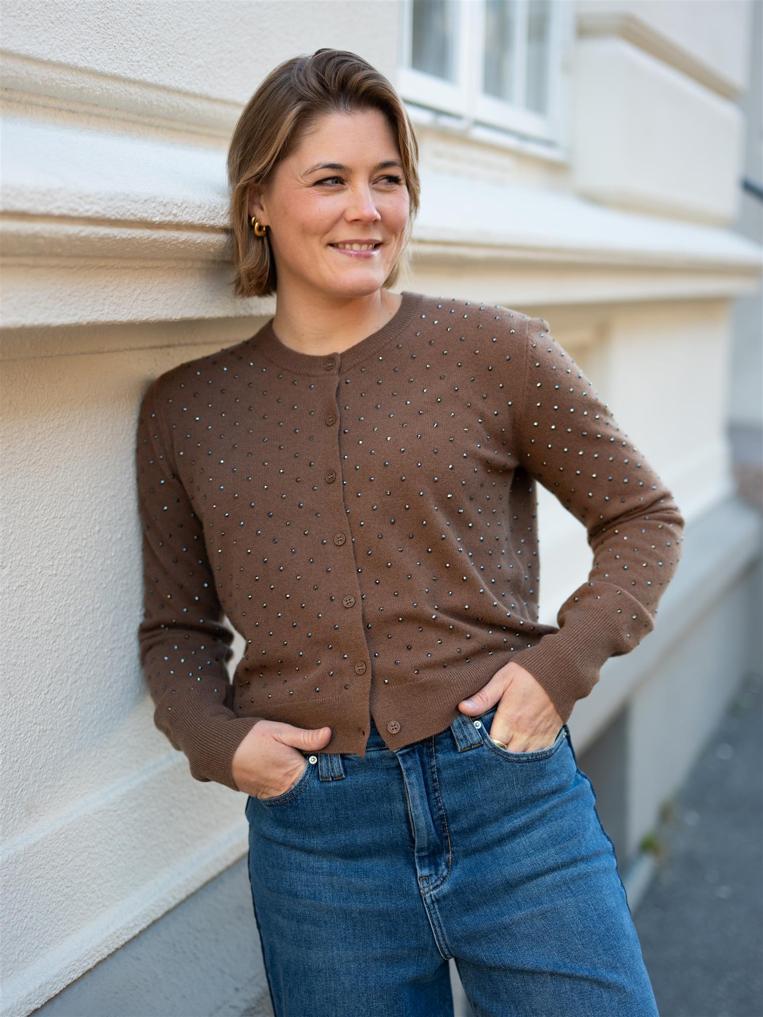 Behagelig og myk cardigan fra Munthe i varm brun. Den har en klassisk rund hals, knappeåpning i front og lange ermer med bred ribbekant. Cardiganen er pyntet opp med noen elegante sorte nagler. Kort modell.