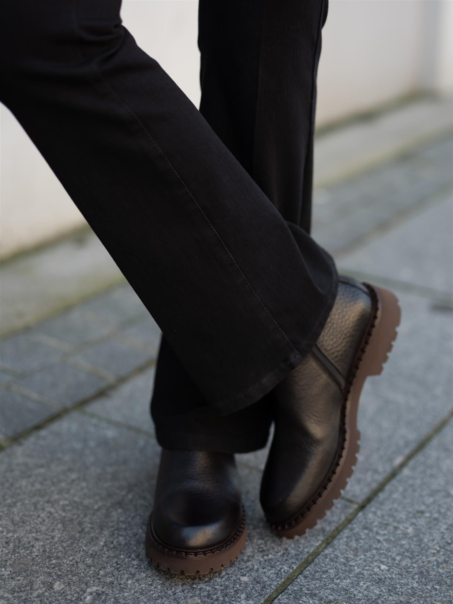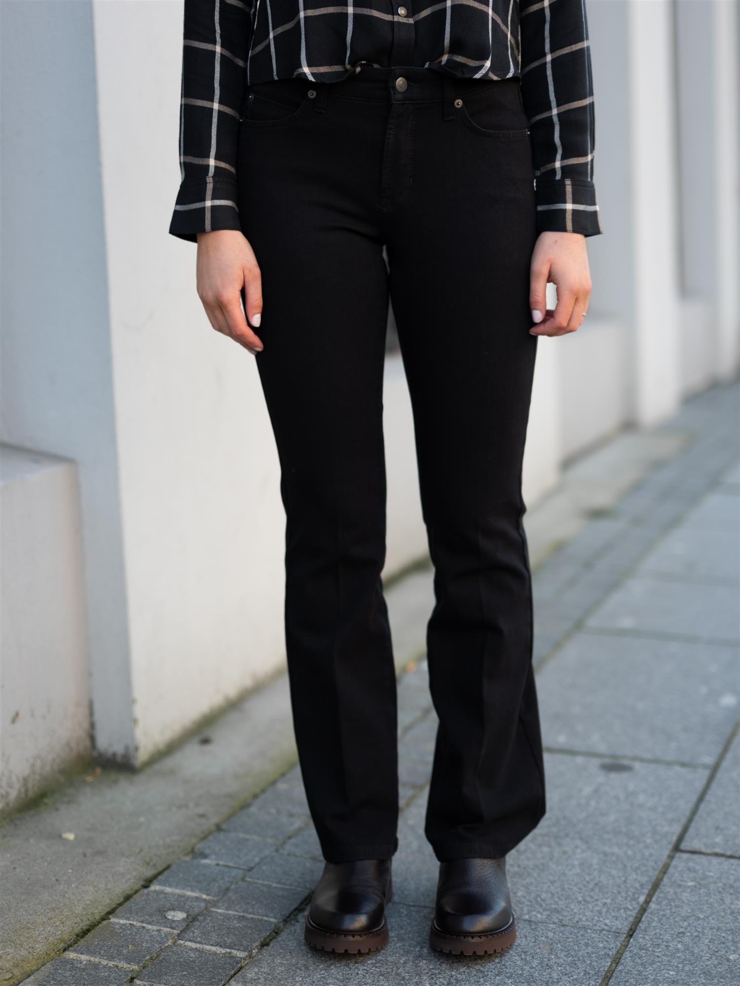 Flared jeans fra Cambio i sort. Normal høyde i livet og god stretch. Lommer både foran og bak. Buksen har en rett modell med en liten sleng nederst.