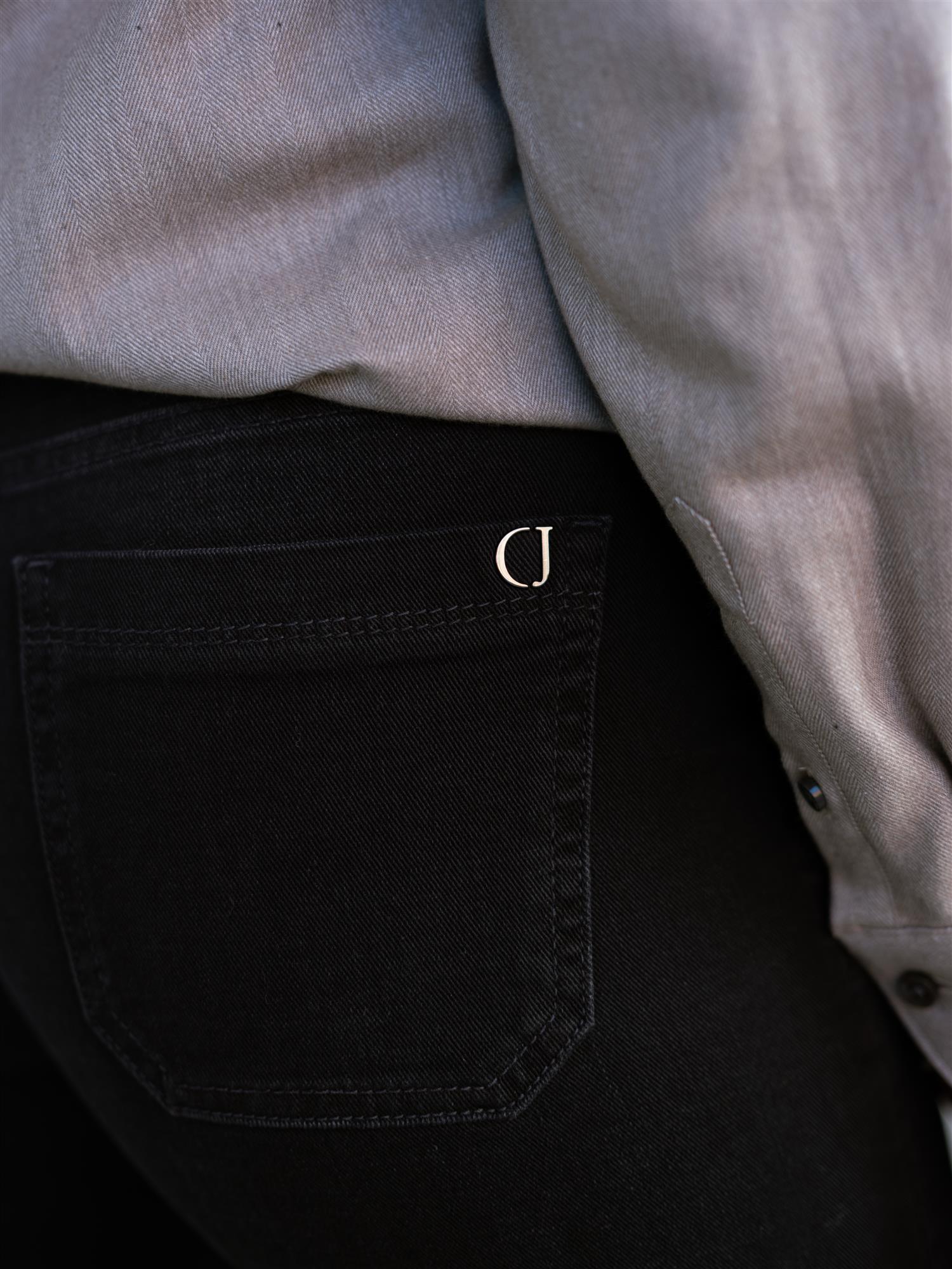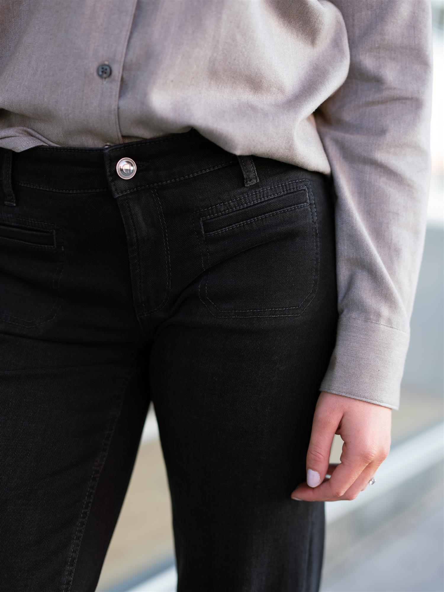 Klassisk og enkel grå-sort bukse fra Cambio. Rett og løs silhuett, normal høyde på livet, lommer både foran og bak, og hemper for belte. Fremsidens lommer skiller seg ut med et stilig preg. Tess har god stretch.