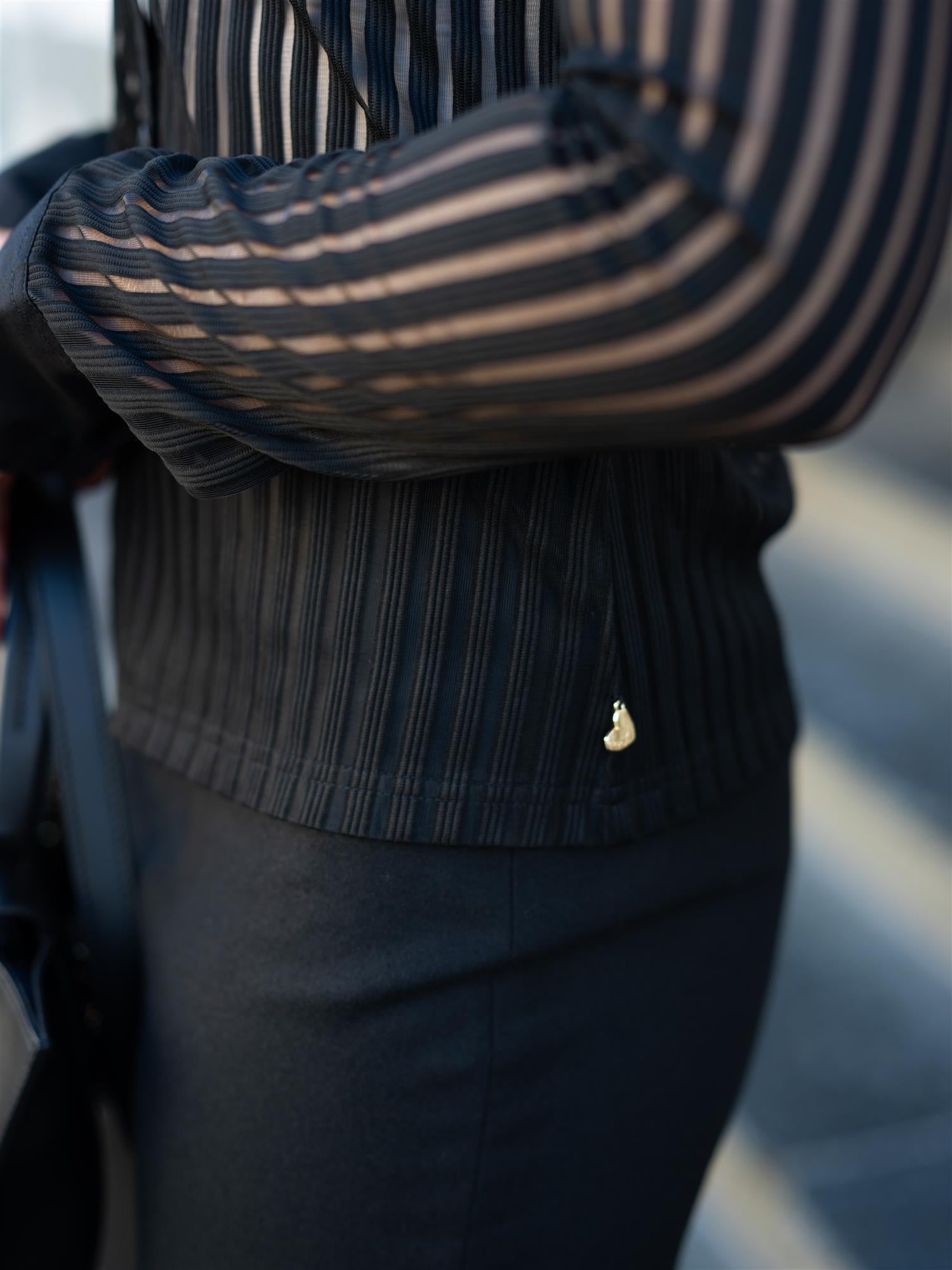 Lekker skjortebluse i sort fra Fabienne Chapot. Blusen har god stretch, spiss krage og semitransparent stoff med striper. Georgia Blouse har også en gullknapp formet som en leopard i kragen for det lille ekstra.