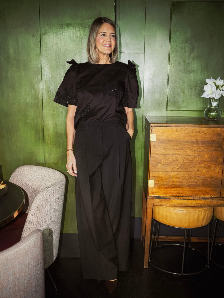 Nydelig topp fra Munthe i sort med flotte detaljer. Toppen er designet med korte puffede ermer, sløyfe på skuldrene og rund hals. Passformen er rett, vid og kort. Det stilige designet med broderi og paljetter skaper bevegelighet i det sorte.