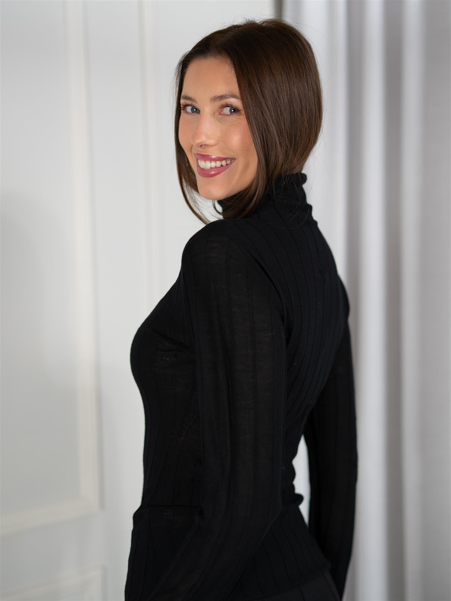 Tynn elegant genser fra Christian Aks i sort. Designet med stripete strikk, høy hals og rullede kanter. Ettersittende ermer og smal passform. Normal lengde. Genseren er semitransparent.