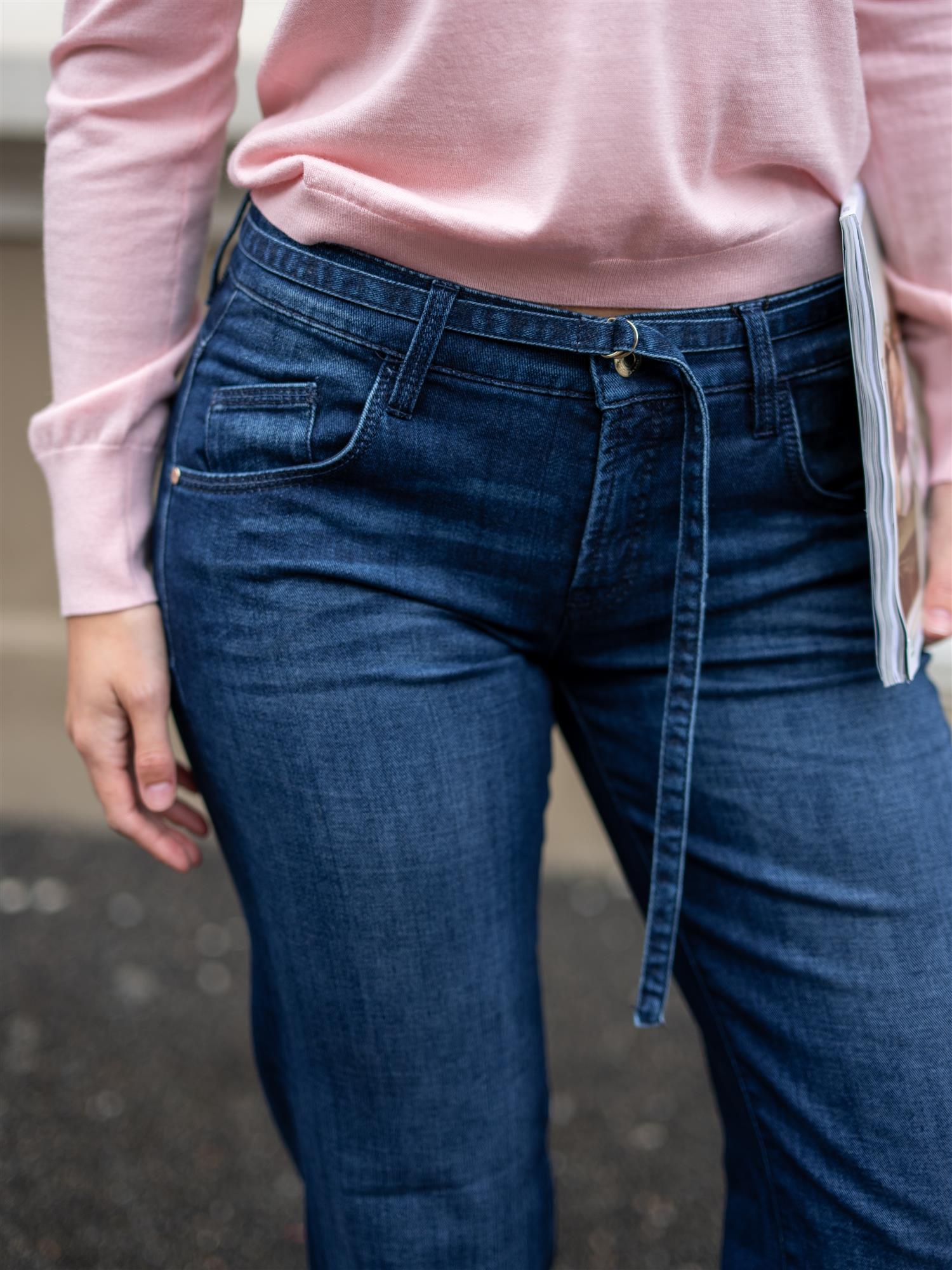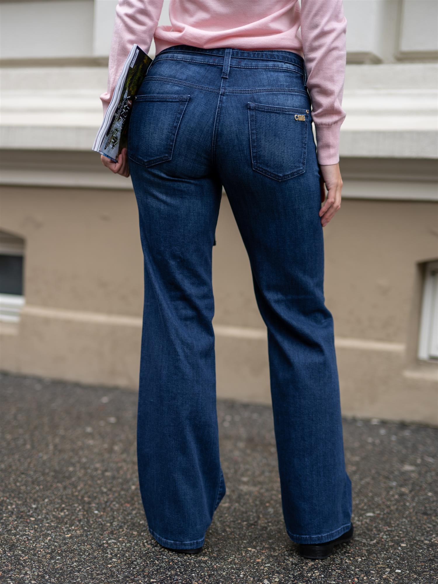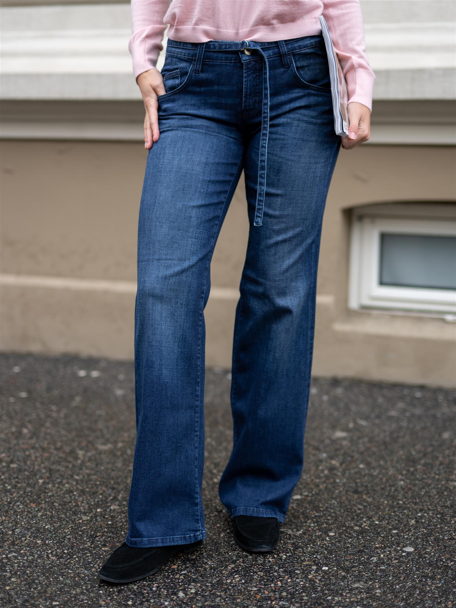 En bestselgende jeans fra Cambio i blå. Tess er kjent for sin flatterende passform med rette, vide ben og normal høyde i livet. Denne modellen kommer med et tilhørende smalt belte i samme stoff som er med på å gjøre buksen unik. Tess har lommer både foran og bak. God stretch.