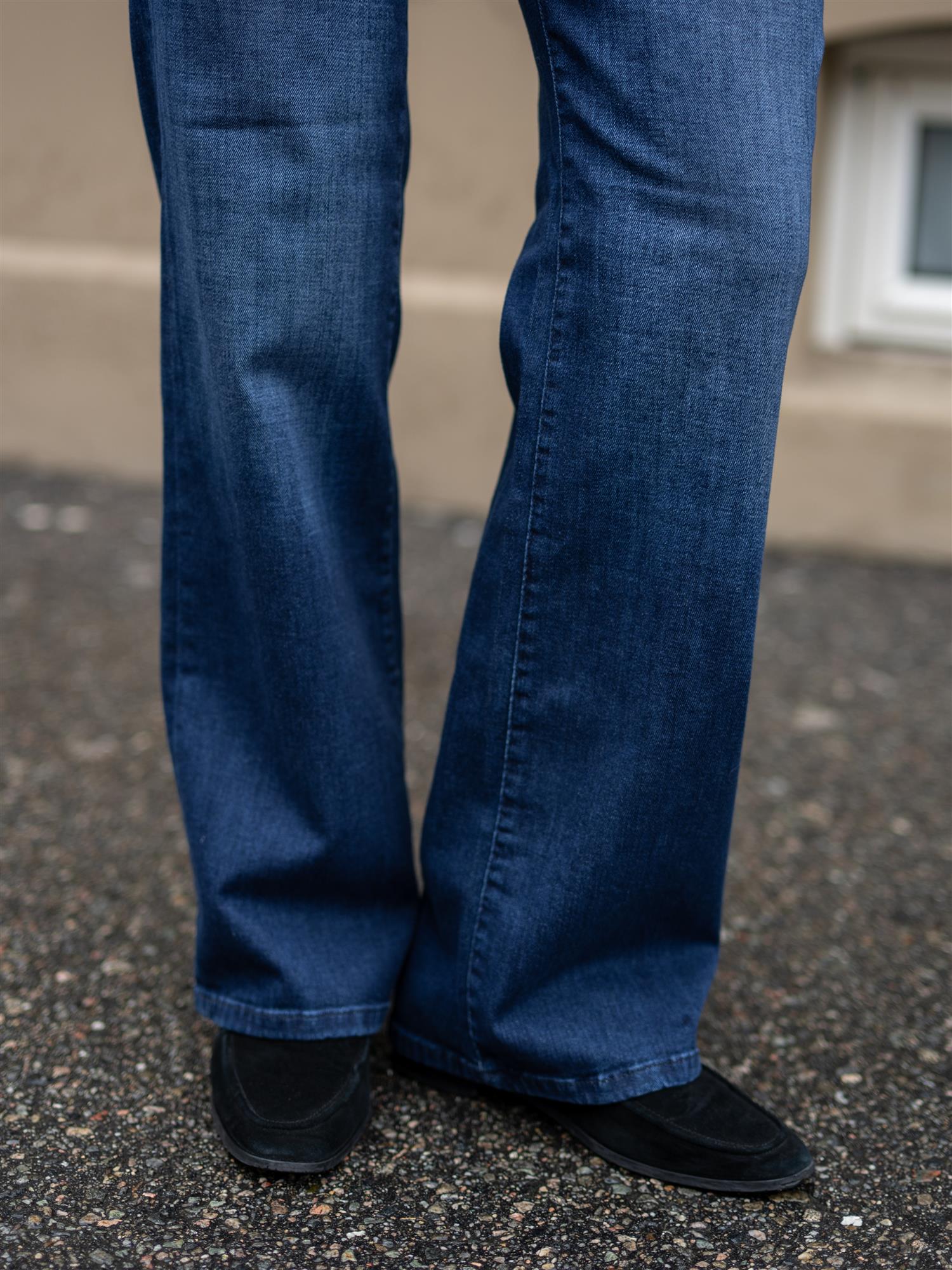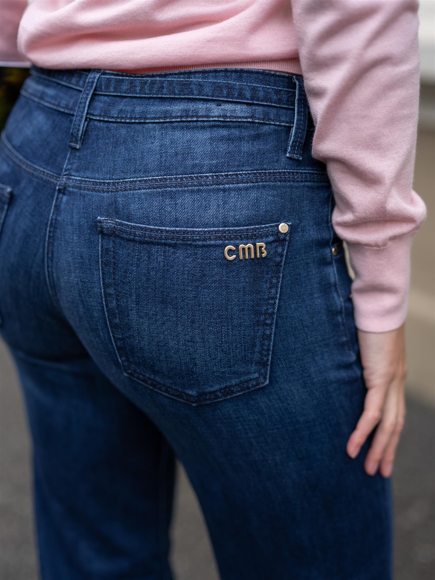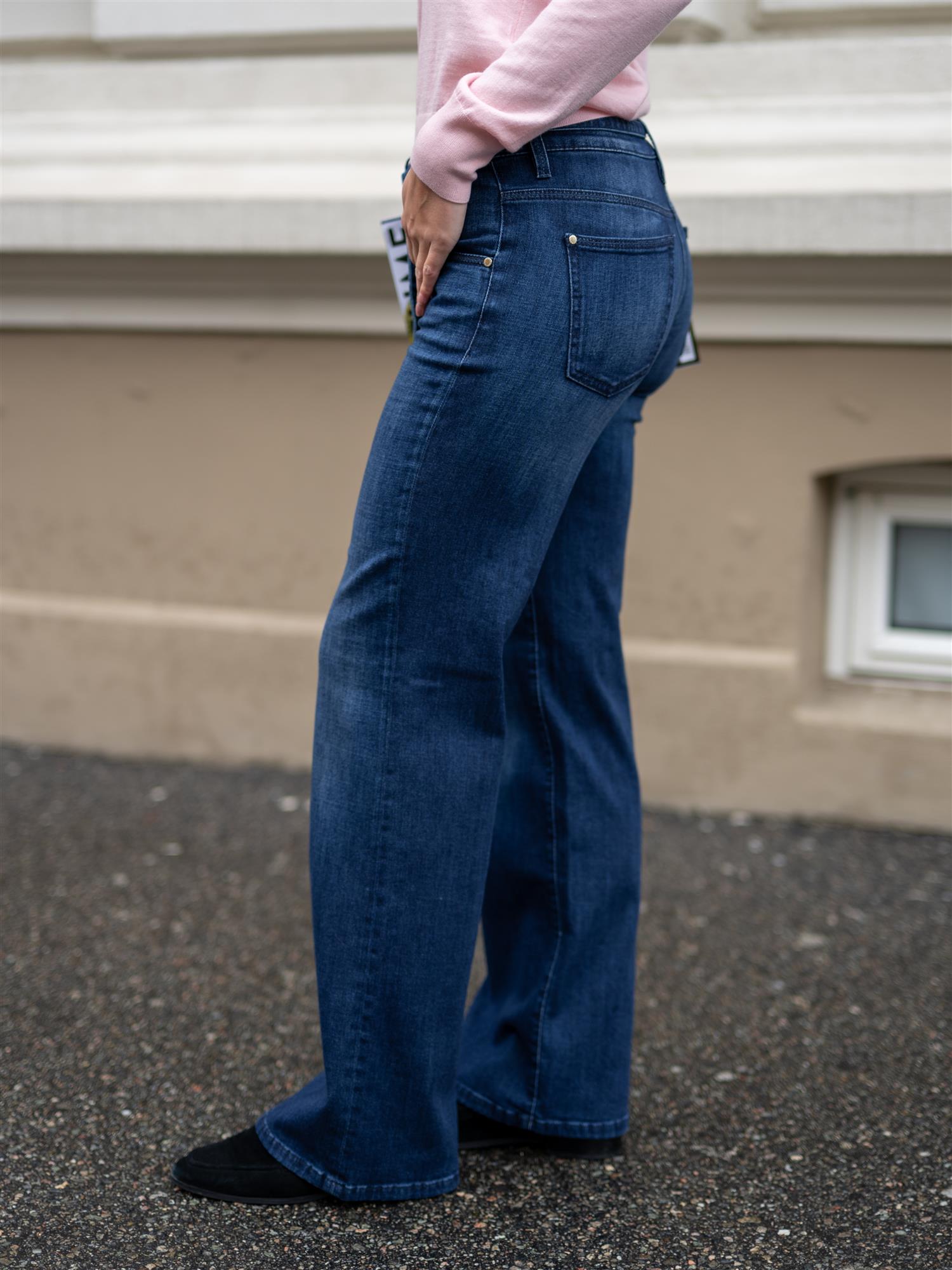En bestselgende jeans fra Cambio i blå. Tess er kjent for sin flatterende passform med rette, vide ben og normal høyde i livet. Denne modellen kommer med et tilhørende smalt belte i samme stoff som er med på å gjøre buksen unik. Tess har lommer både foran og bak. God stretch.