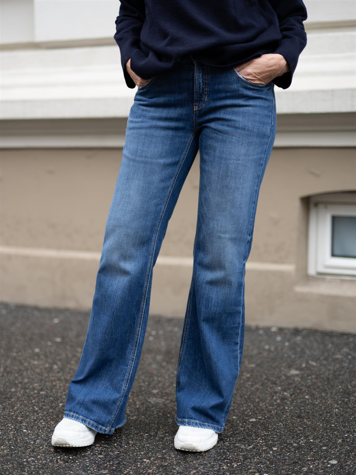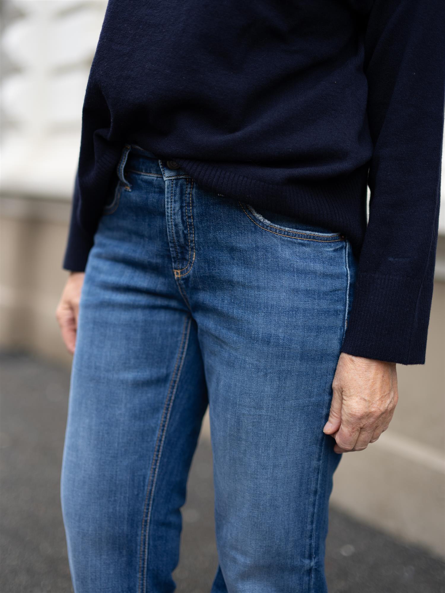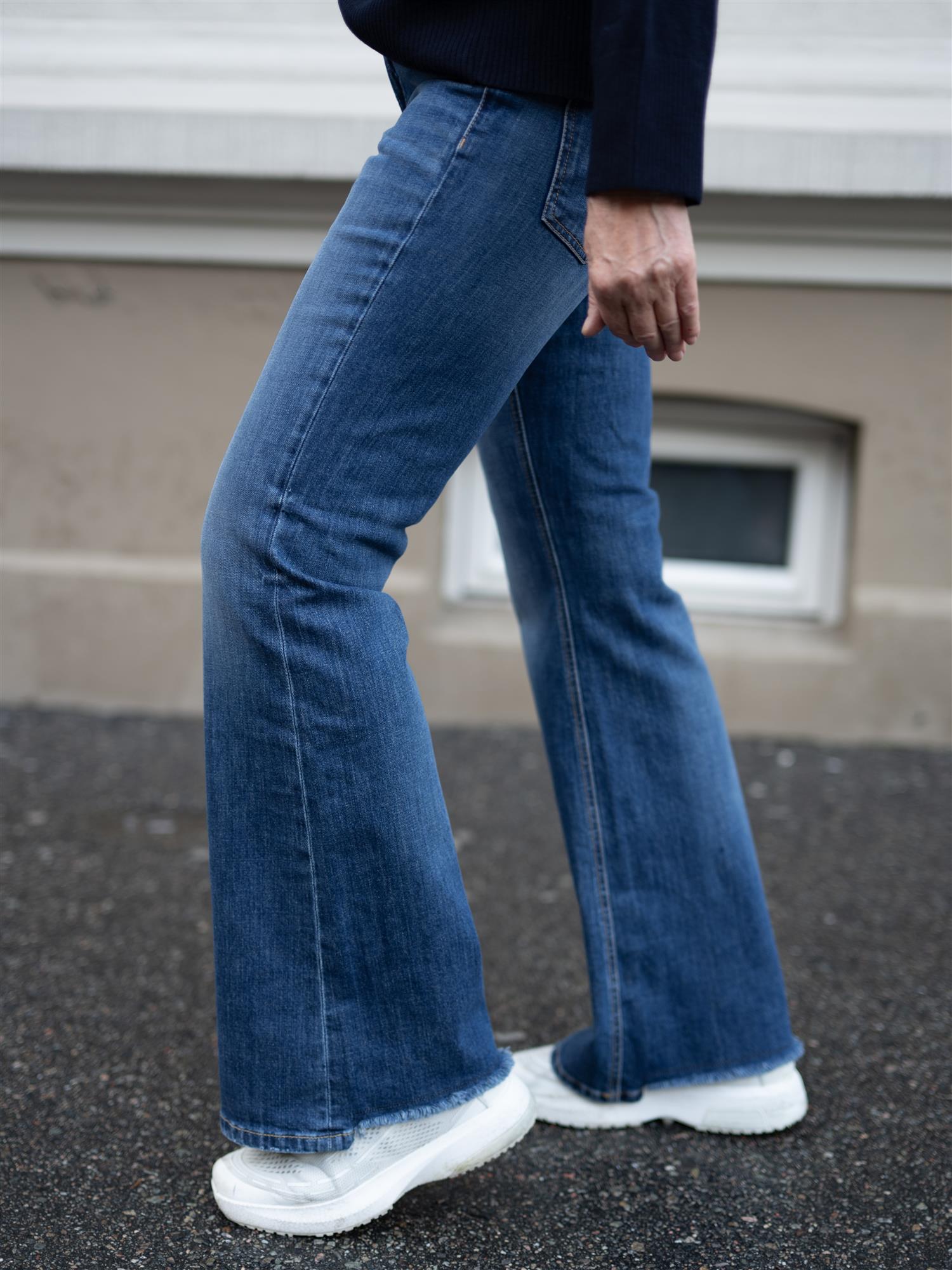 Sesongens kuleste bukser. Jeans med det lille ekstra fra Cambio. Buksen er designet med sleng fra kneet og ned, sammen med en avkappet bunn på baksiden som både er en kul og genial detalj: du slipper å tråkke på buksen. Fabienne har lommer både foran og bak, og har normal høyde i livet.