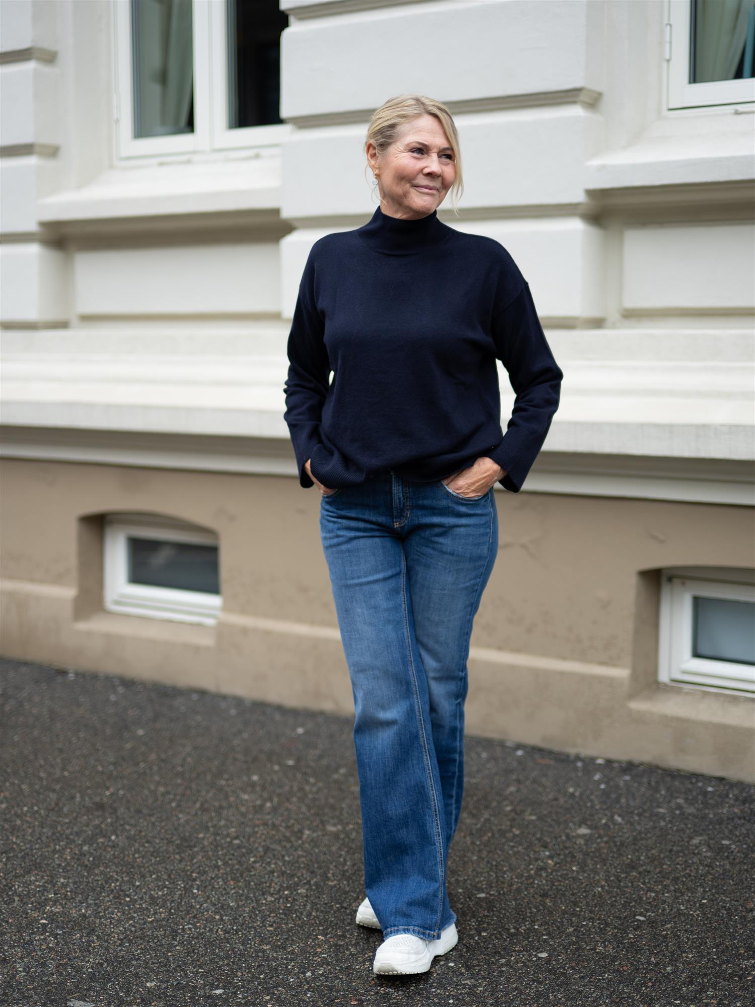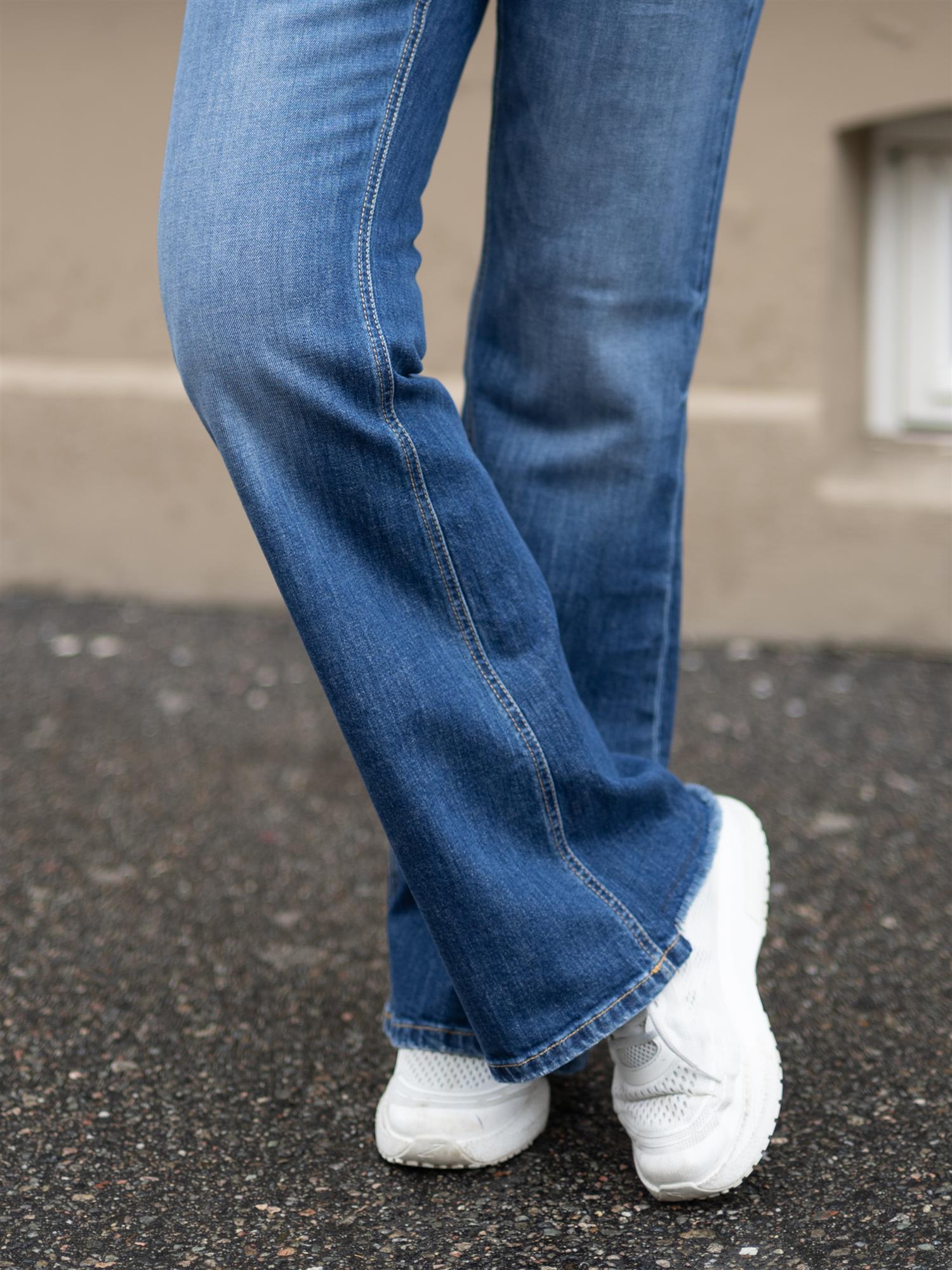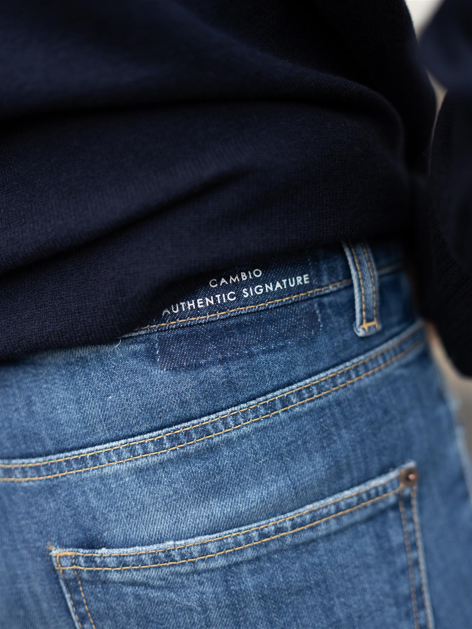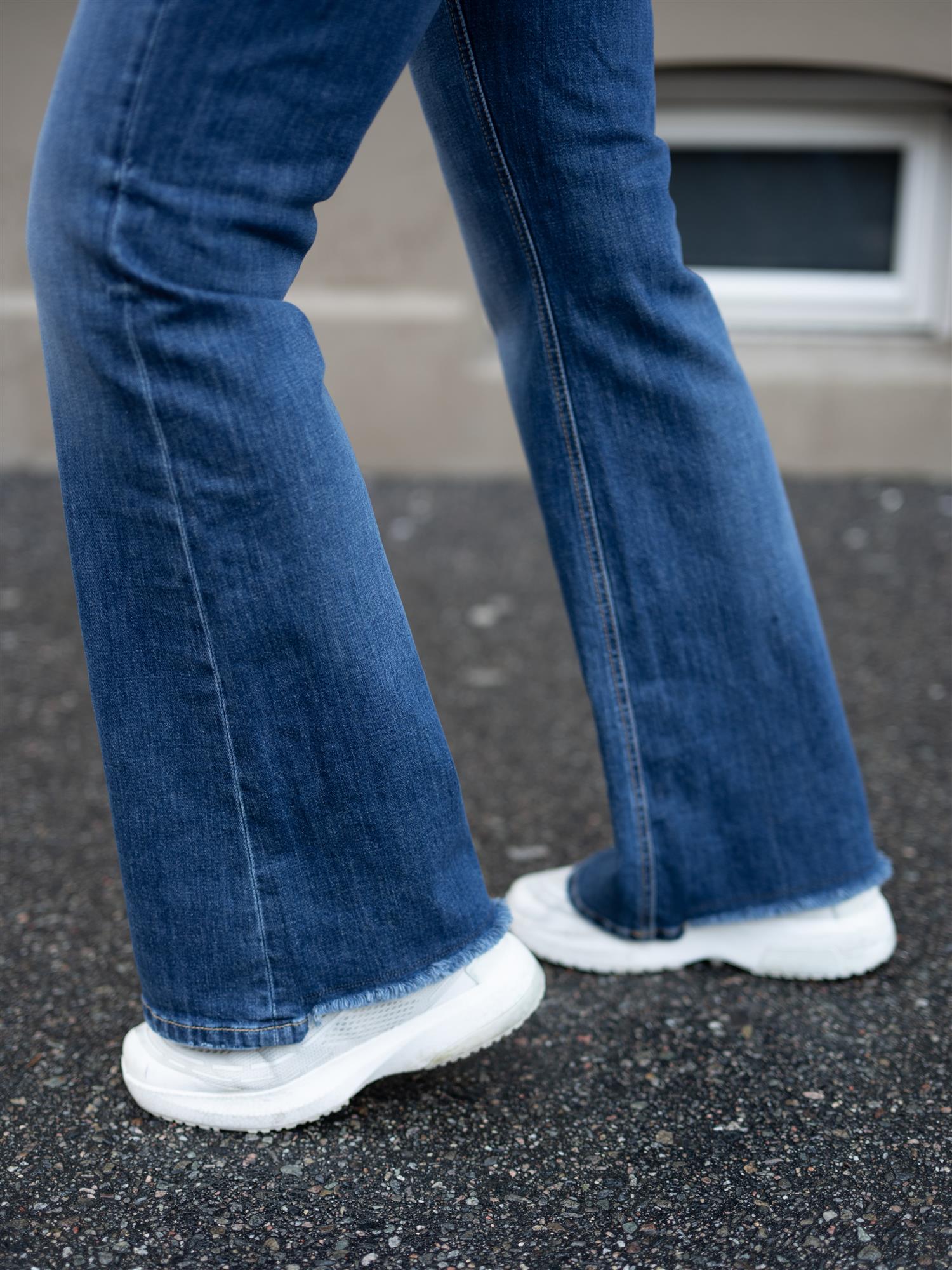 Sesongens kuleste bukser. Jeans med det lille ekstra fra Cambio. Buksen er designet med sleng fra kneet og ned, sammen med en avkappet bunn på baksiden som både er en kul og genial detalj: du slipper å tråkke på buksen. Fabienne har lommer både foran og bak, og har normal høyde i livet.