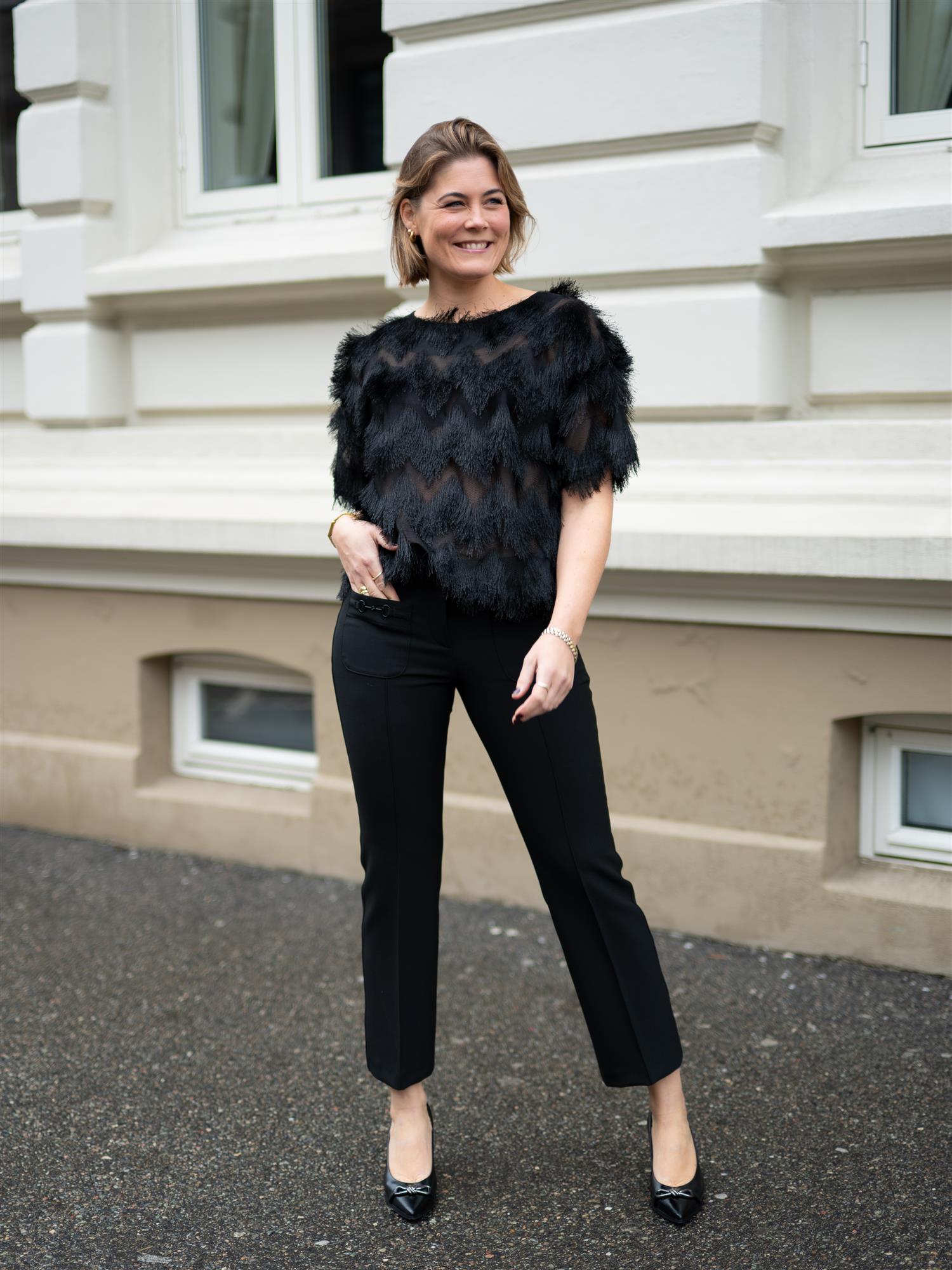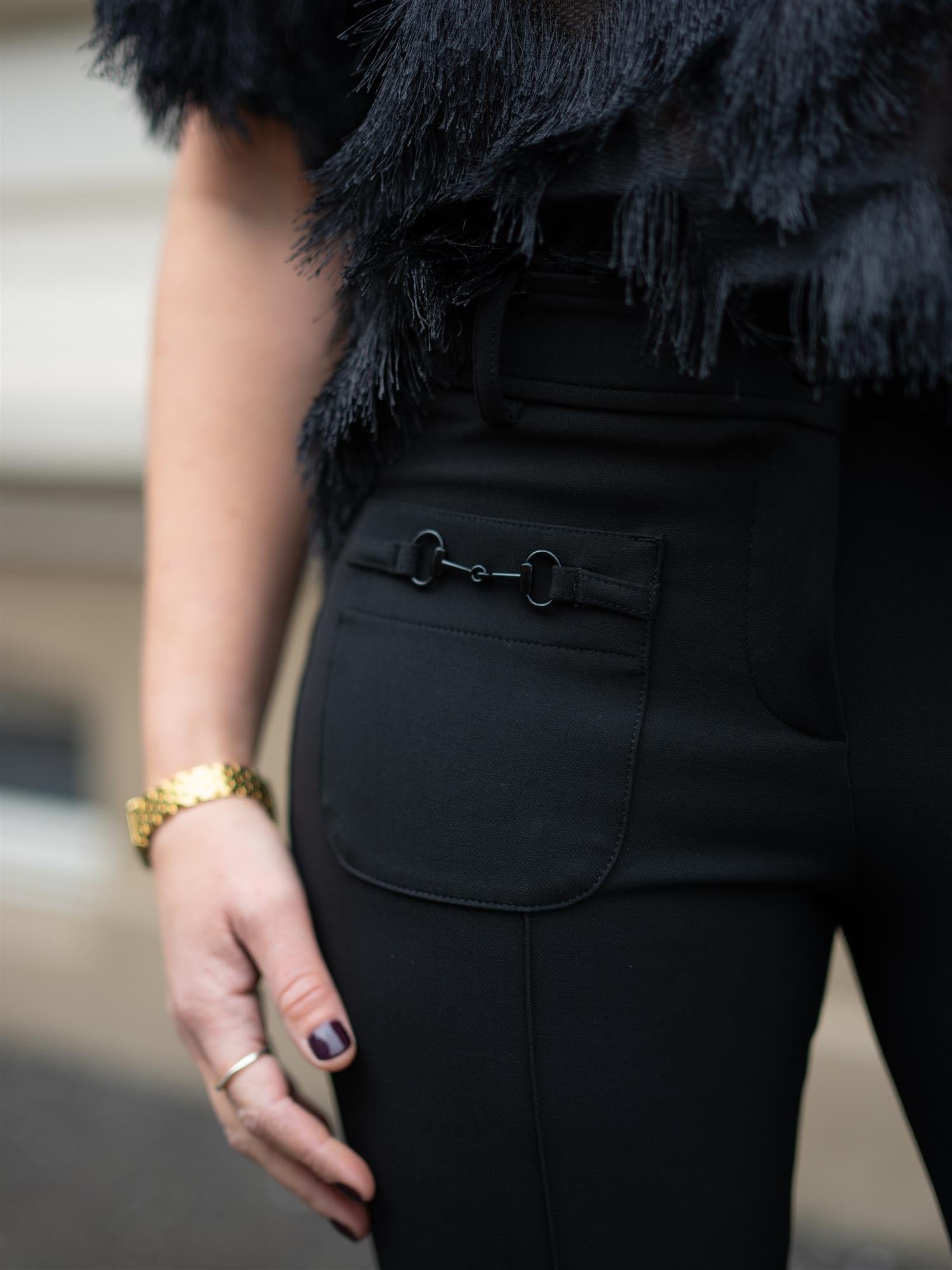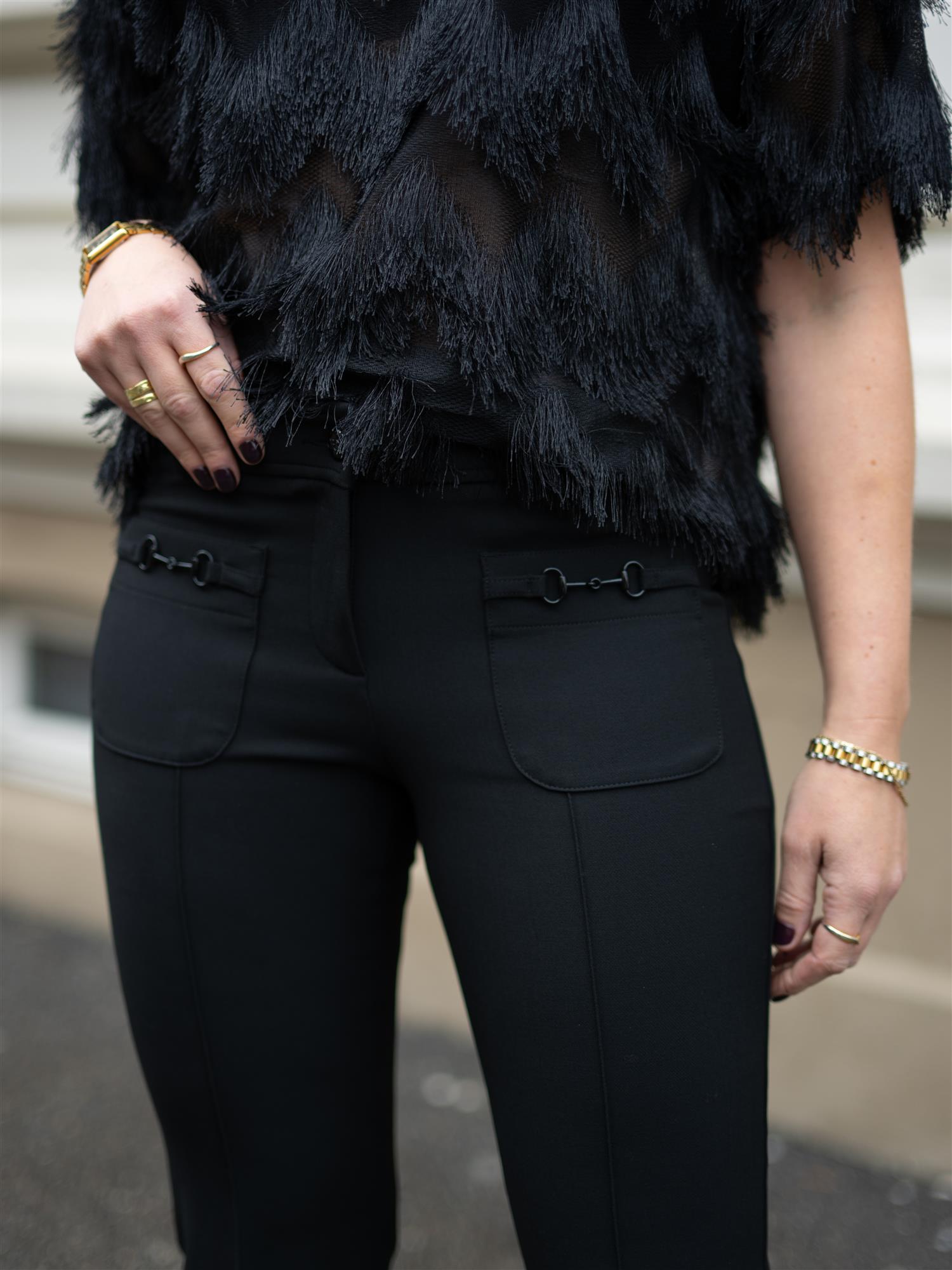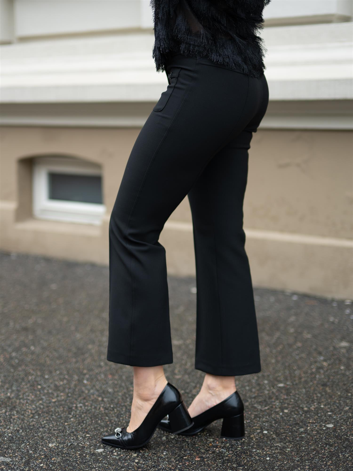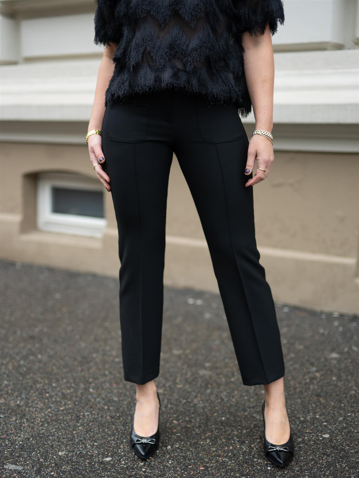Sorte ankelkorte bukser fra Cambio med stilige detaljer. Buksen er designet med lappede lommer i front med spenne på. Markerte sømmer bak for fremhevede feminine former. Farah er ettersittende i lårene, og svinger ut fra kneet og ned. God stretch. Hemper for belte i midjen.