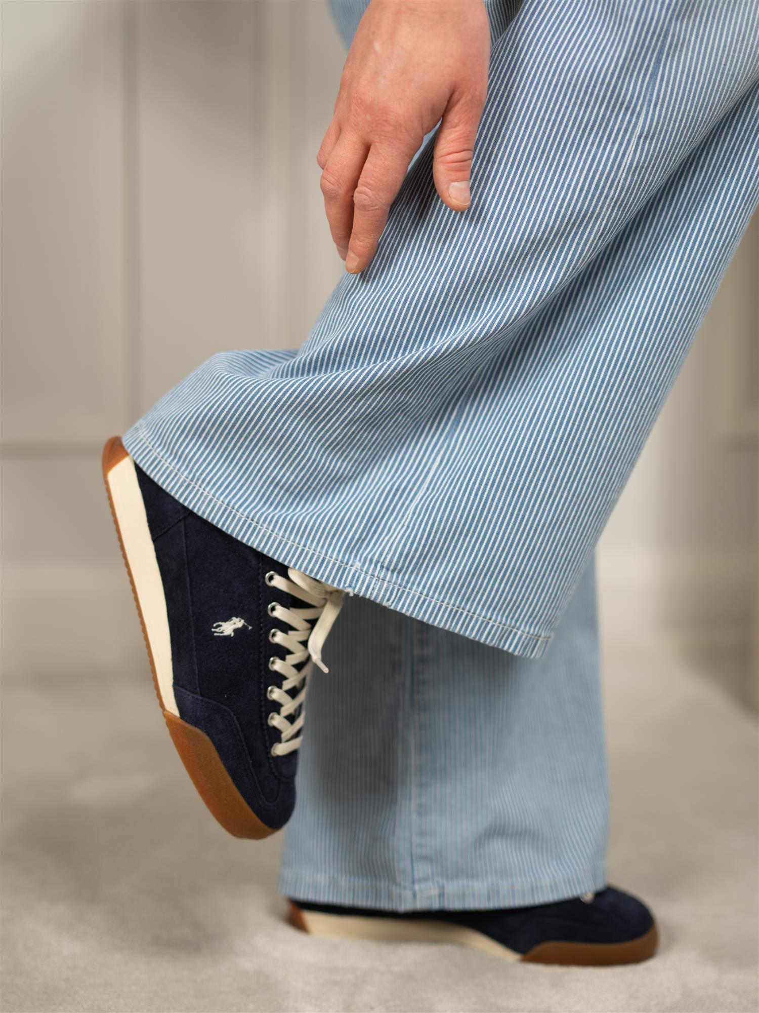 Blå bukse fra Denim Studio med hvite striper. Buksen har høy midje og vide ben. Lommer både foran og bak, samt hemper for belte i midjen.