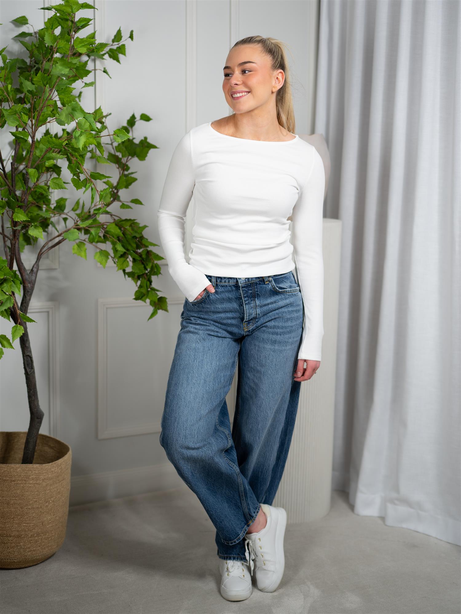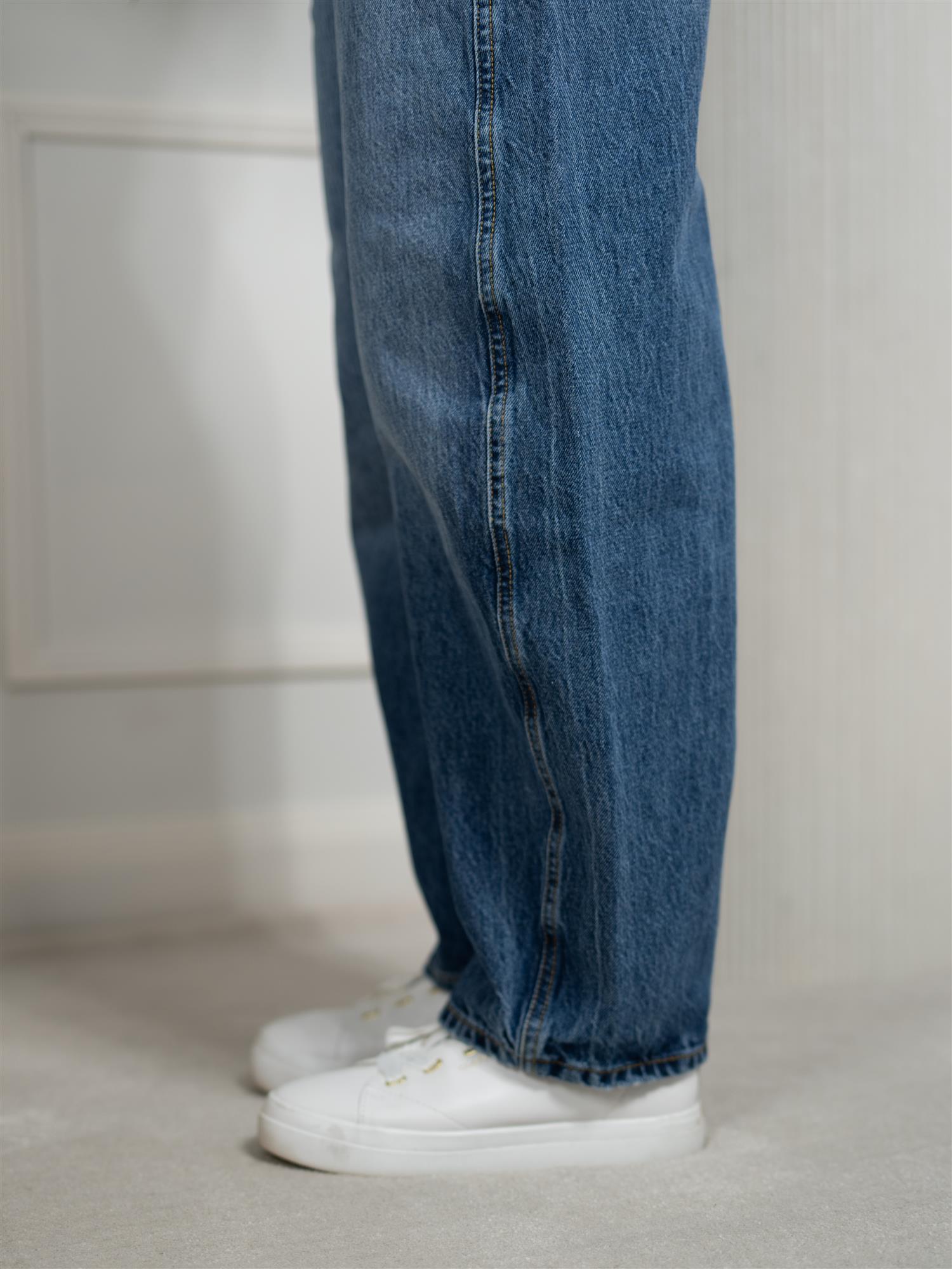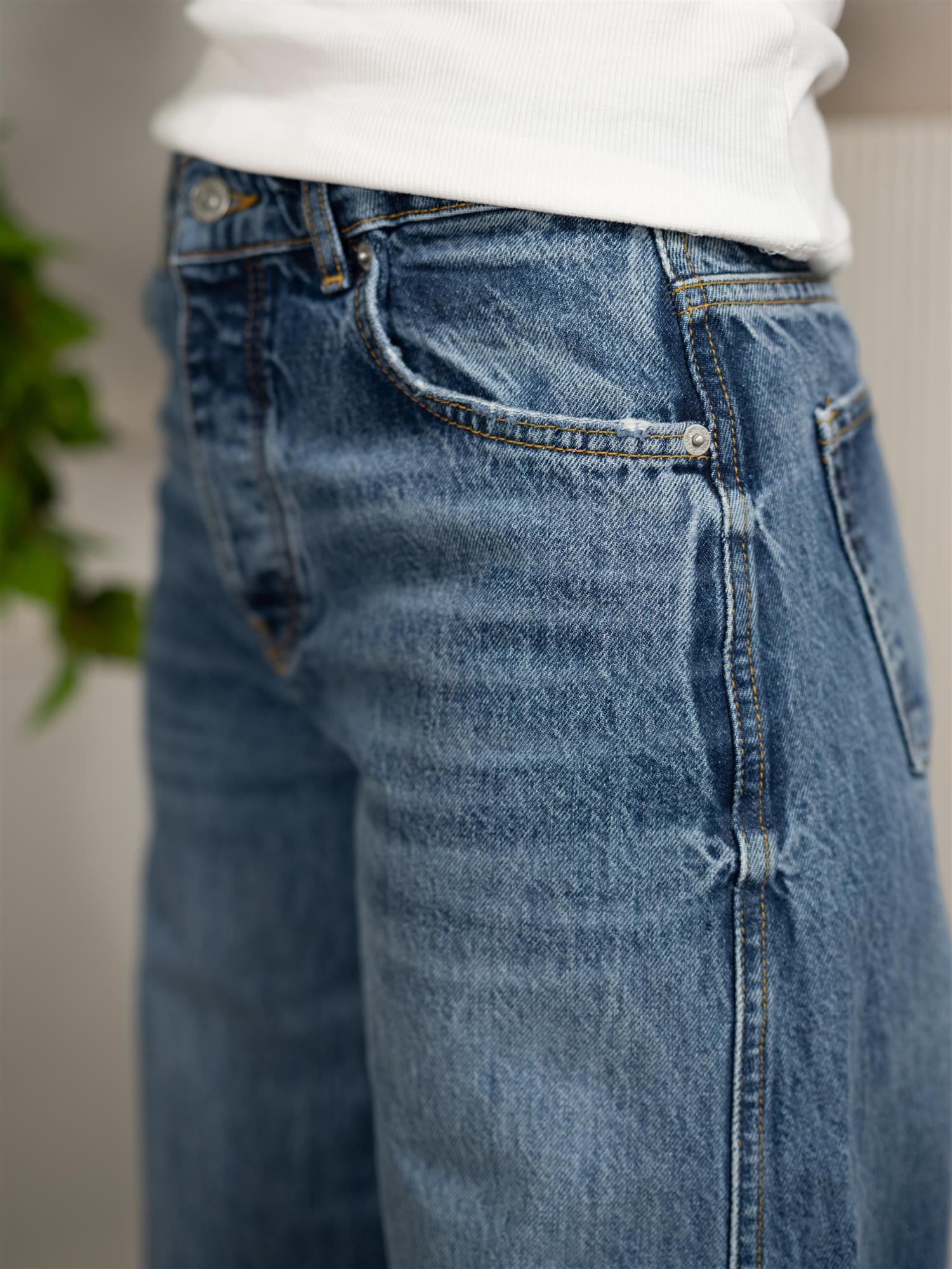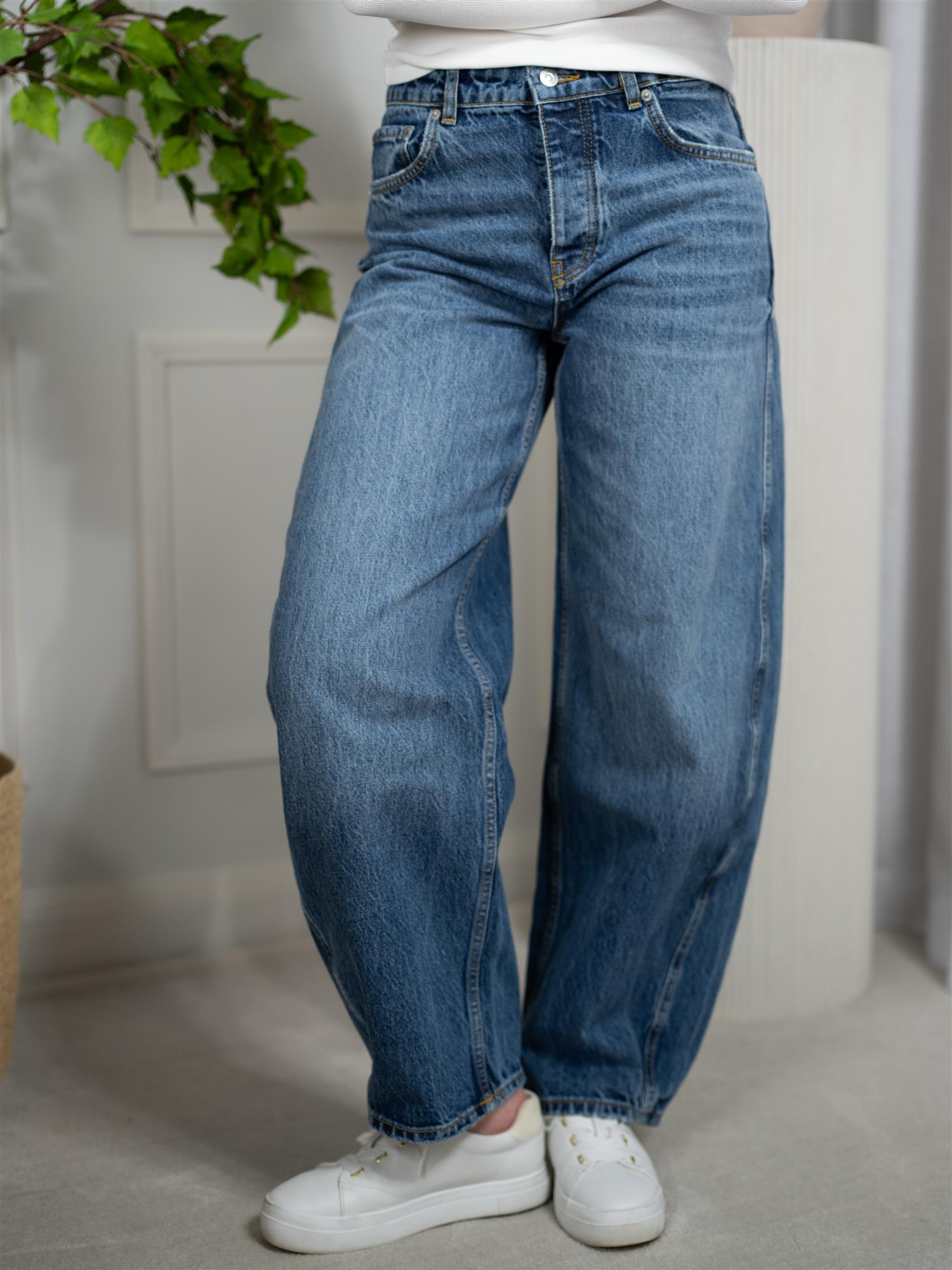 Ballongformede jeans fra Camilla Pihl i vasket mørk blå farge. Buksen er medium høy på livet. Lommer både foran og bak, samt hemper for belte i midjen. Ankelkort lengde. Lukkes med knapper i front.