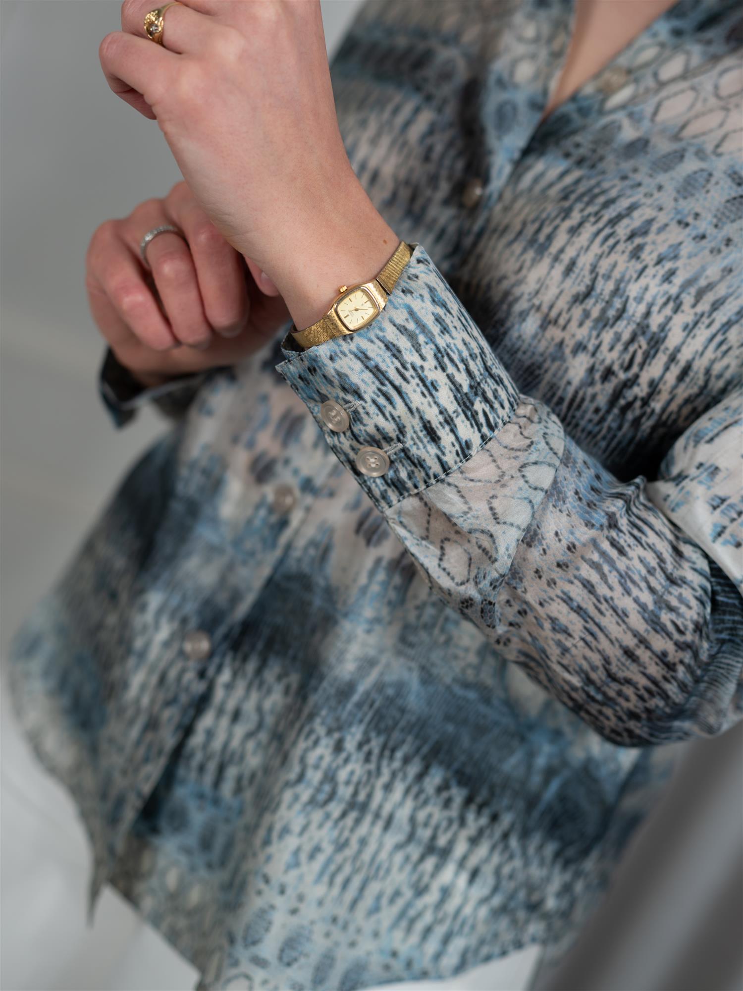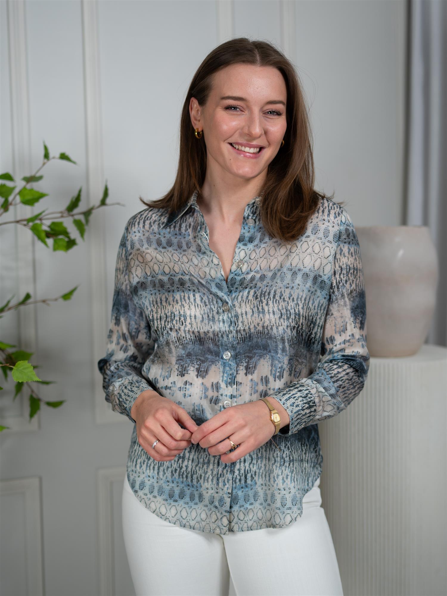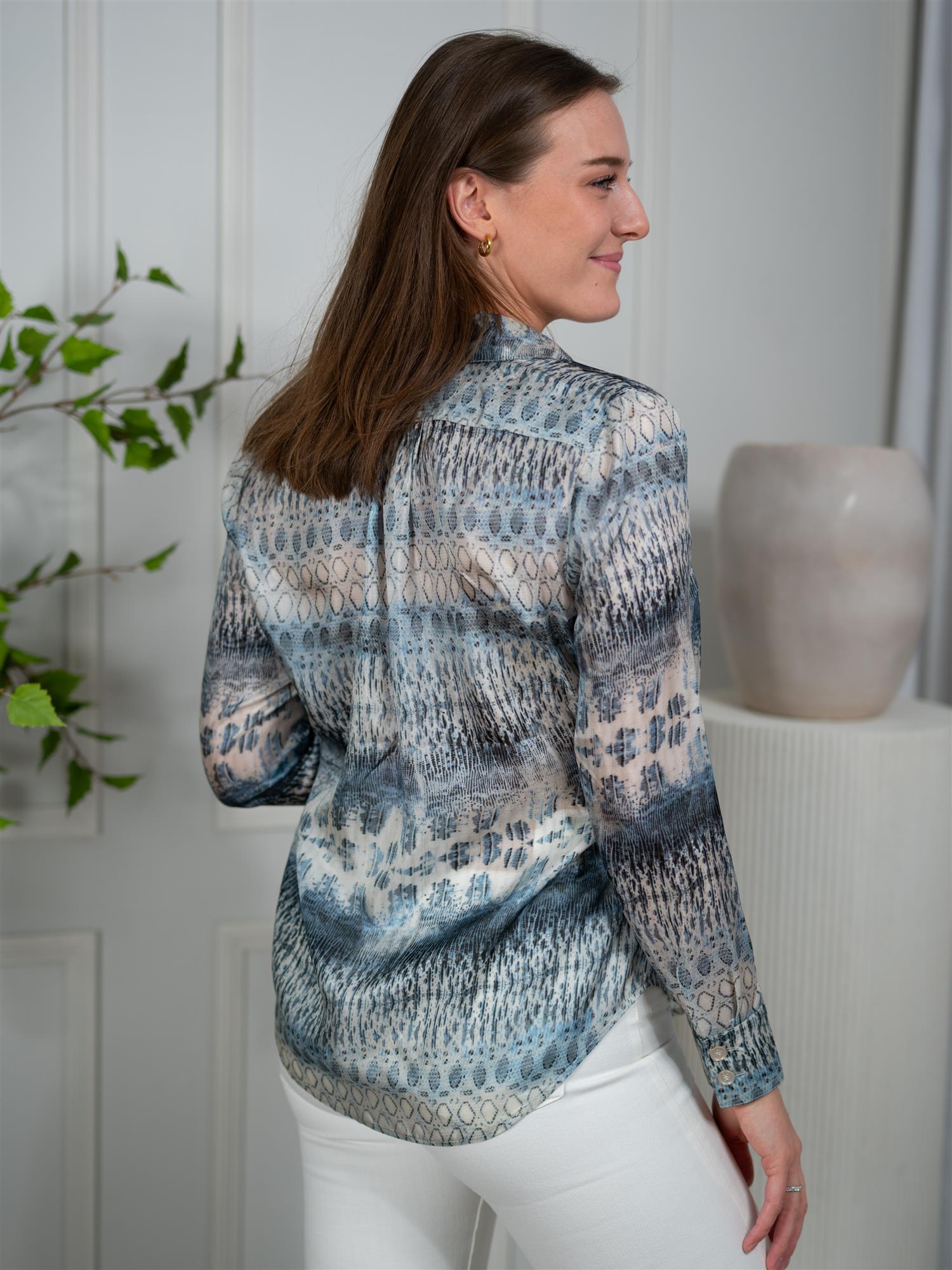 Silkeskjorte i blått print fra Sand. Skjorten er rett og vid i modellen med krage og knapper i hvitt. Silkekvaliteten gjør den lett og behagelig på. Fin til både hverdags, men også til finere anledninger.