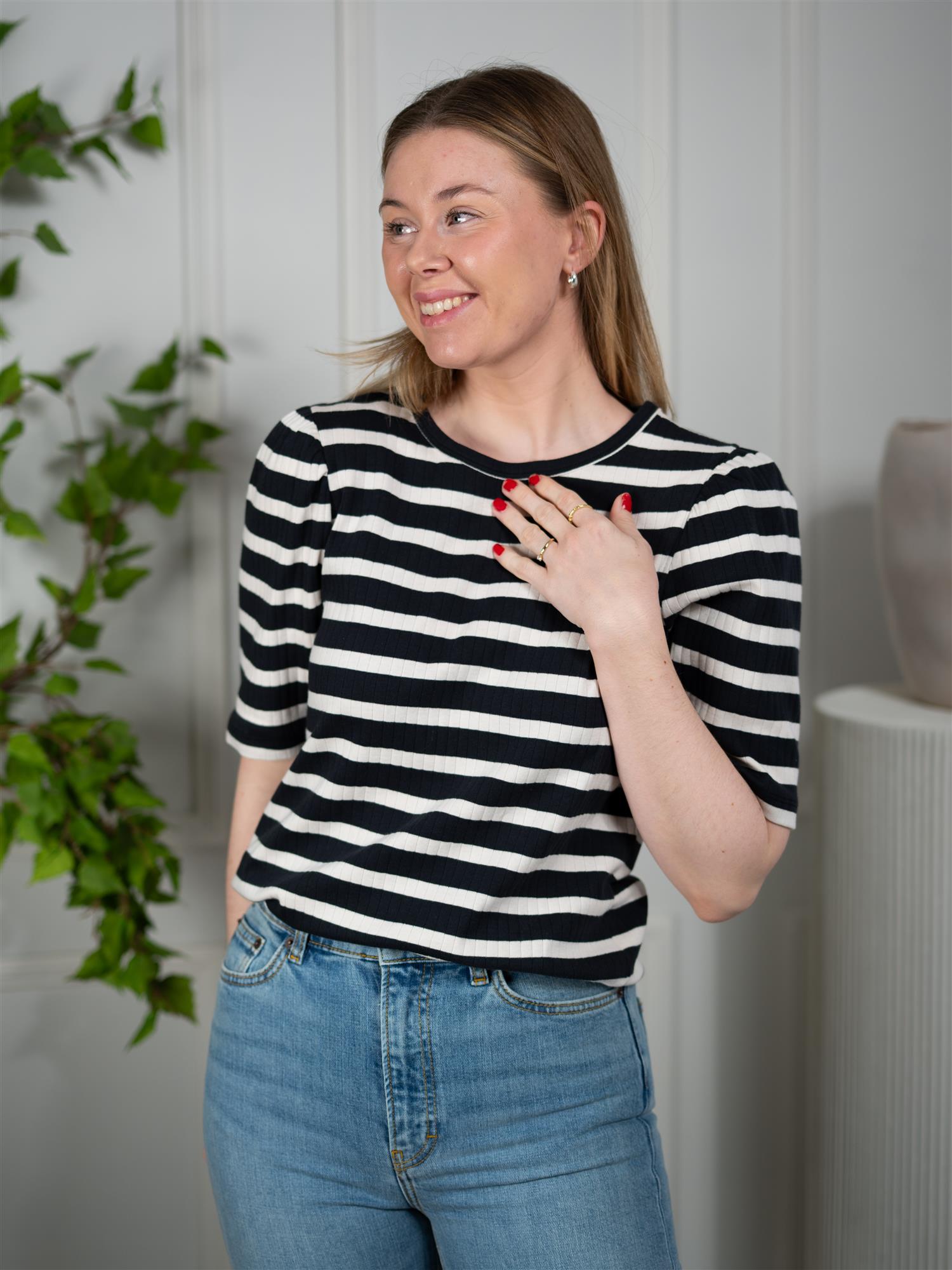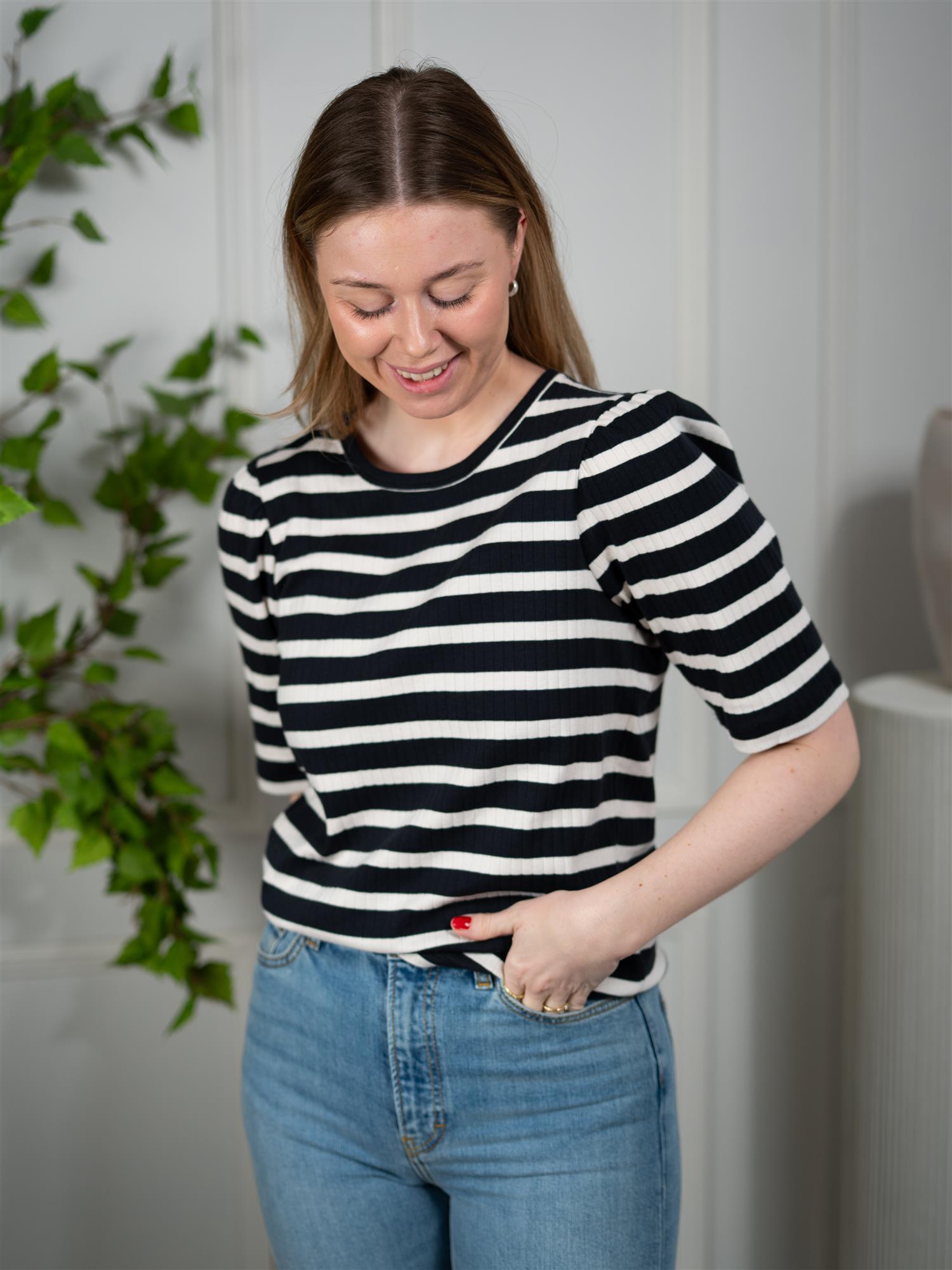 Stripete T-skjorte fra Munthe i hvit og sort. Jikolaz har puffede skuldre og normal lengde. T-skjorten er designet med rund hals og lav skuldersøm.