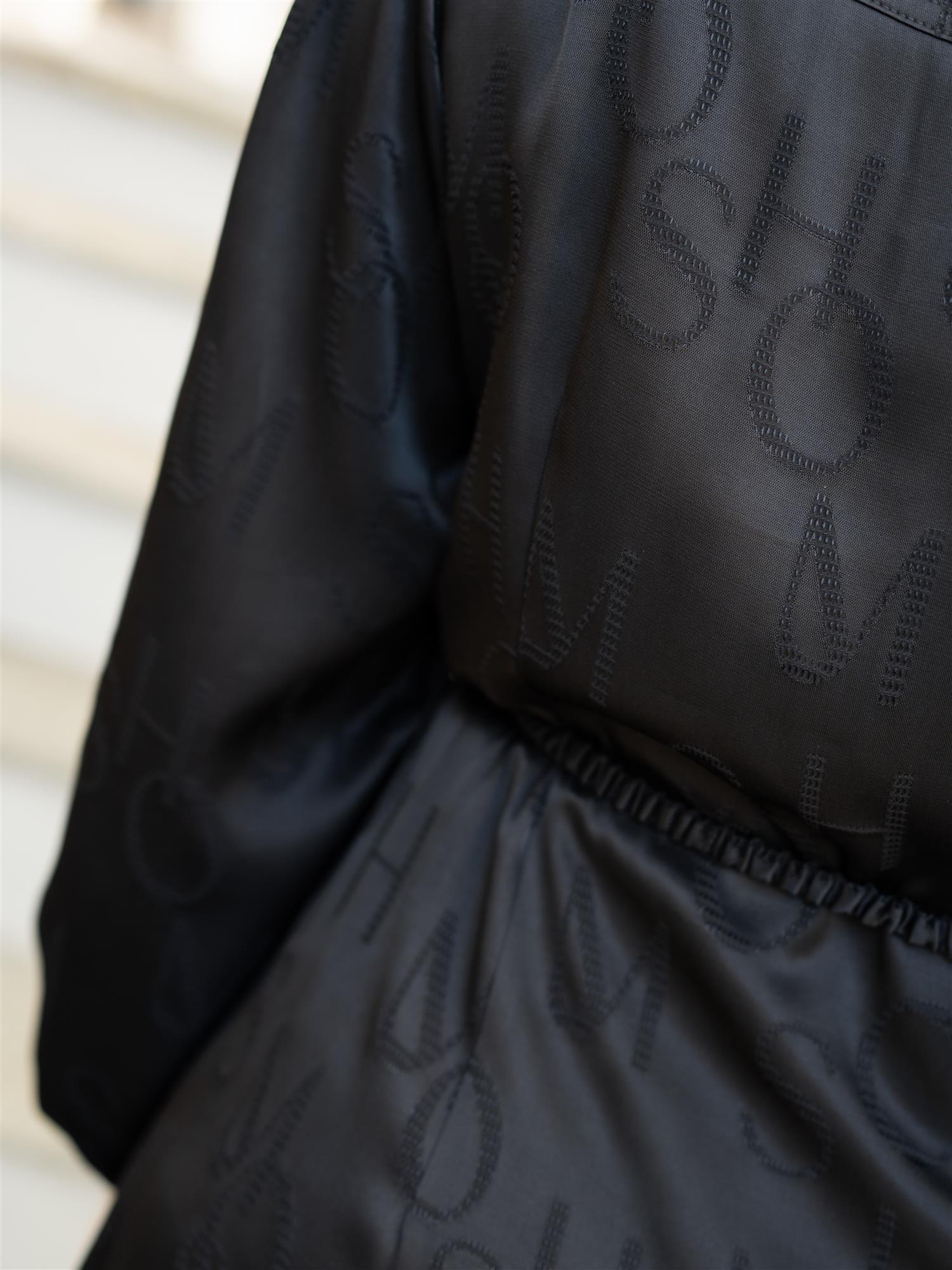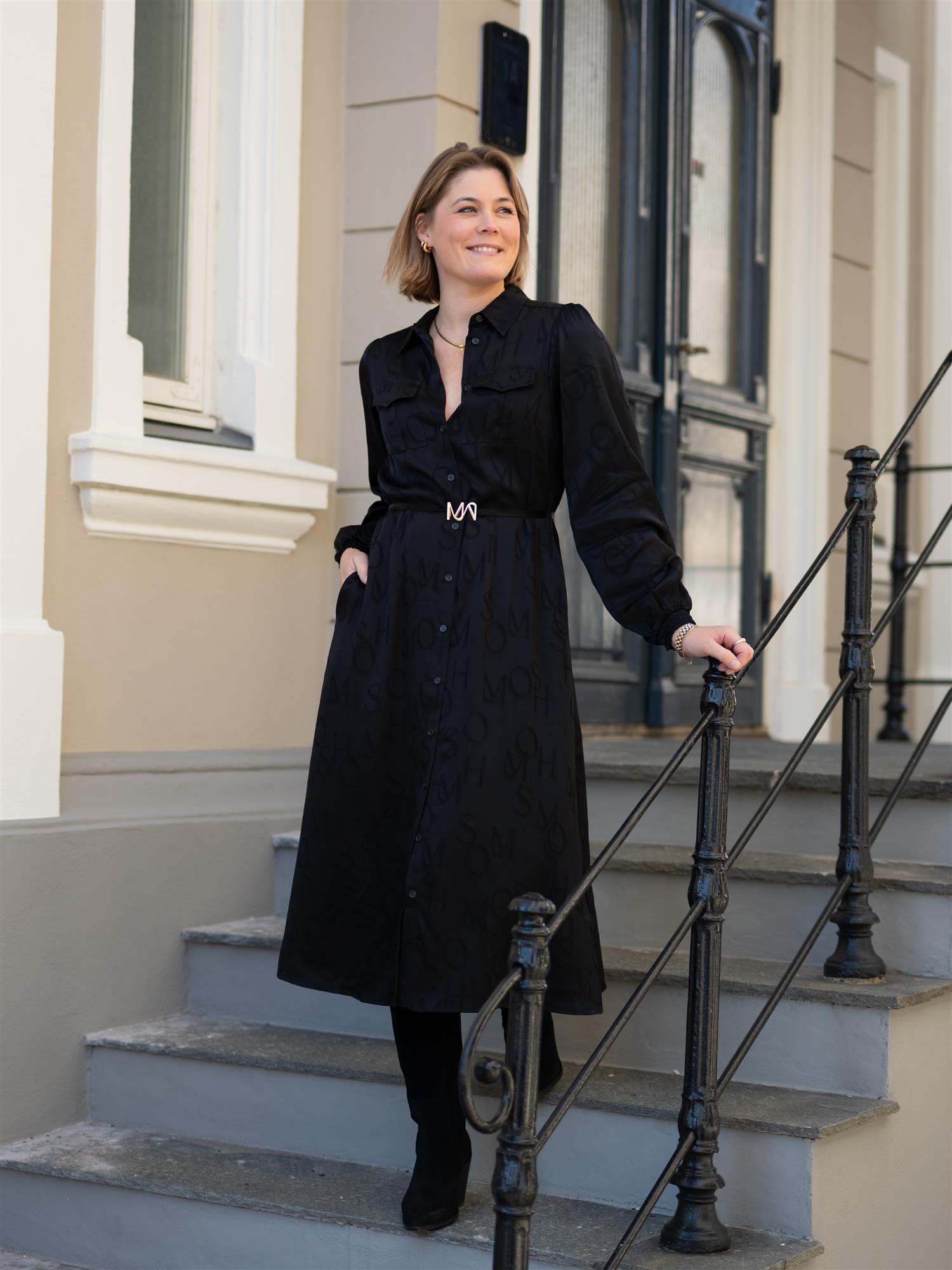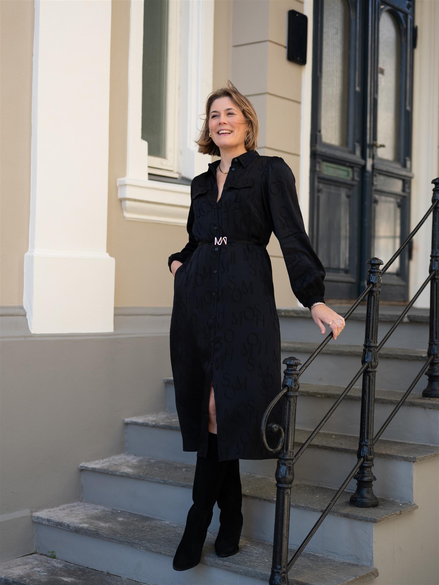 Lekker kjole fra Mos Mosh i sort. Kjolen har ton-i-ton monogram print med brystlommer i front, stikklommer i sidene og elastiske mansjetter. Det er knepping hele veien foran, og liten splitt på begge sider. Det følger også med et smalt belte med gullspenne på.