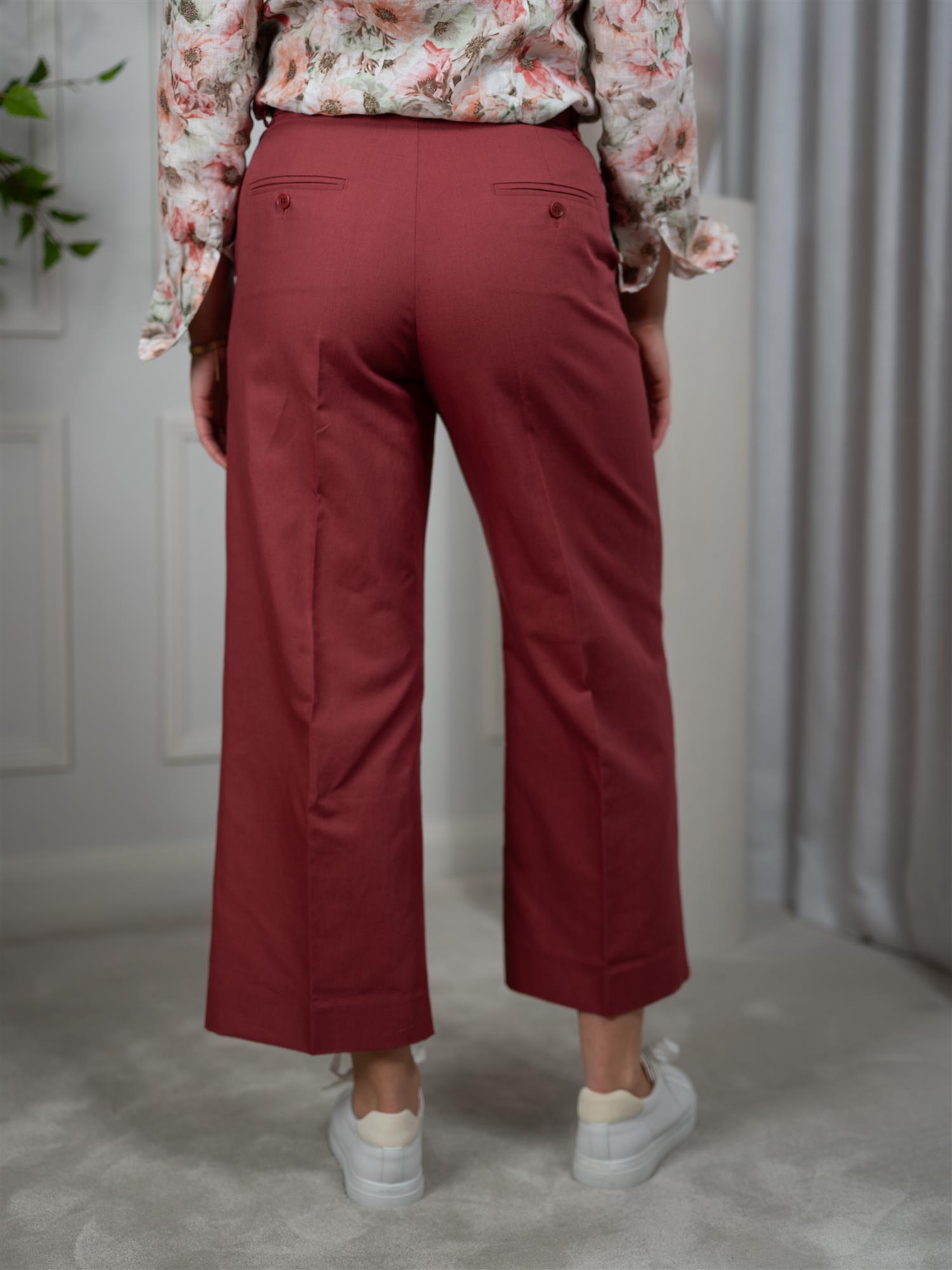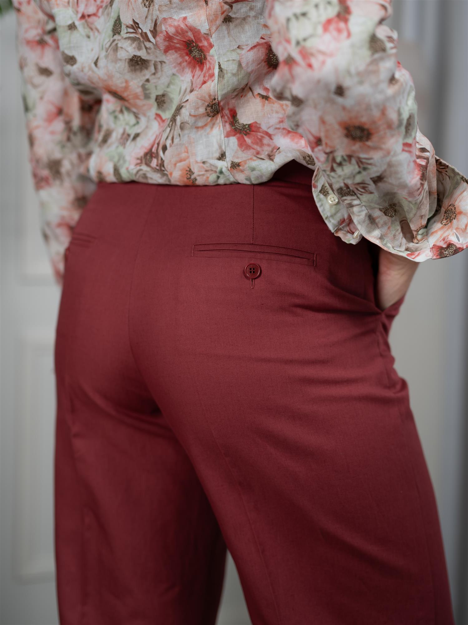 Røff bukse i en deilig lin og bomullsblanding. Buksen har en frisk, men samtidig dus rød farge som gir buksen det lille ekstra. Den er høy i livet, rett og vid i beinene. Fin til lyse enkle overdeler!