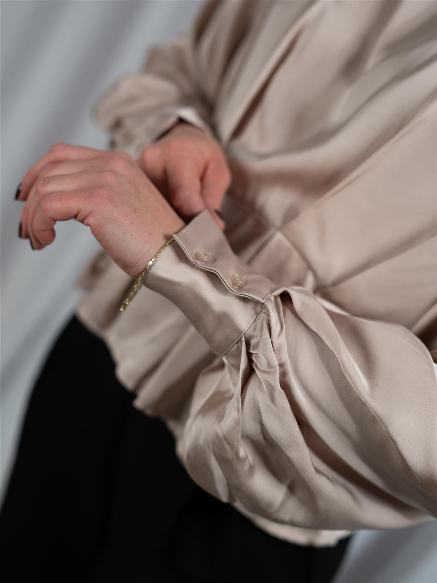 Delikat bluse fra ONE and OTHER i lekker dus champagne-rosa farge. Blusen har en lekker drapering med peplum-form. Det er rund hals i tillegg til ballongermer som gir et elegant uttrykk. Skjult glidelås-åpning bak.
