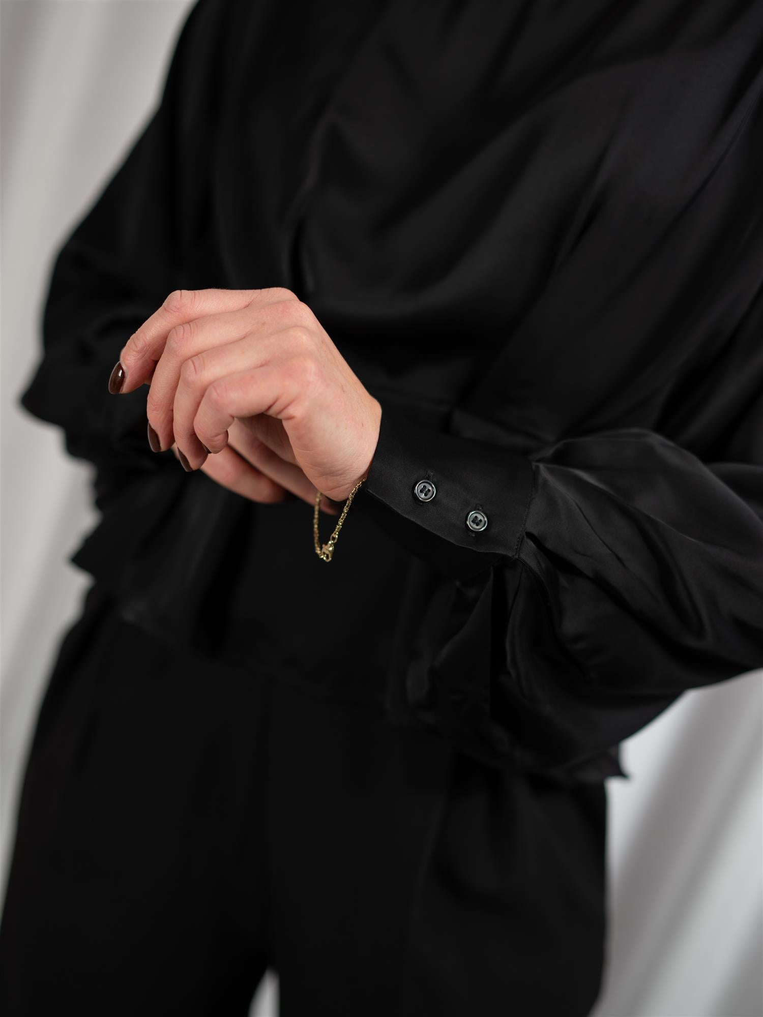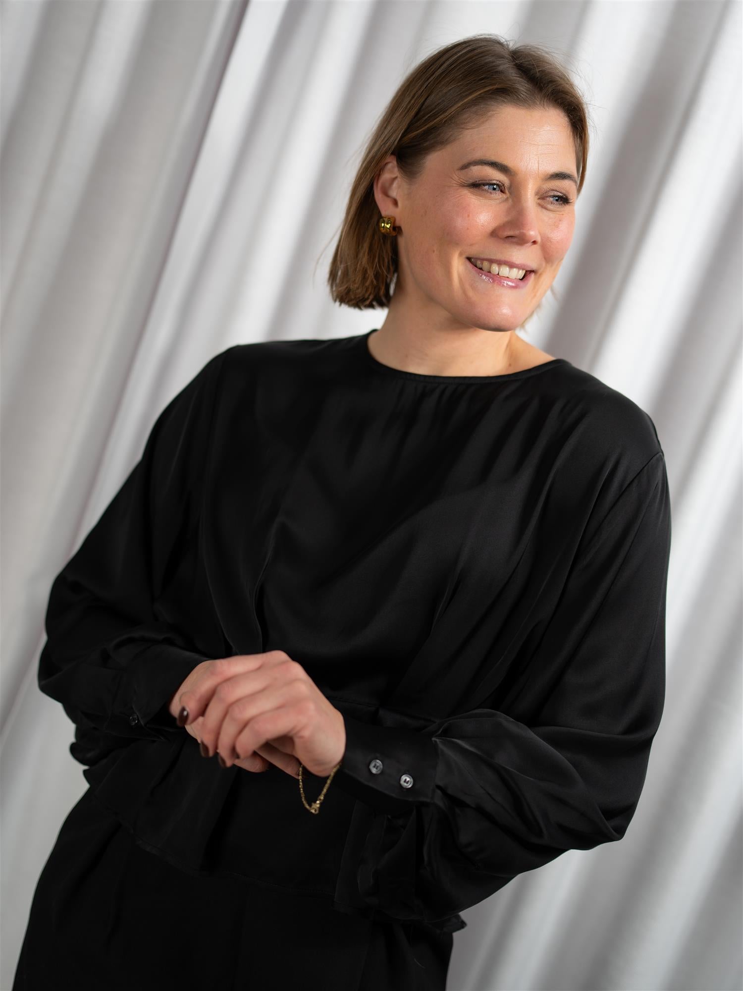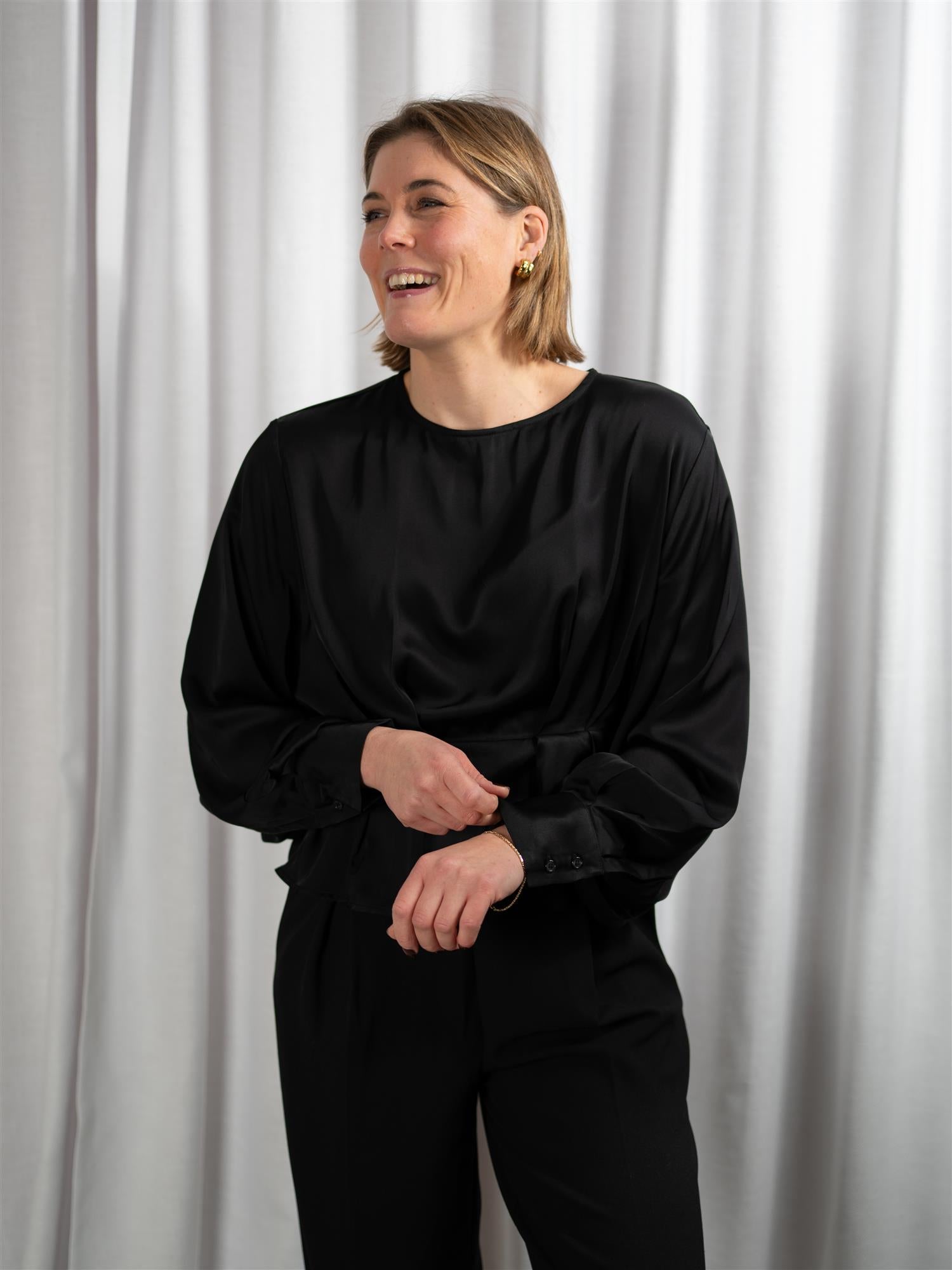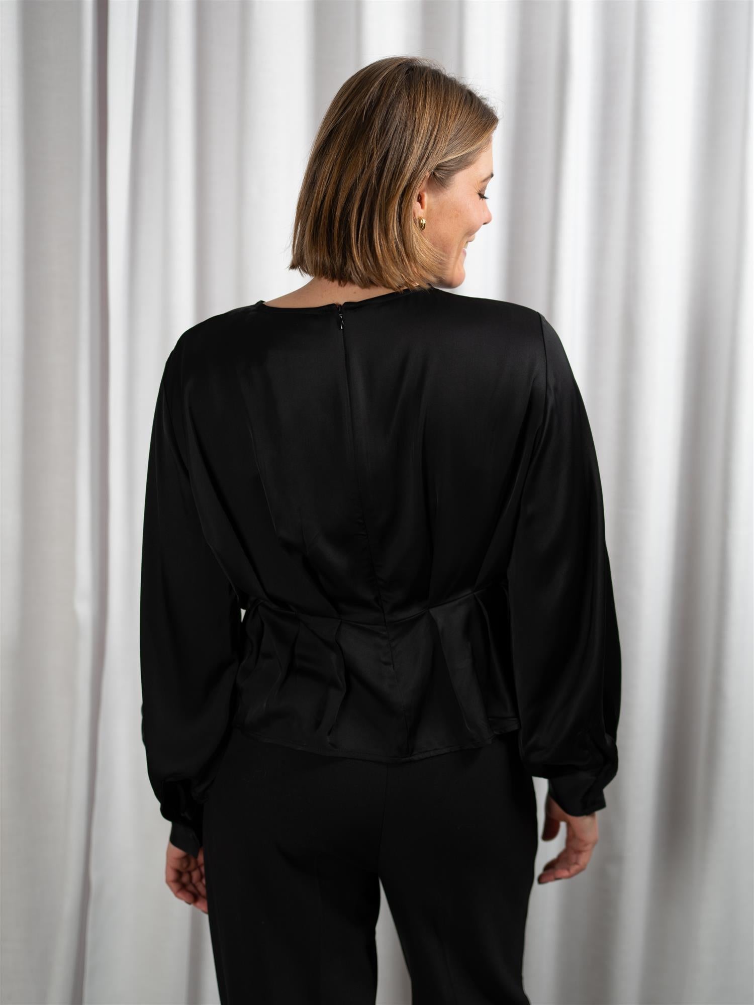 Delikat bluse fra ONE and OTHER i klassisk sort. Blusen har en lekker drapering med peplum-form. Det er rund hals i tillegg til ballongermer som gir et elegant uttrykk. Skjult glidelås-åpning bak.