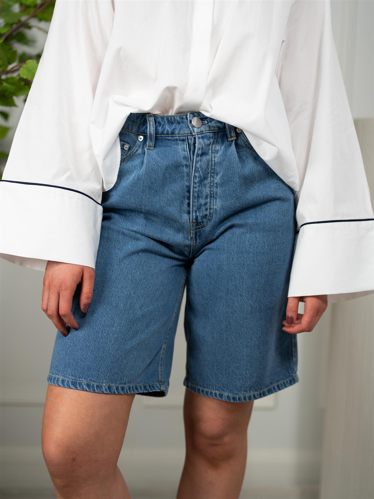 Shortsen har et klassisk femlommersdesign, beltehemper i linningen og lukkes med knapp og glidelås i front. Den tidløse denimvasken gjør den enkel å style til sesongens garderobe. Perfekt å kombinere med en enkel T-skjorte, en lett topp eller en skjorte for et stilrent og kledelig sommerantrekk.