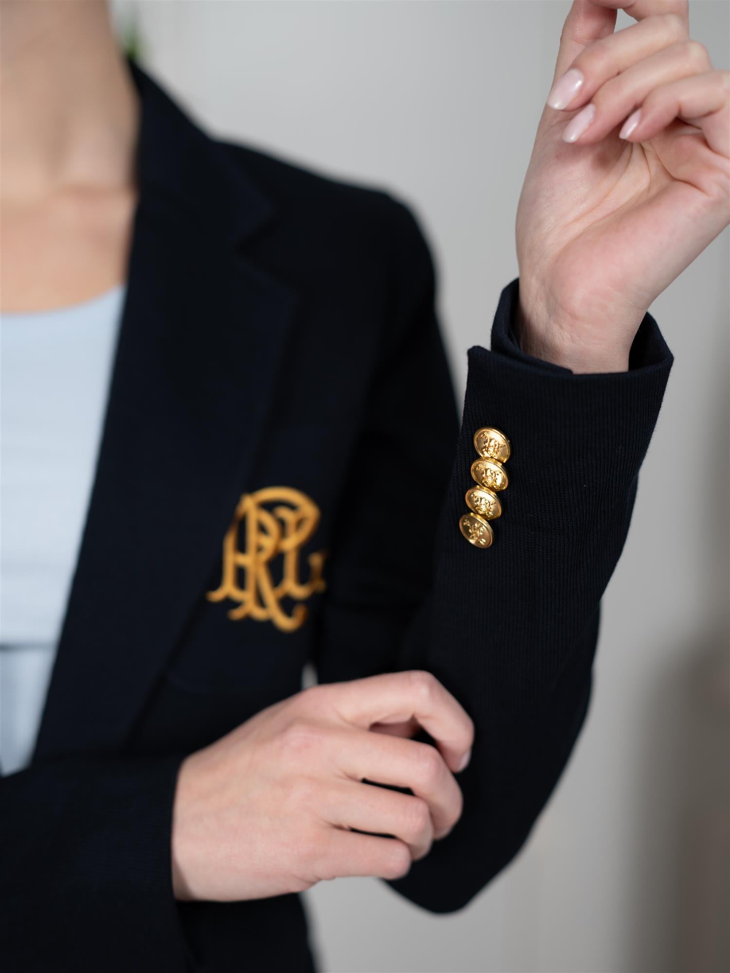 En stilren og moderne blazer i en dyp marineblå farge. Klassisk feminin fasong med splitt bak. Store lommer foran, brystlomme med Polo Ralph Lauren logo, og gullknapp som lukking foran.
