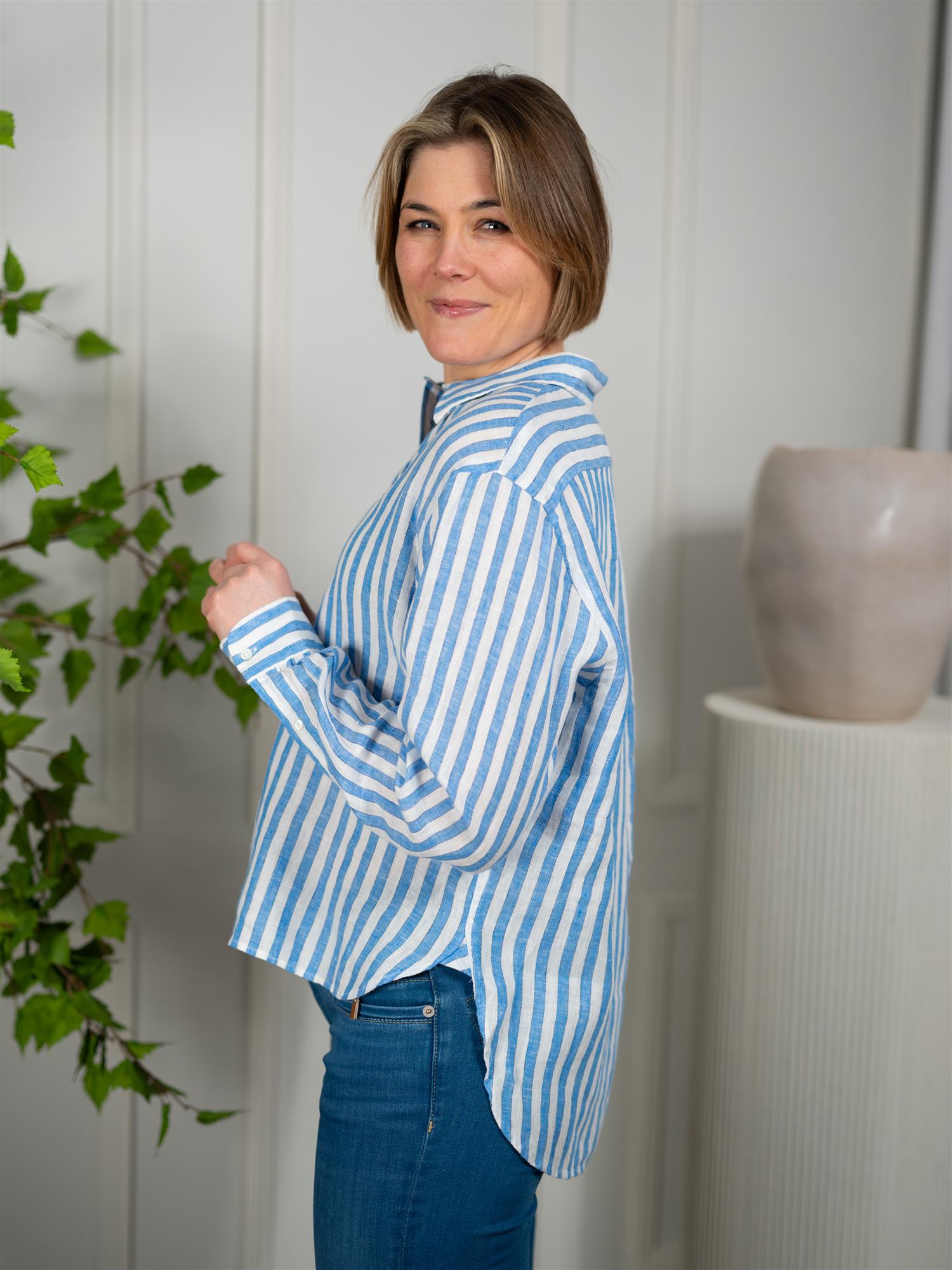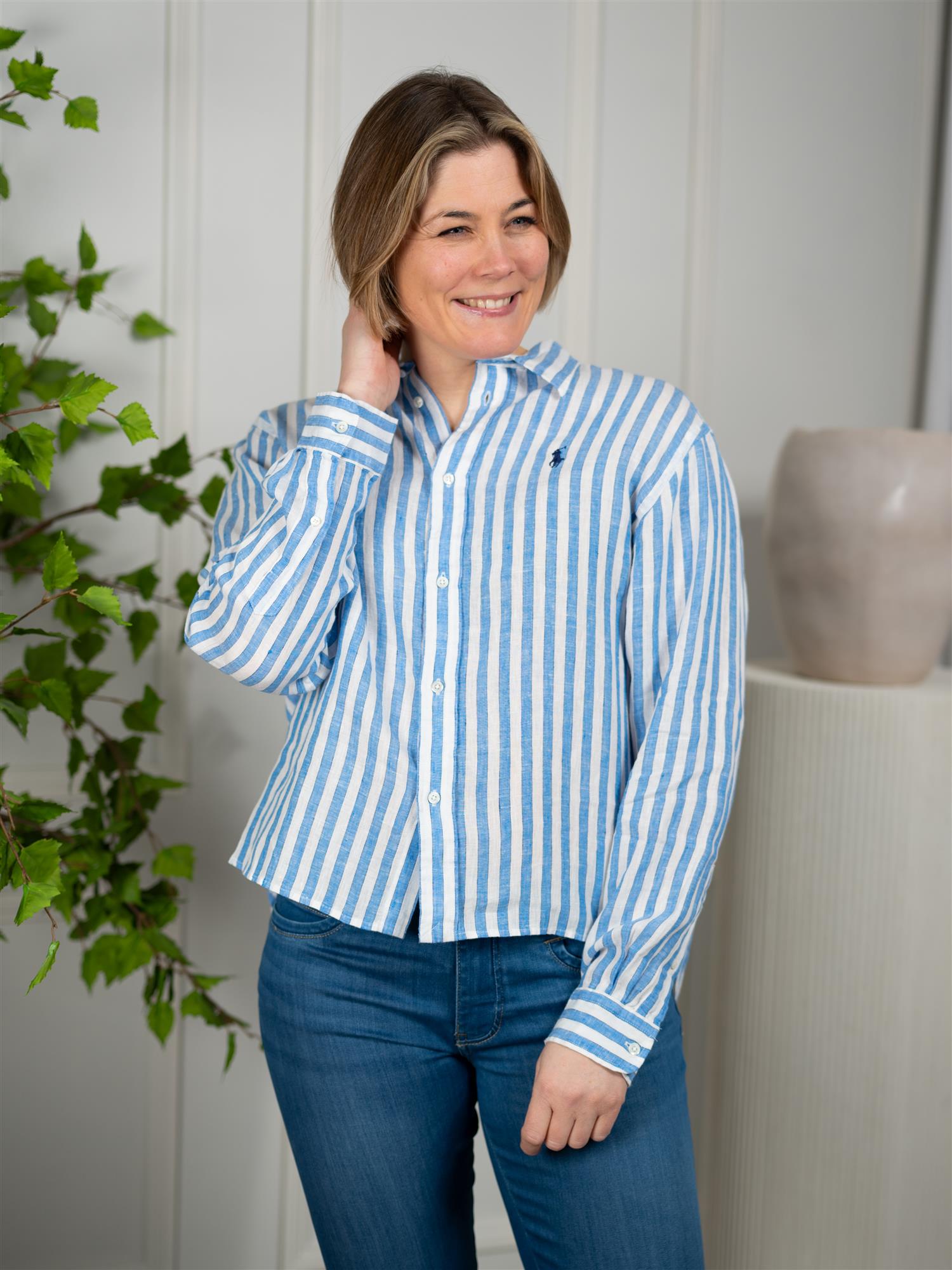 Stripet skjorte fra Polo i 100% lin, noe som gir en lett og pustende følelse, perfekt for varme dager. Denne skjorten kombinerer stil og komfort, og er ideell for en avslappet, men likevel elegant look. Designet med en klassisk hvit og blå kombinasjon som gir et friskt og stilrent uttrykk. Skjorten er kort i front og har en løs passform. Spiss krage, knappestolpe foran og vanlige mansjetter med knapp.