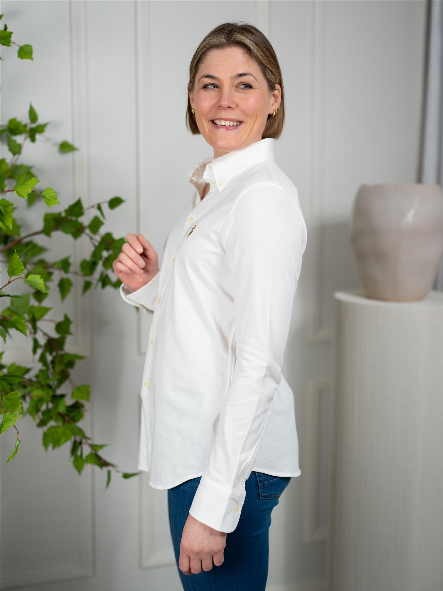 Denne skjorten er laget av 100% bomull, noe som gir en myk og behagelig følelse mot huden. Denne hvite skjorten er perfekt for en stilren og klassisk look, og kan enkelt styles for både hverdags og mer formelle anledninger.